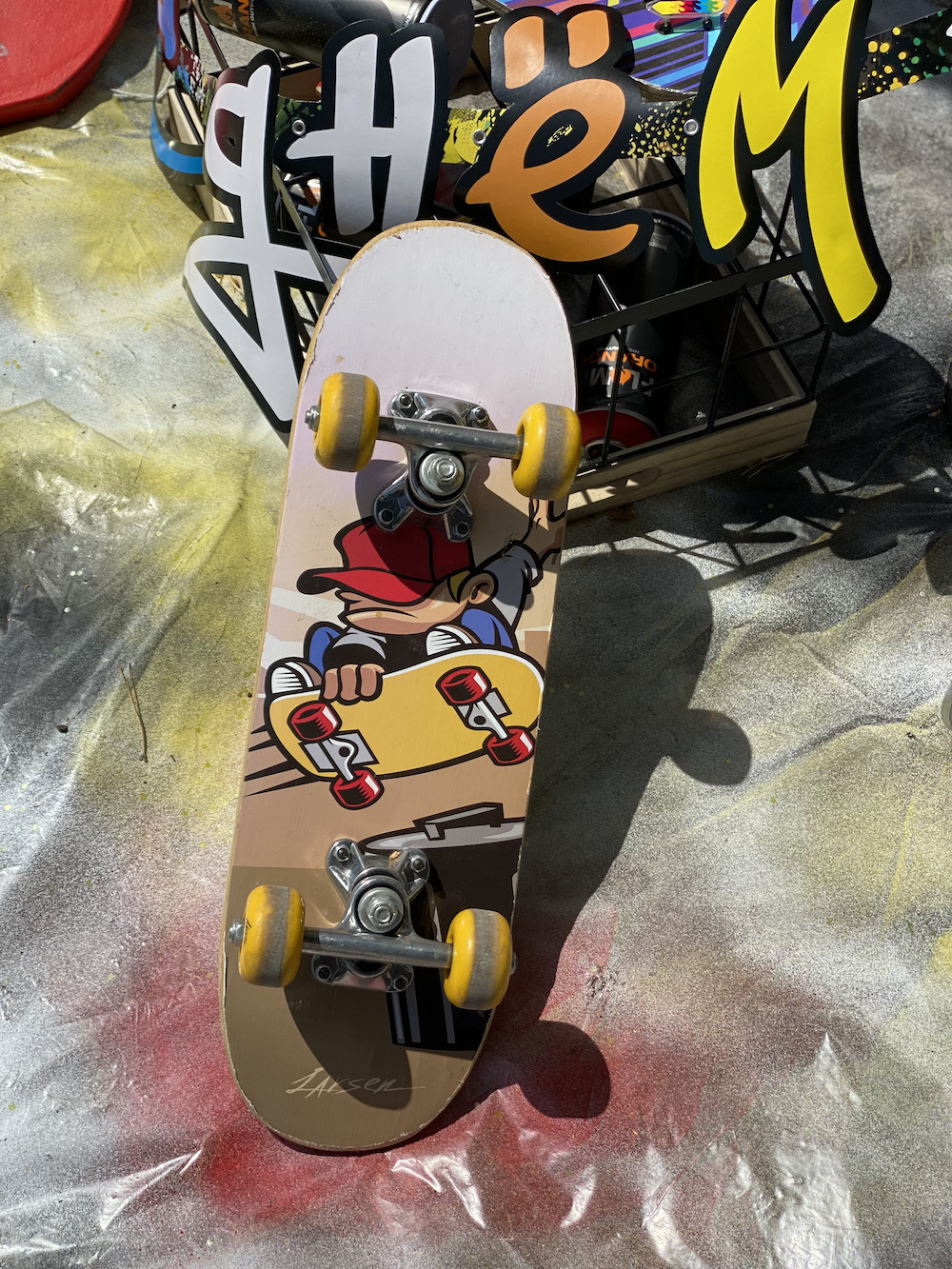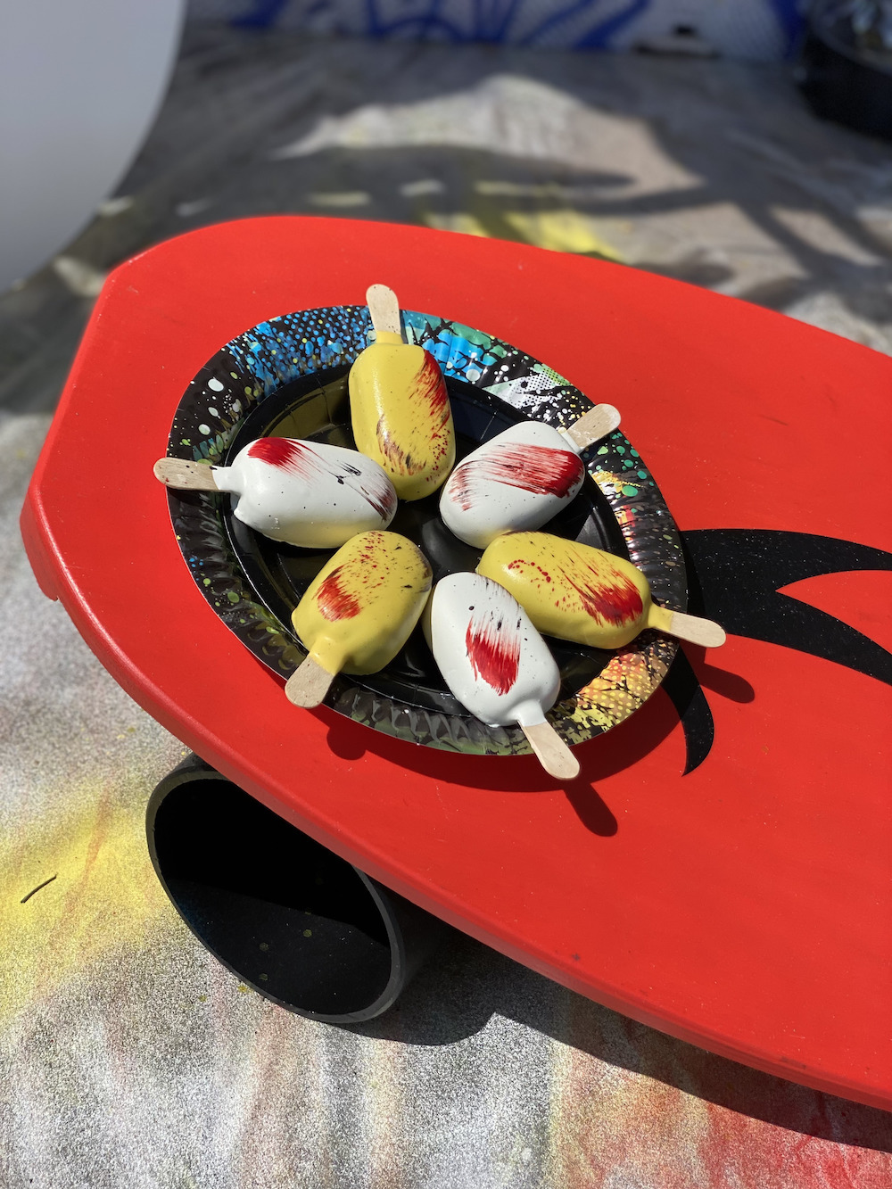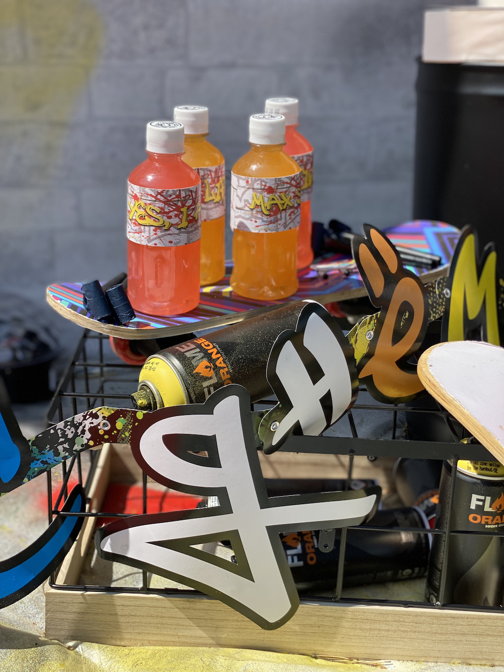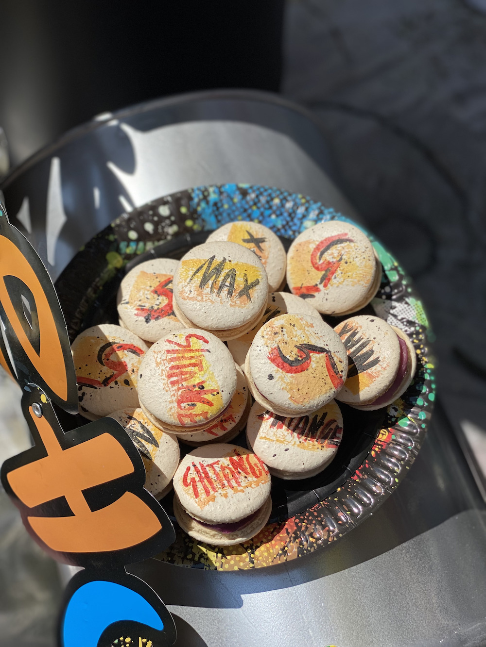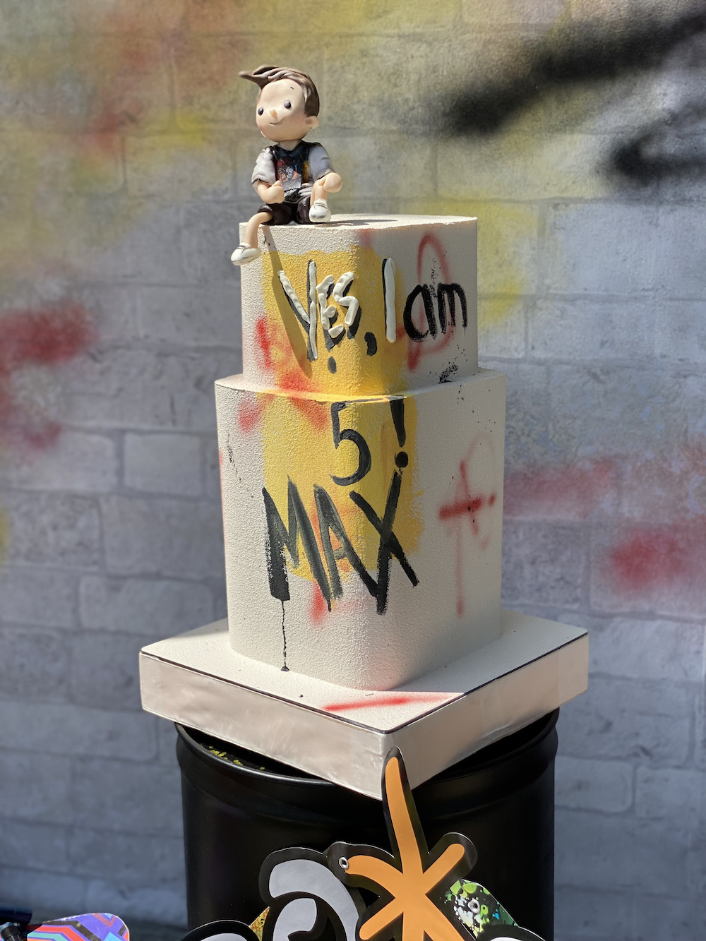 Крутая вечеринка для любителя спорта и стрит-арта! Наш декоратор даже смогла вписать подарки в созданную ей фотозону: скейт и трюковой велосипед. Специально для этого праздника были разработаны панно с граффити, этикетки для бутылочек и коробочки для попкорна.