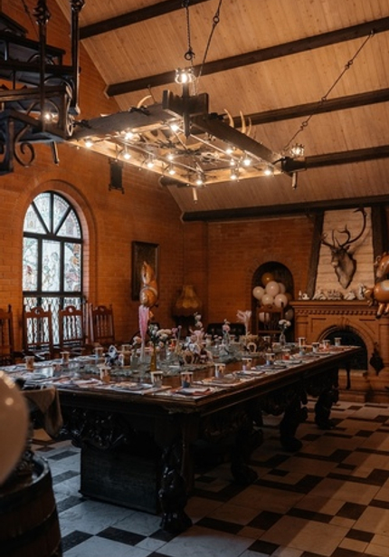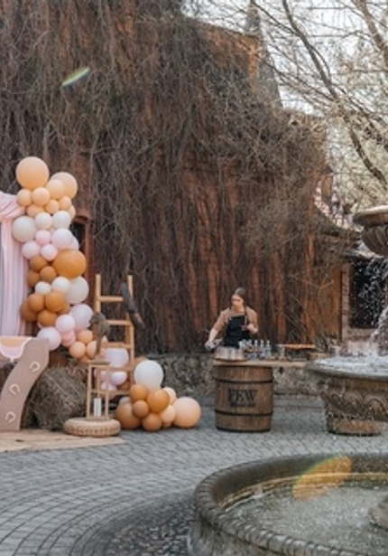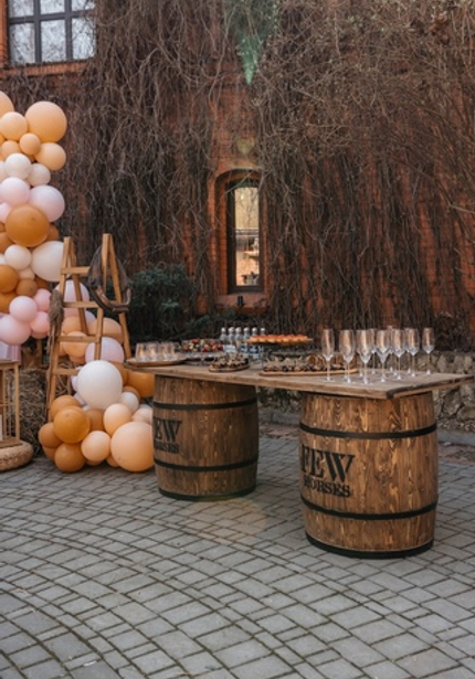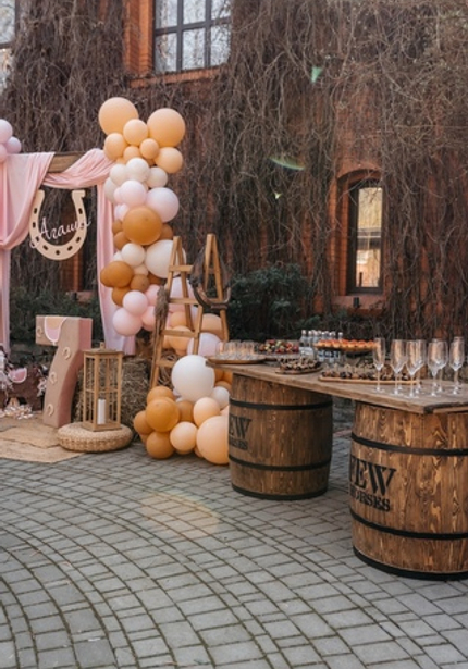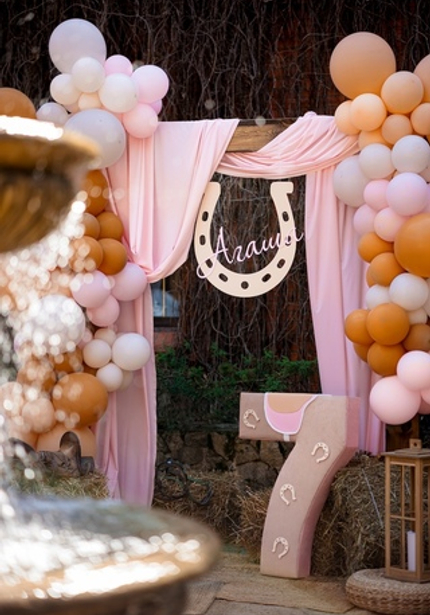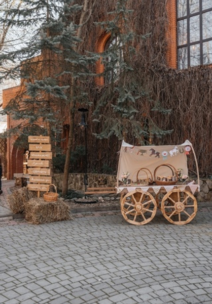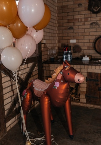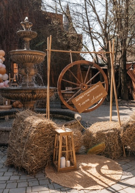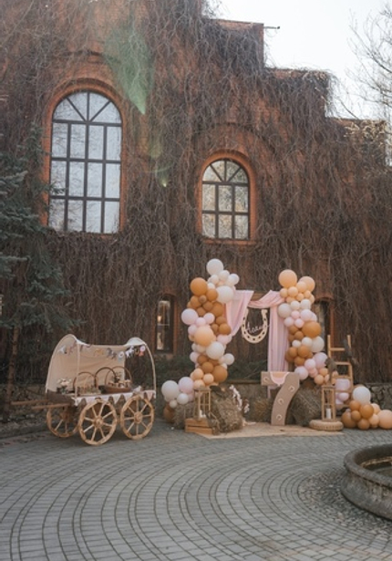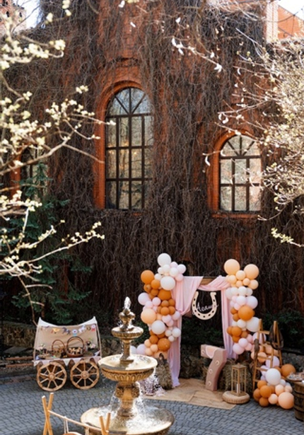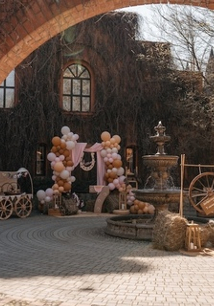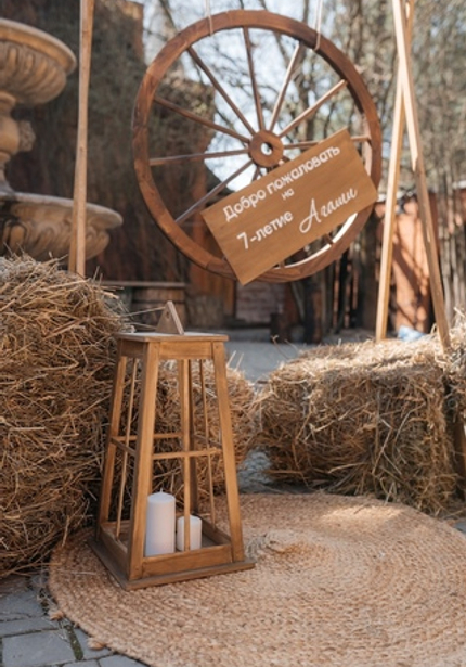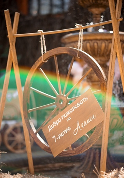 Наша именинница Агаша занимается конным спортом, поэтому такая локация подошла нам идеально! Во дворе поместья мы сделали фотозону и поставили старинную тележку с угощениями. Сам праздник проходил внутри — мы накрыли два отдельных стола для детей и родителей, чтобы одни играли с нашими артистами, а другие отдыхали и наслаждались праздником.