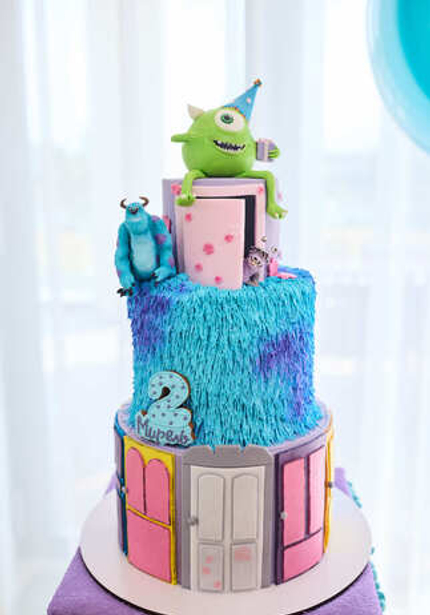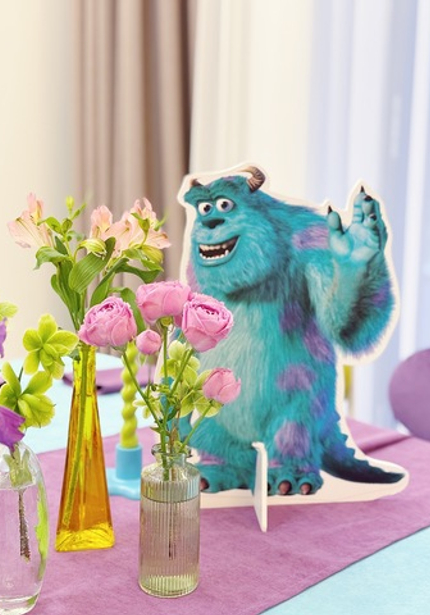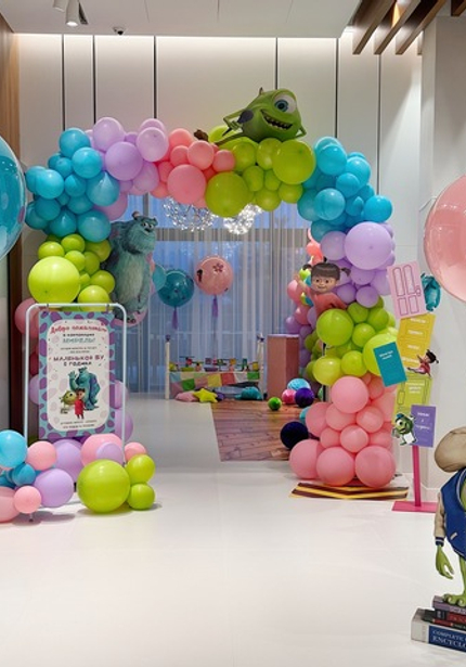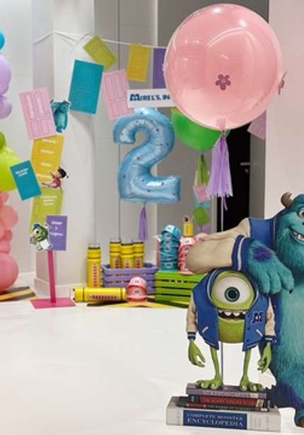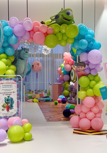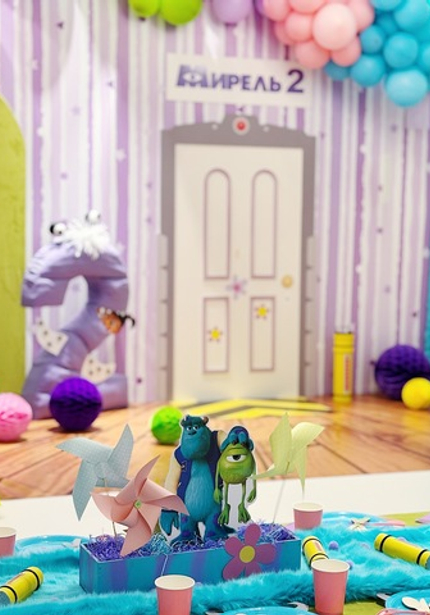 В фотозоне мы воссоздали стену и дверь из детской Бу, по бокам сделали фоны в виде шёрстки Салли и Майка — зелёный фон с большим глазом. А сладкий стол сделали в виде кроватки Бу!