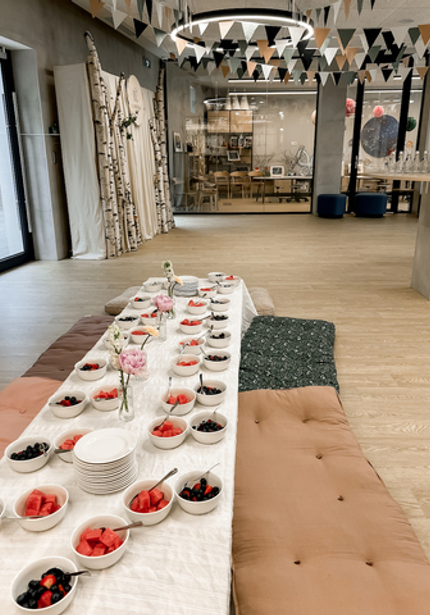 Рядом мы устроили фруктово-ягодный фуршет для детей и родителей, украсили помещение цветами, а также устроили для детей потрясающее выступление фокусника.