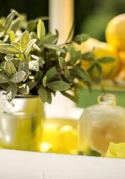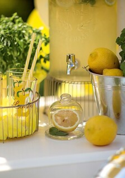 На столе свежие фрукты и овощи, а в стеклянных кувшинах — ледяной лимонад!
