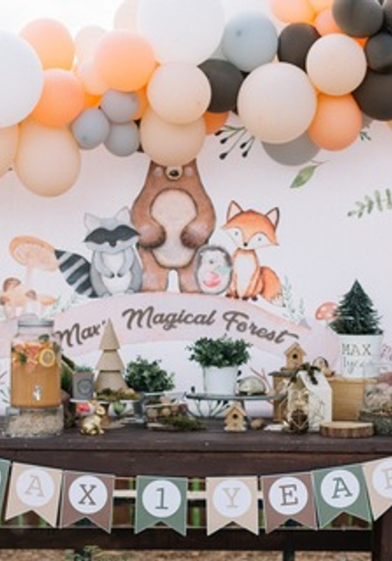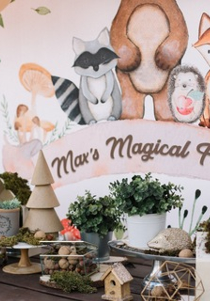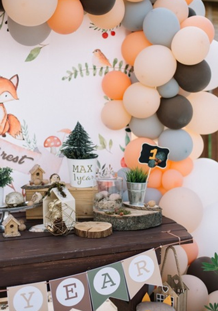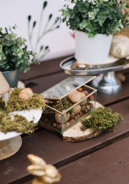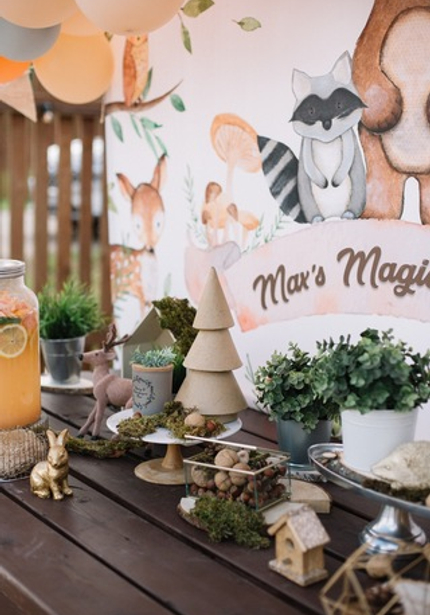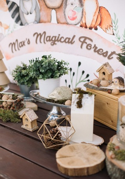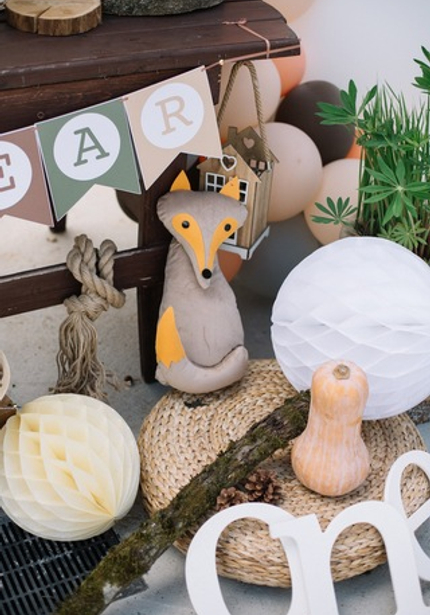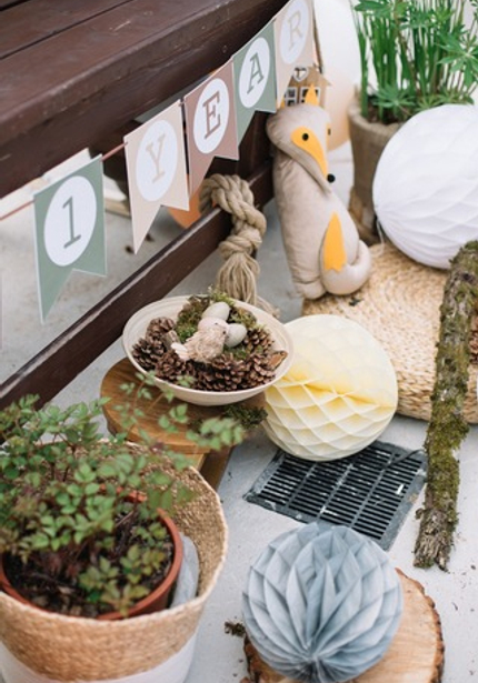Мы обожаем пикники в лесной тематике! В оформлении можно много всего придумать — мы использовали мох, спилы деревьев в качестве подставок, веточки, камушки и шишки! Когда украшаешь праздник дарами природы, сочетая их с современным декором — получается невероятно! Кроме того, дизайнер отрисовала тематический плакат со зверятами, который прекрасно вписался в оформление.