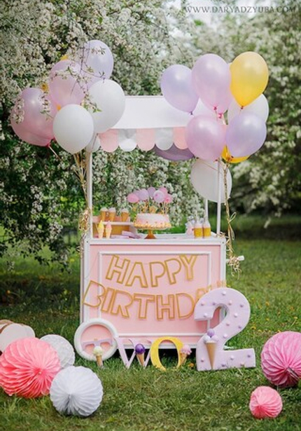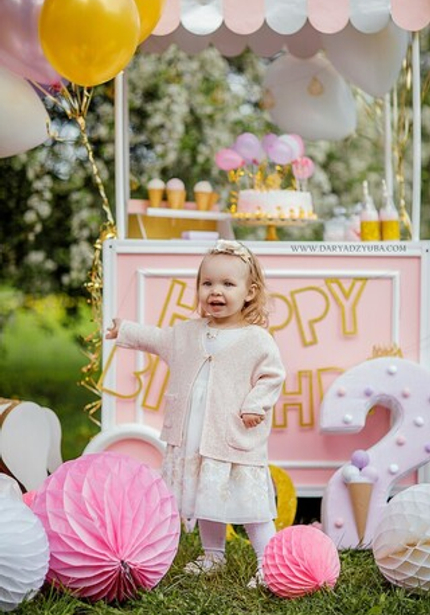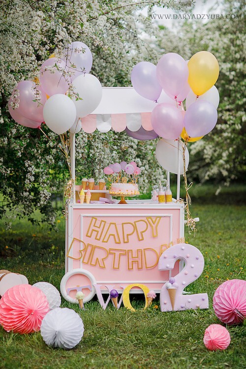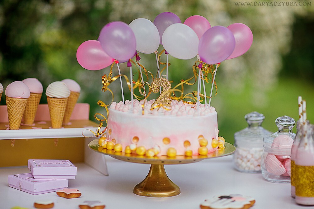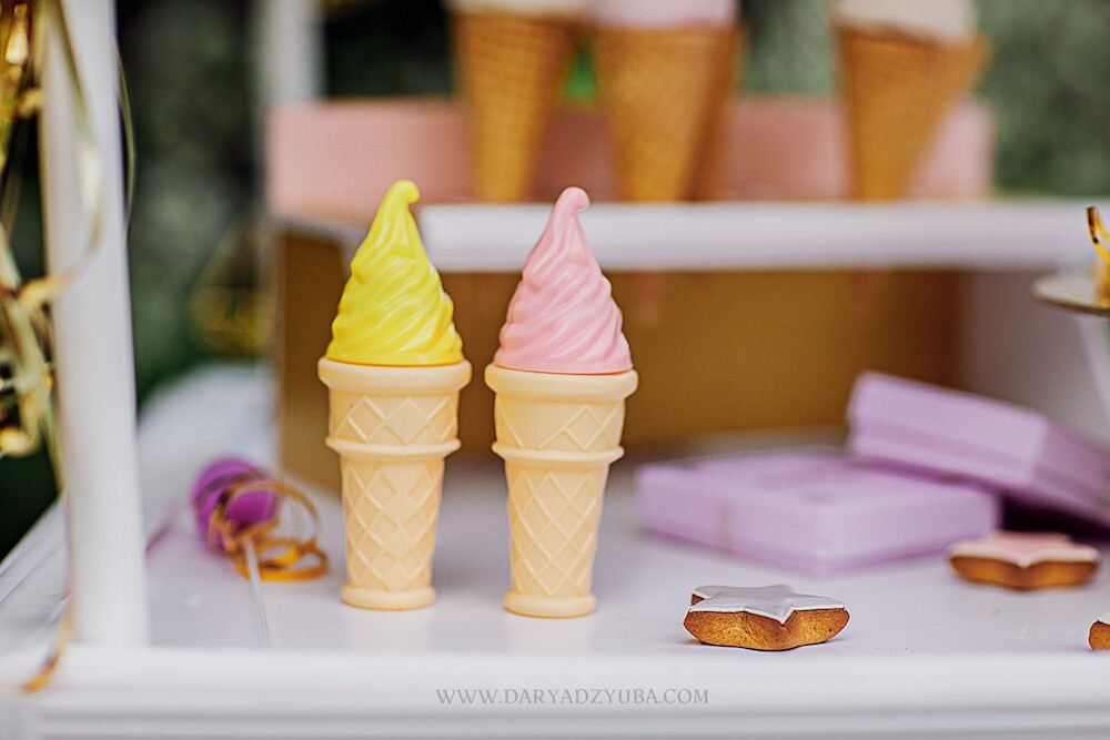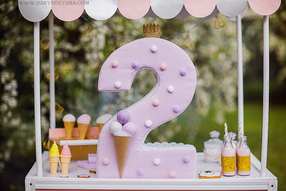 Лето. Жара. Морооооженое! Американские детишки привыкли сбегаться на мелодию фургончика с мороженым, но и мы от такого не откажемся. Нежная розово-фиолетовая гамма, множество сливочных сладостей и вкусный тортик с милым топпером из крошечных воздушных шариков. А еще славная традиция – большая циферка в стиле праздника, с возрастом именинника.