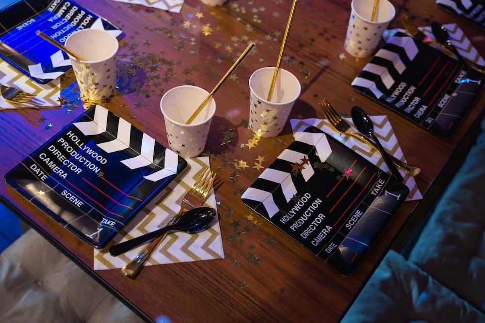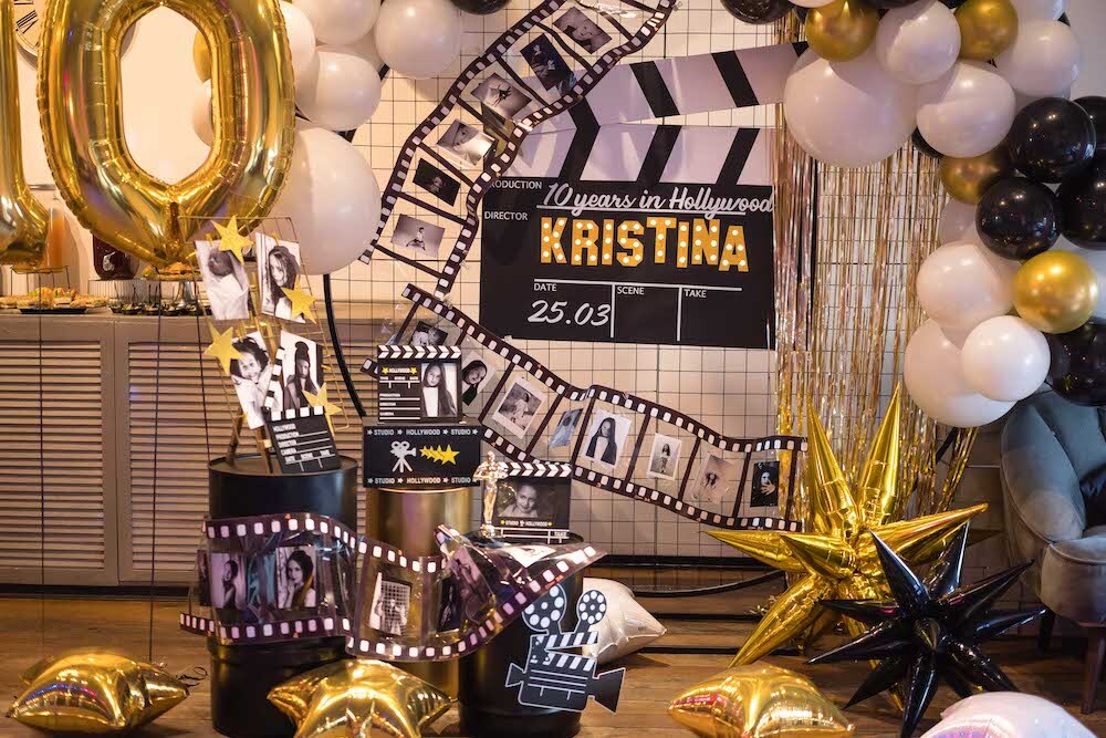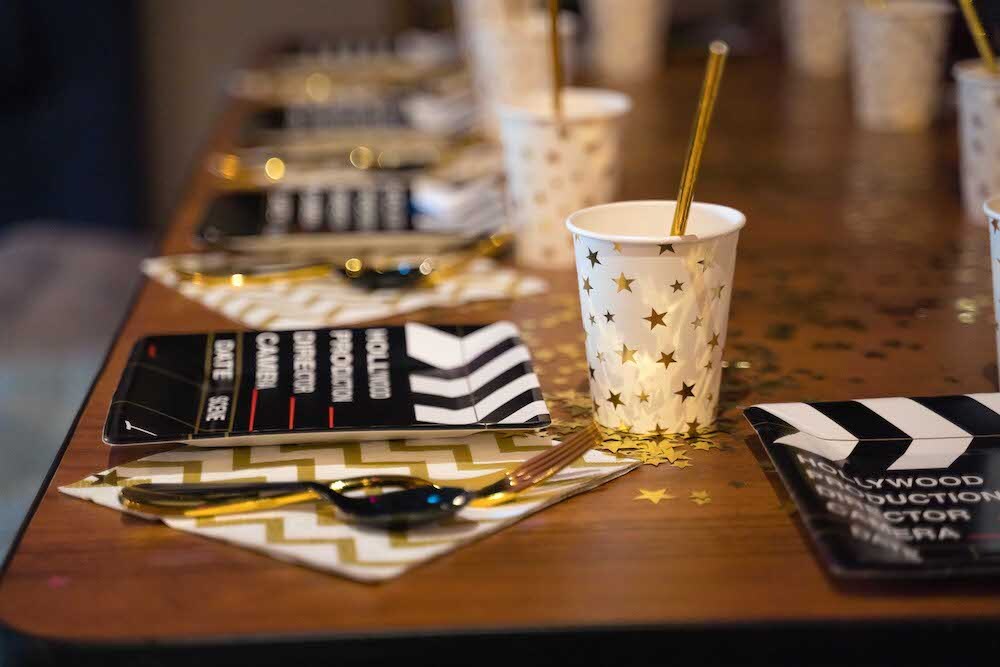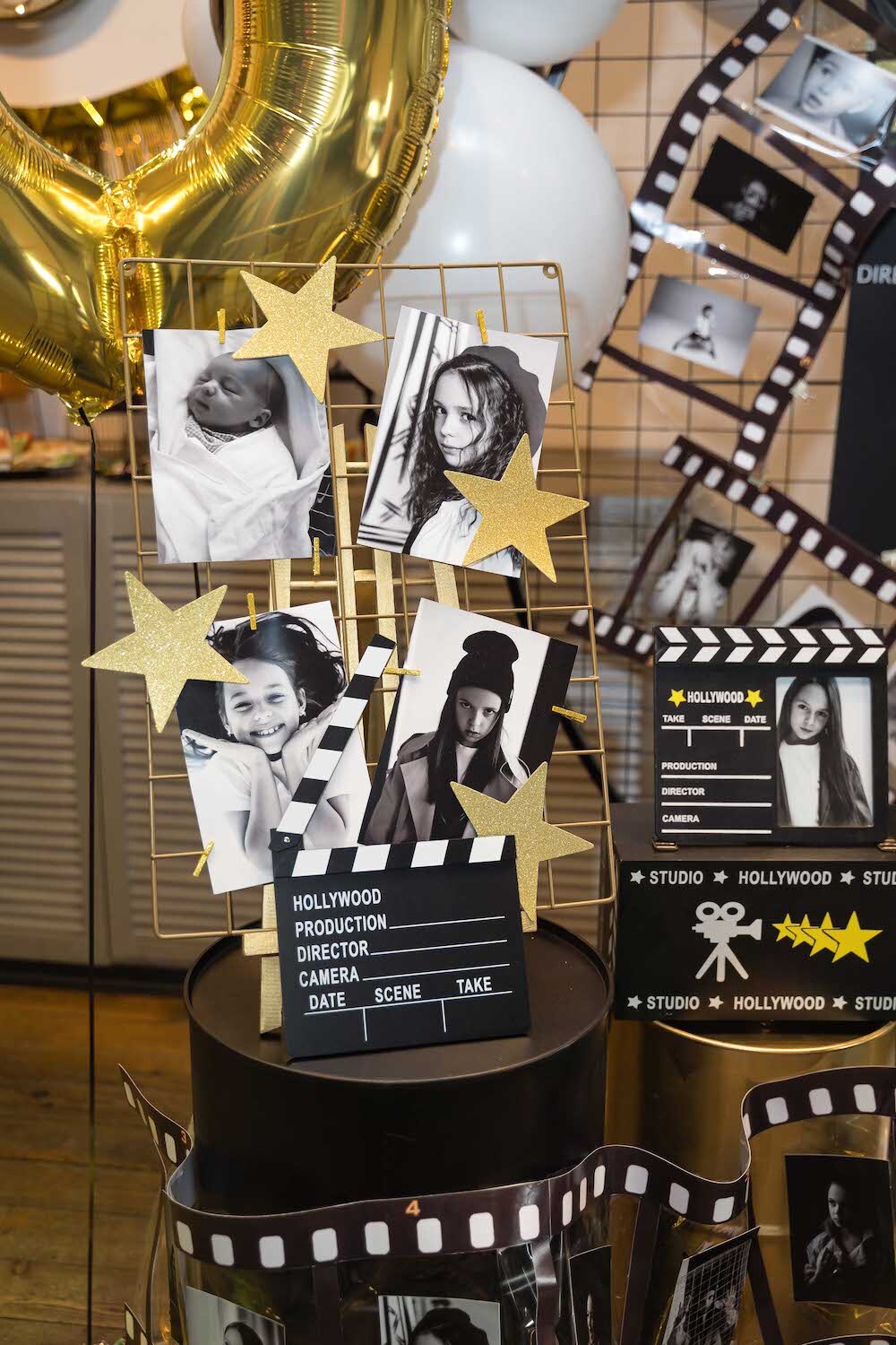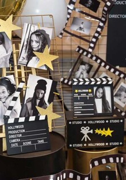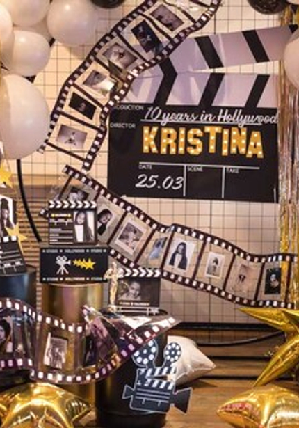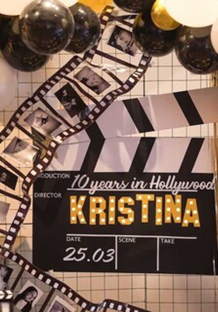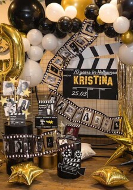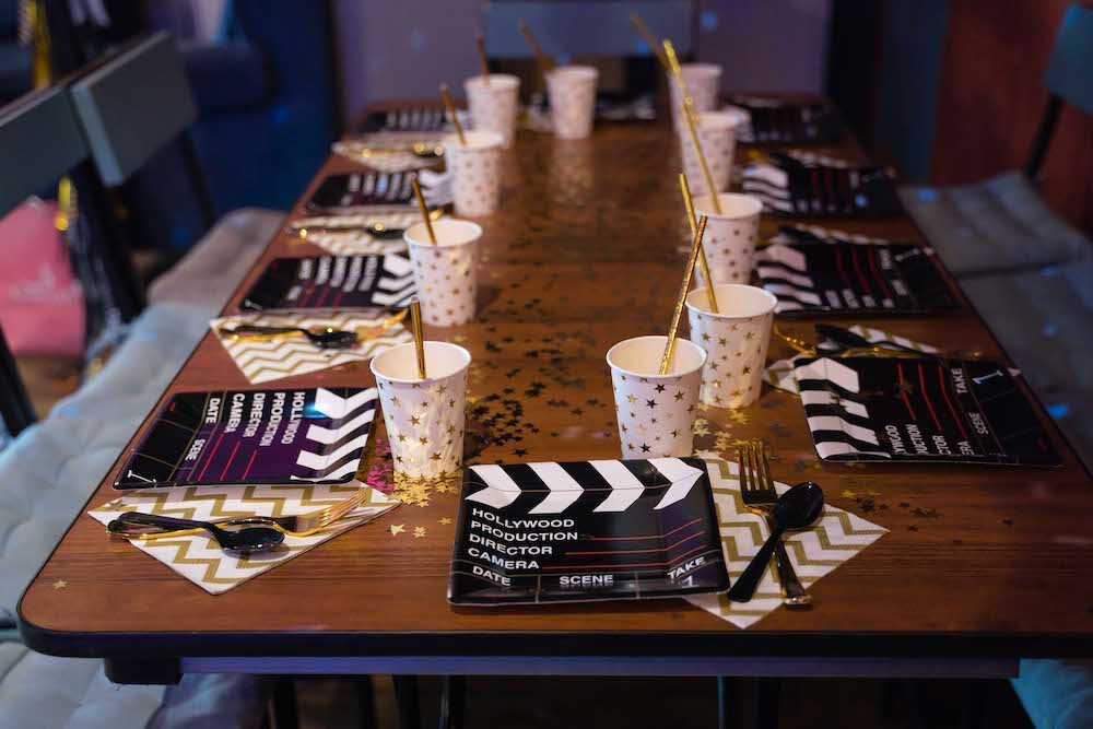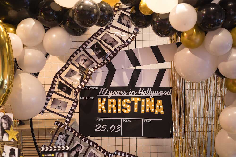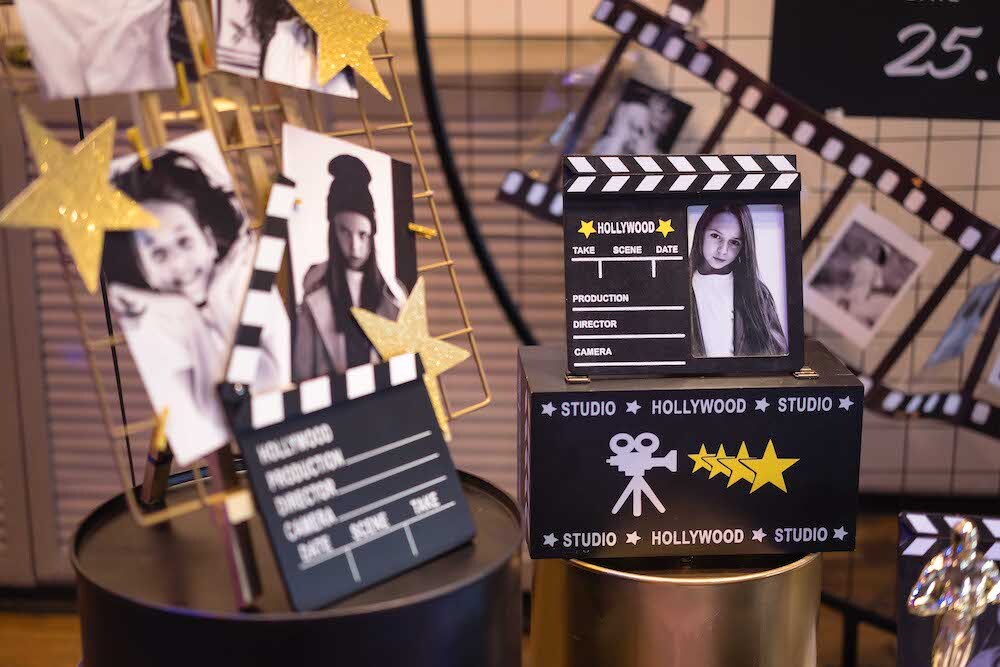 Если ваша малышка уже не хочет быть феей или русалочкой, то мы можем придумать любую другую, взрослую тематику! Например, вечеринку в стиле Голливуда, на которой юной звезде будет весело и комфортно. Праздник Кристины мы оформили в черно-белых тонах с золотыми акцентами и даже нашли классные тарелочки в виде киношных хлопушек!