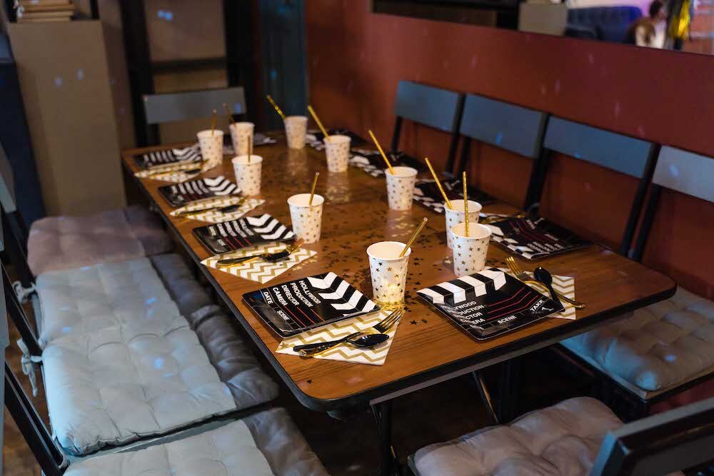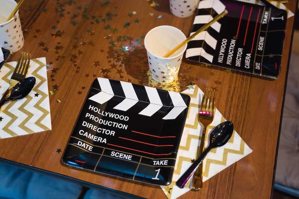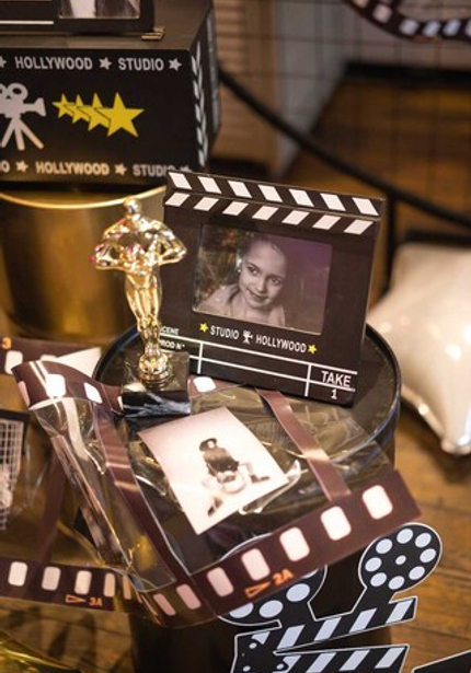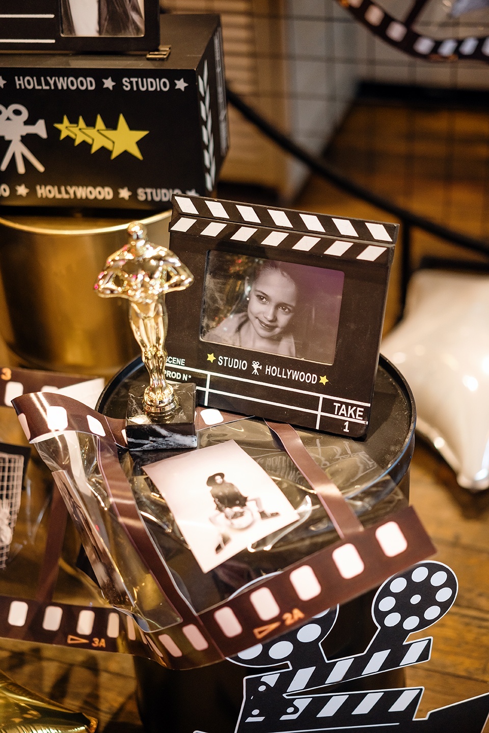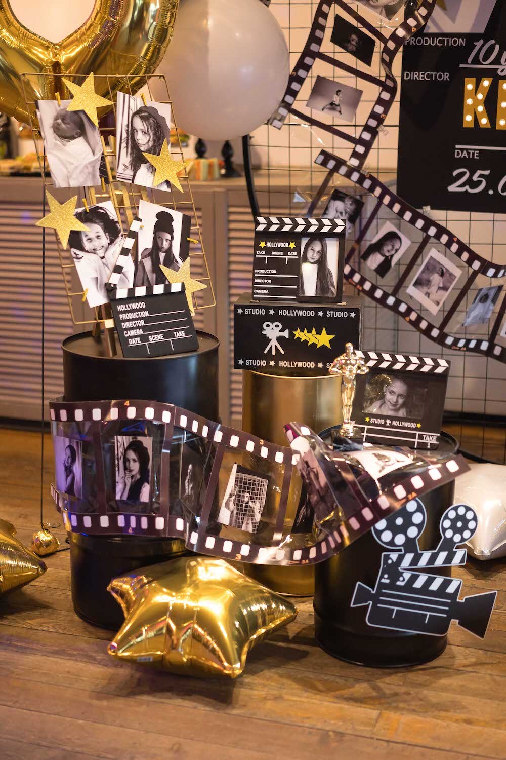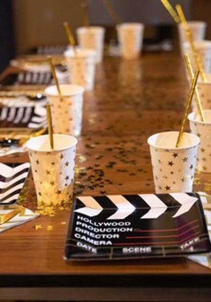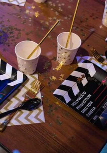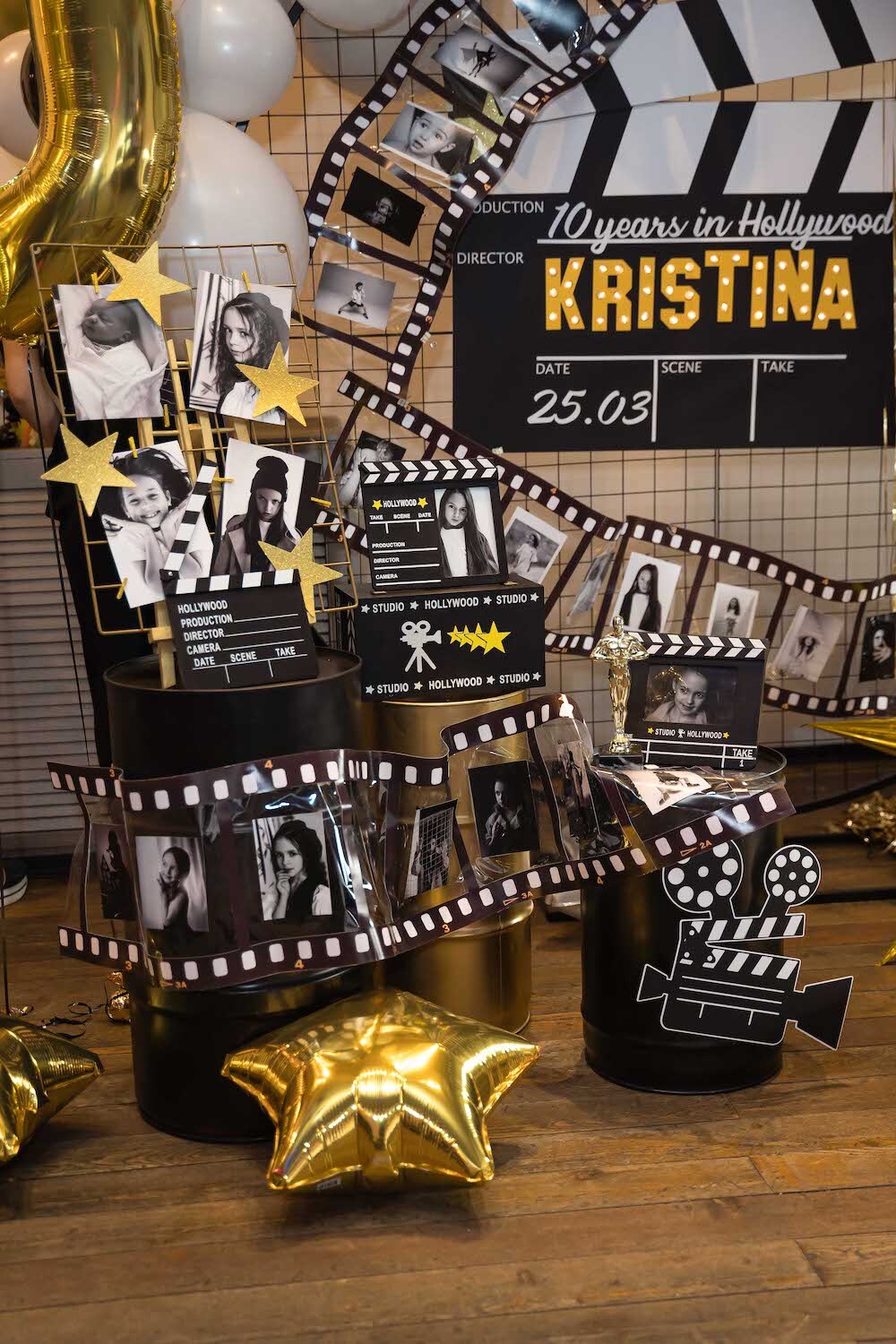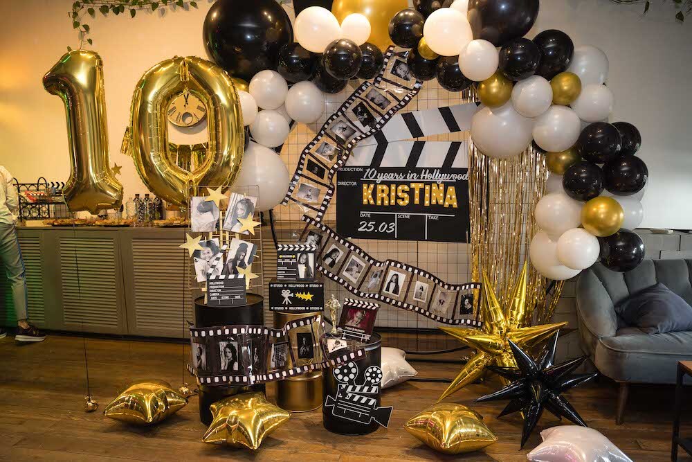 Если ваша малышка уже не хочет быть феей или русалочкой, то мы можем придумать любую другую, взрослую тематику! Например, вечеринку в стиле Голливуда, на которой юной звезде будет весело и комфортно. Праздник Кристины мы оформили в черно-белых тонах с золотыми акцентами и даже нашли классные тарелочки в виде киношных хлопушек!