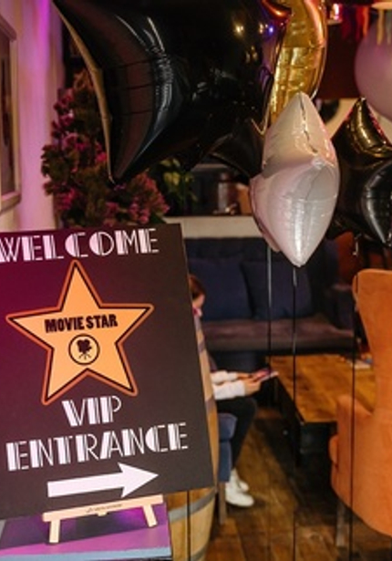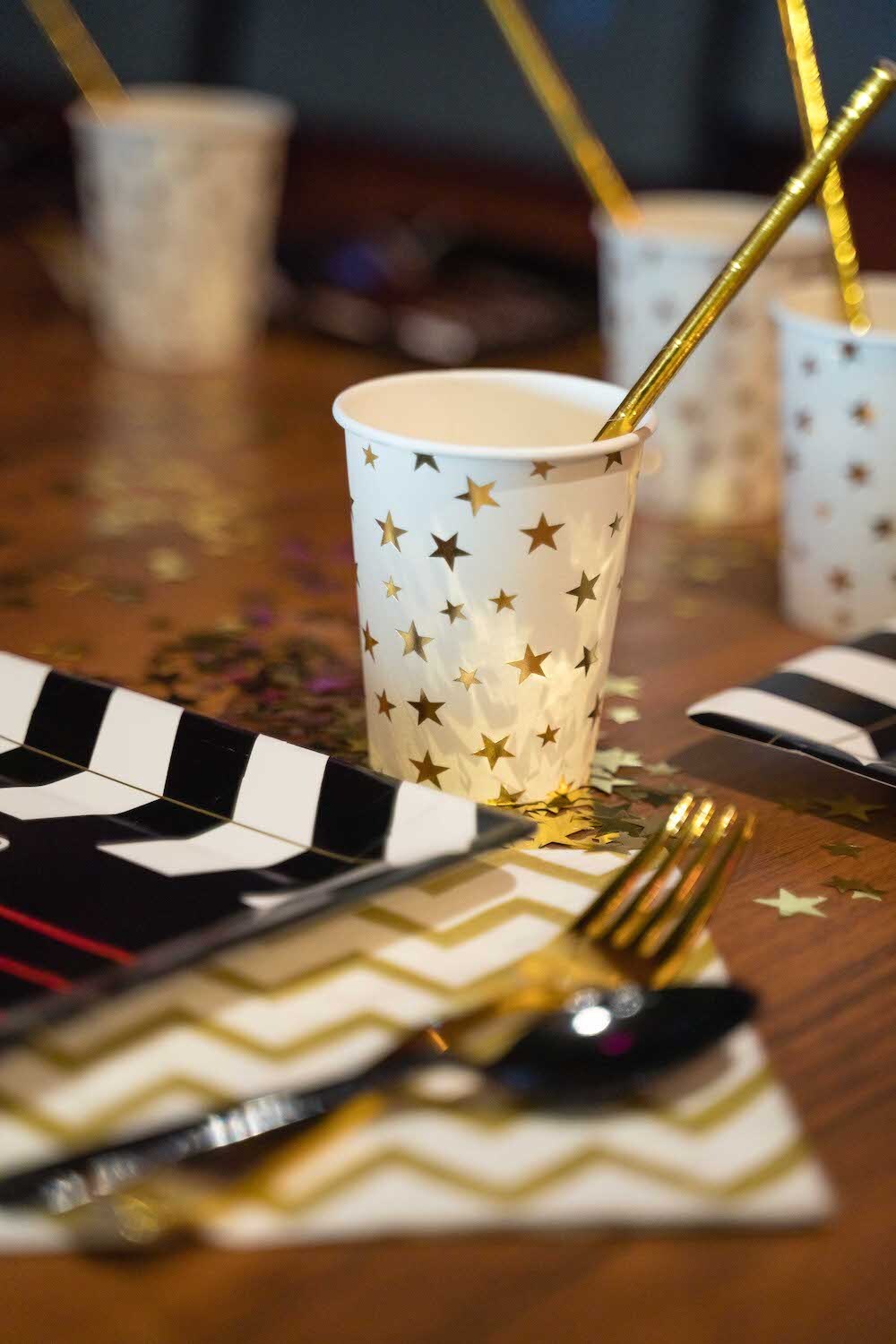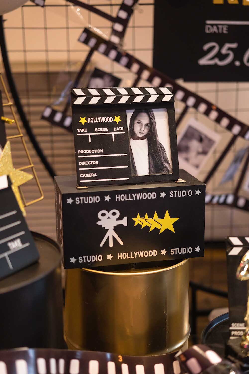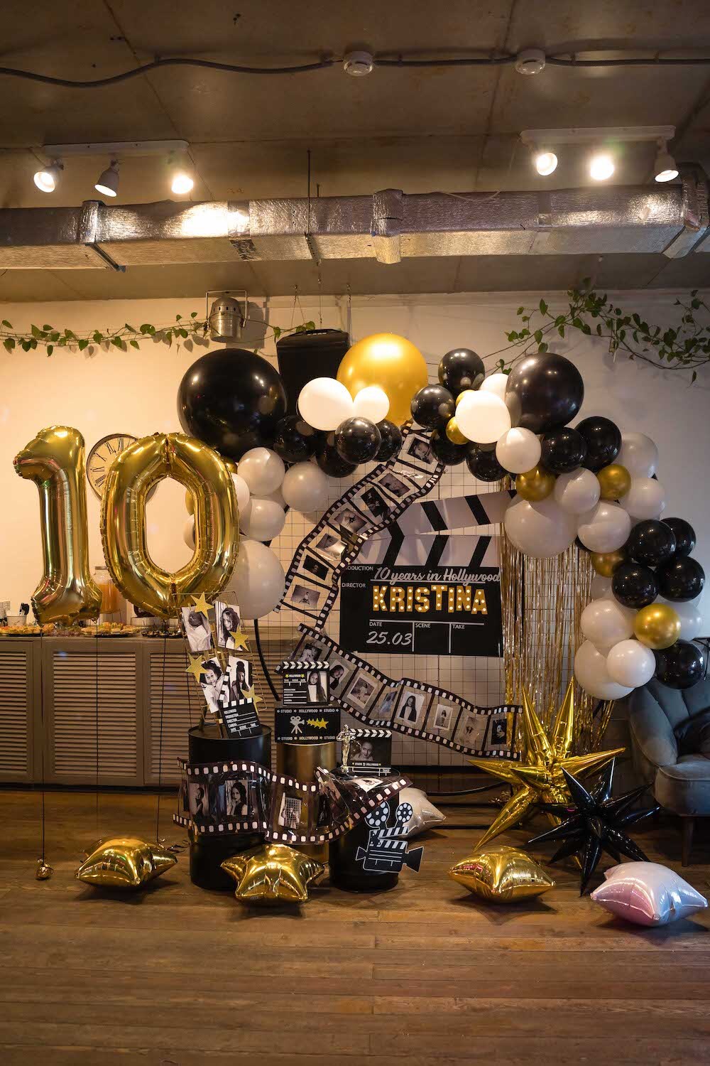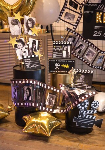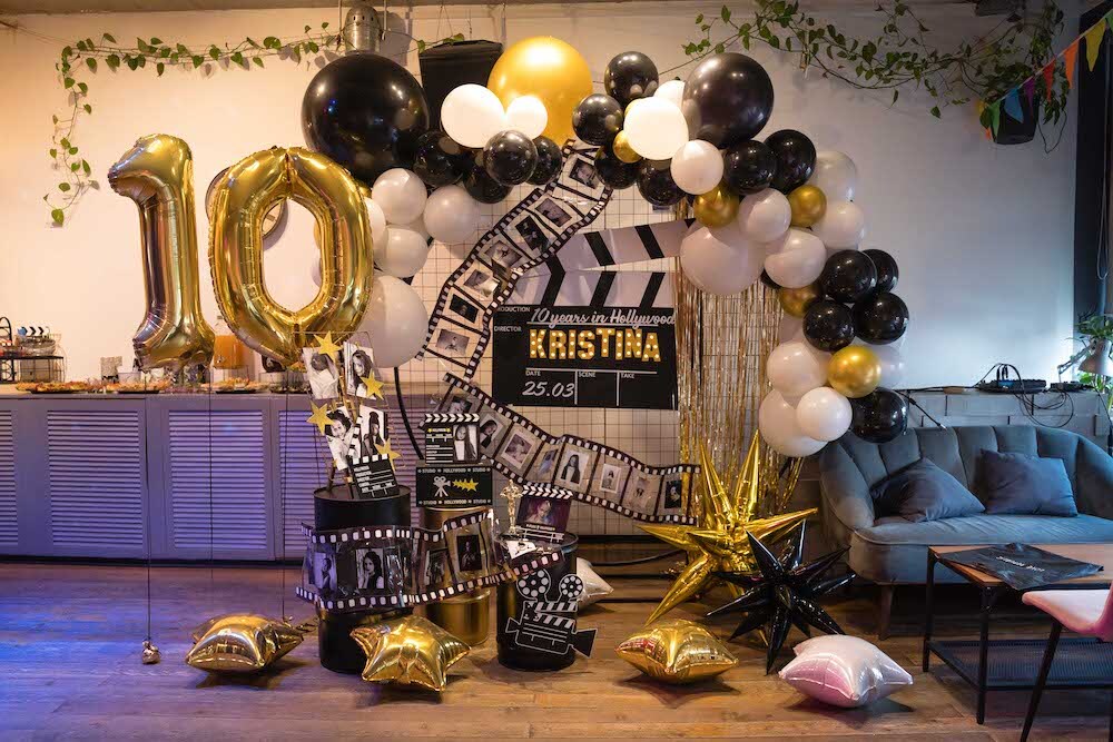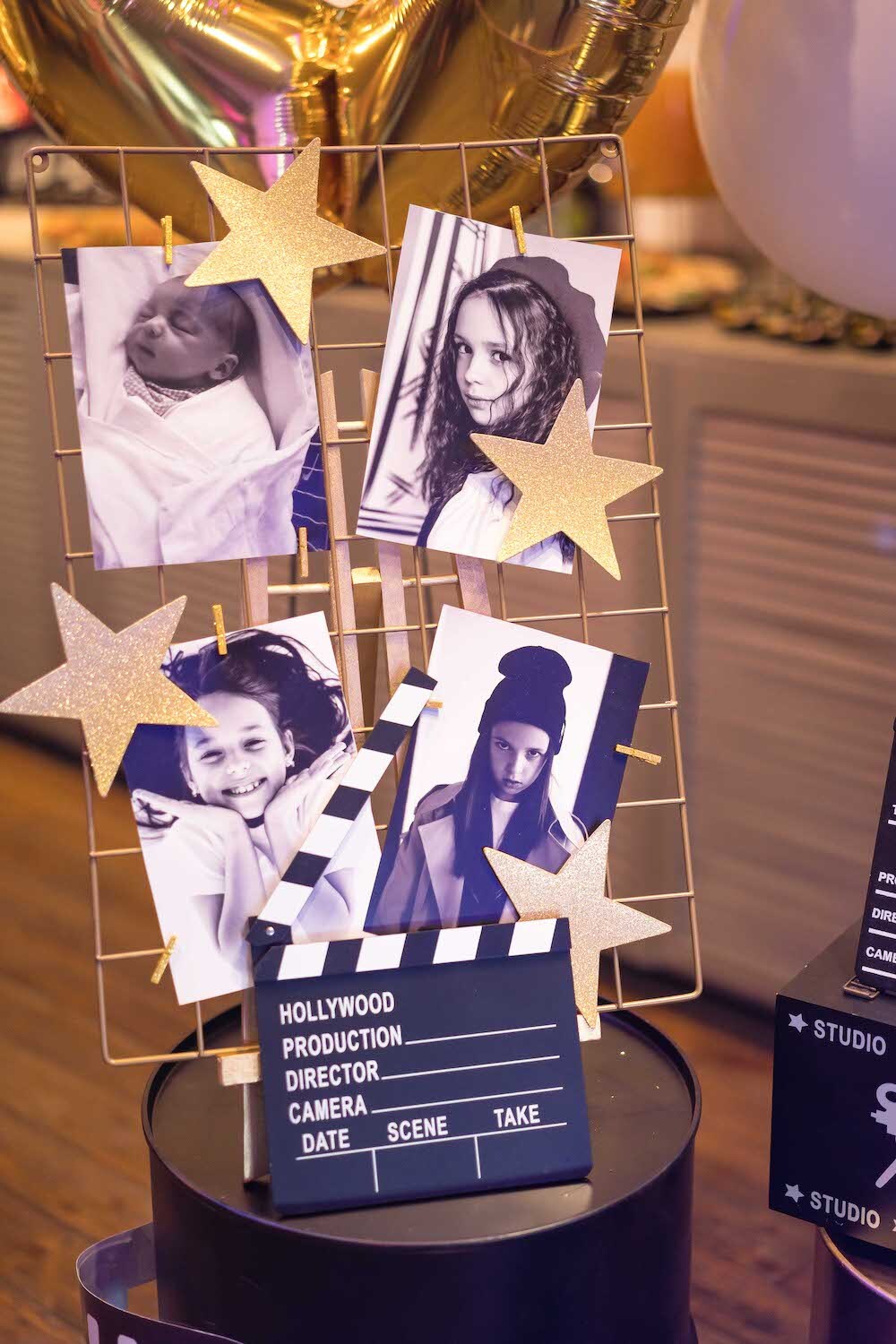 Если ваша малышка уже не хочет быть феей или русалочкой, то мы можем придумать любую другую, взрослую тематику! Например, вечеринку в стиле Голливуда, на которой юной звезде будет весело и комфортно. Праздник Кристины мы оформили в черно-белых тонах с золотыми акцентами и даже нашли классные тарелочки в виде киношных хлопушек!