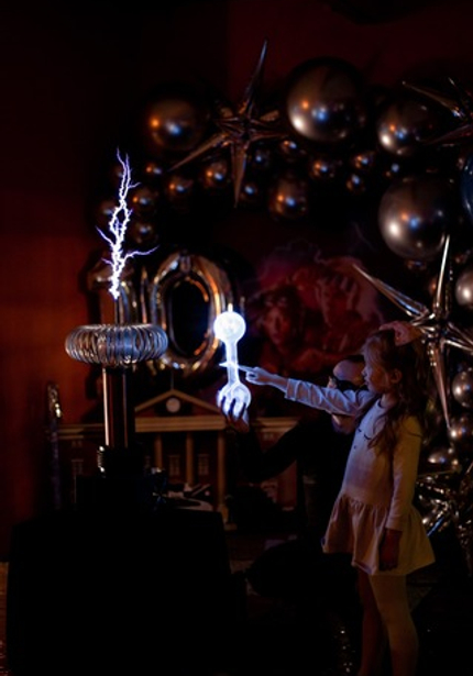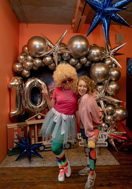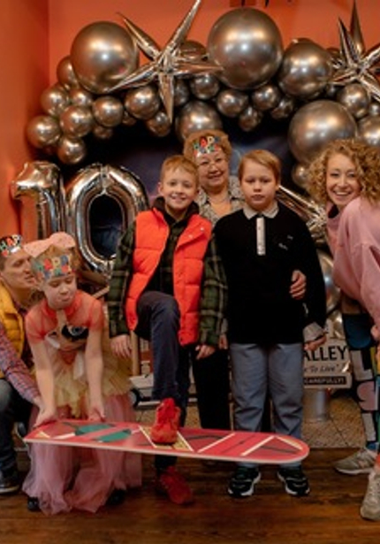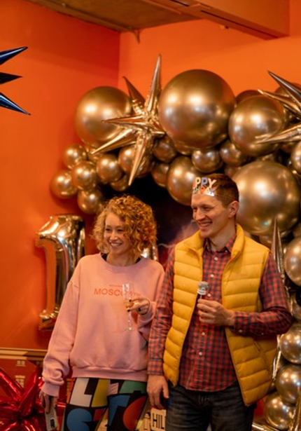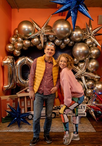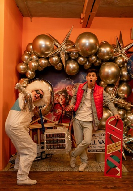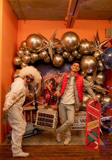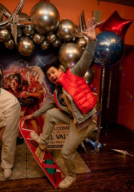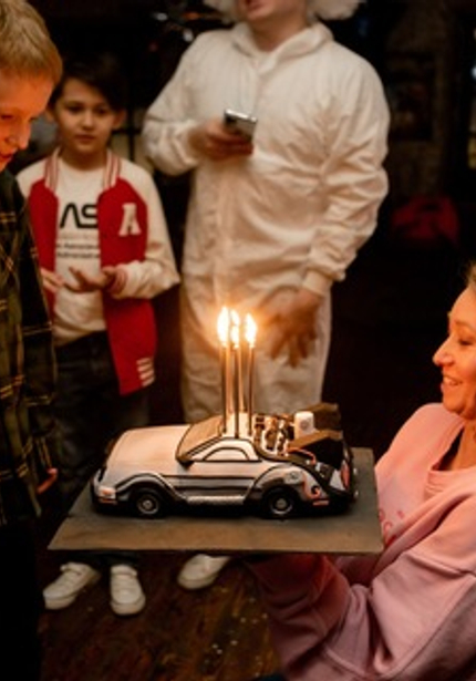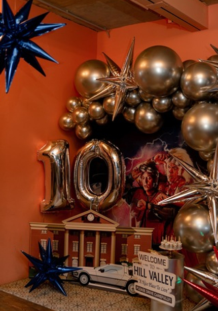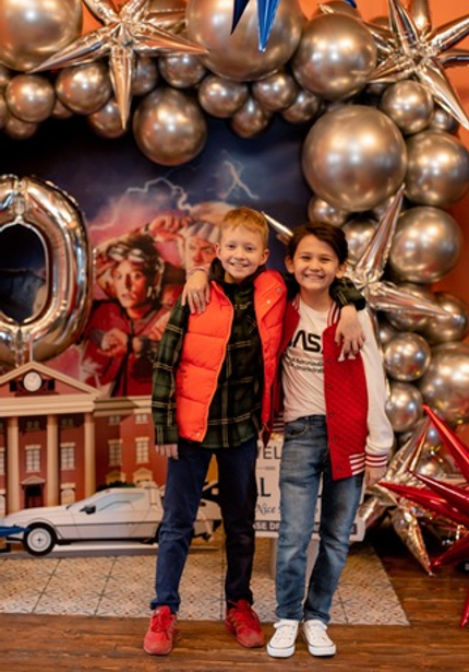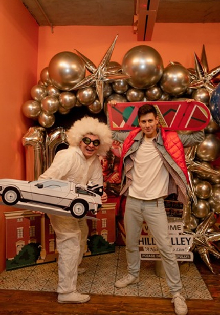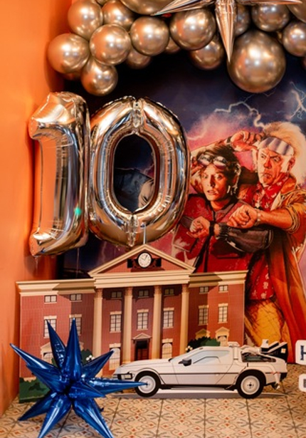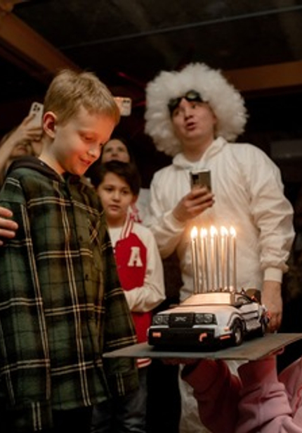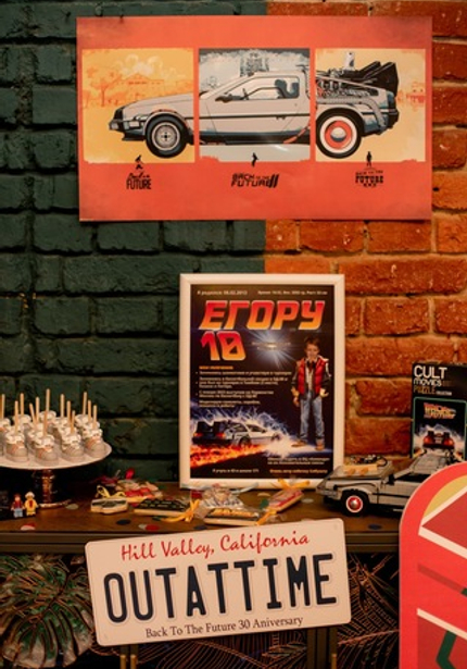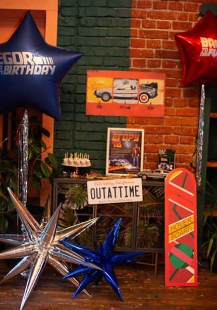 Вечеринка в стиле любимого фильма? Легко! Мы уже не первый раз такое устраиваем. На этот день рождения Егора темой стал фильм Назад в будущее — мы не только оформили всё в этой стилистики, но и сами нарядись в стиле того времени!