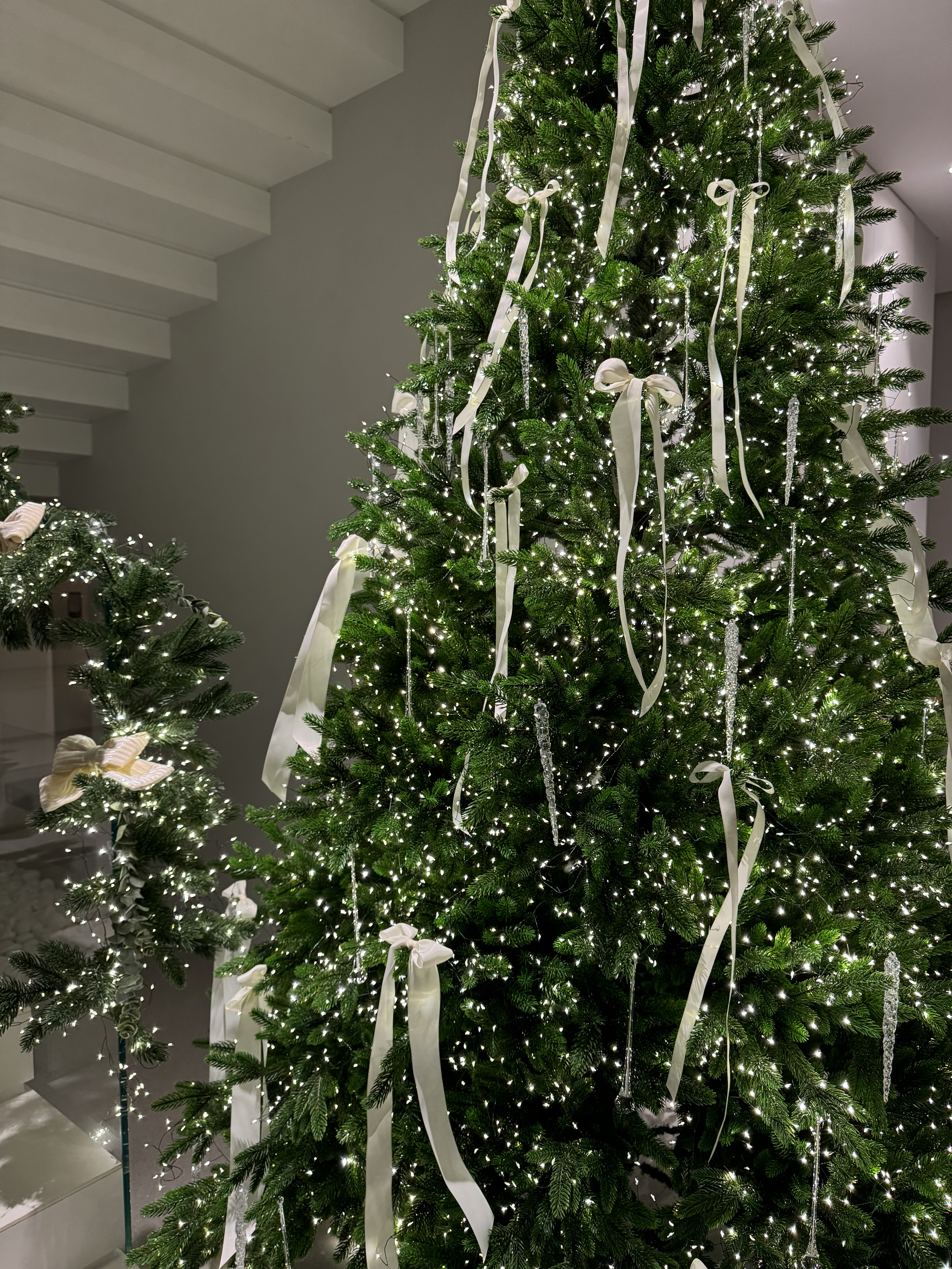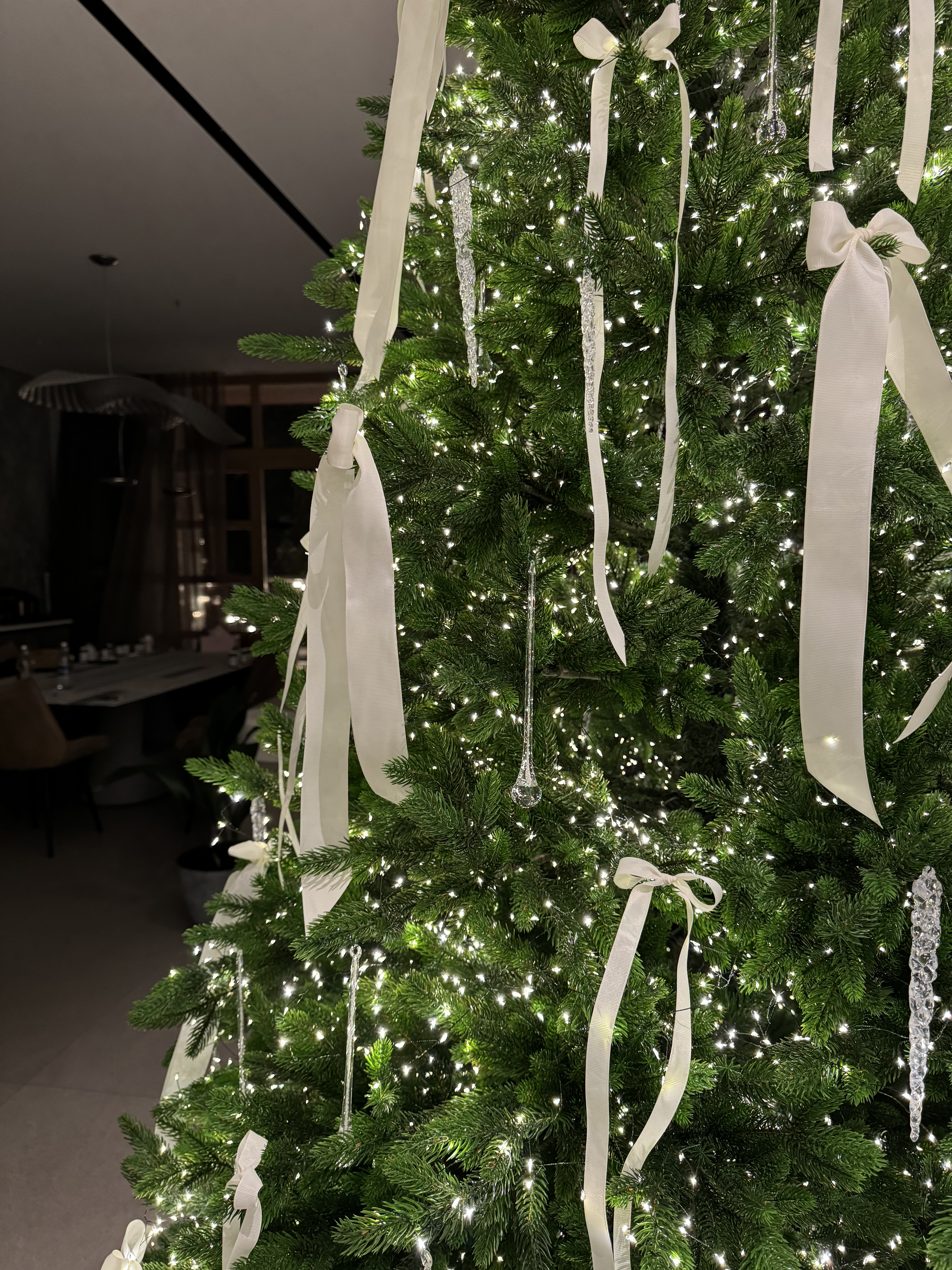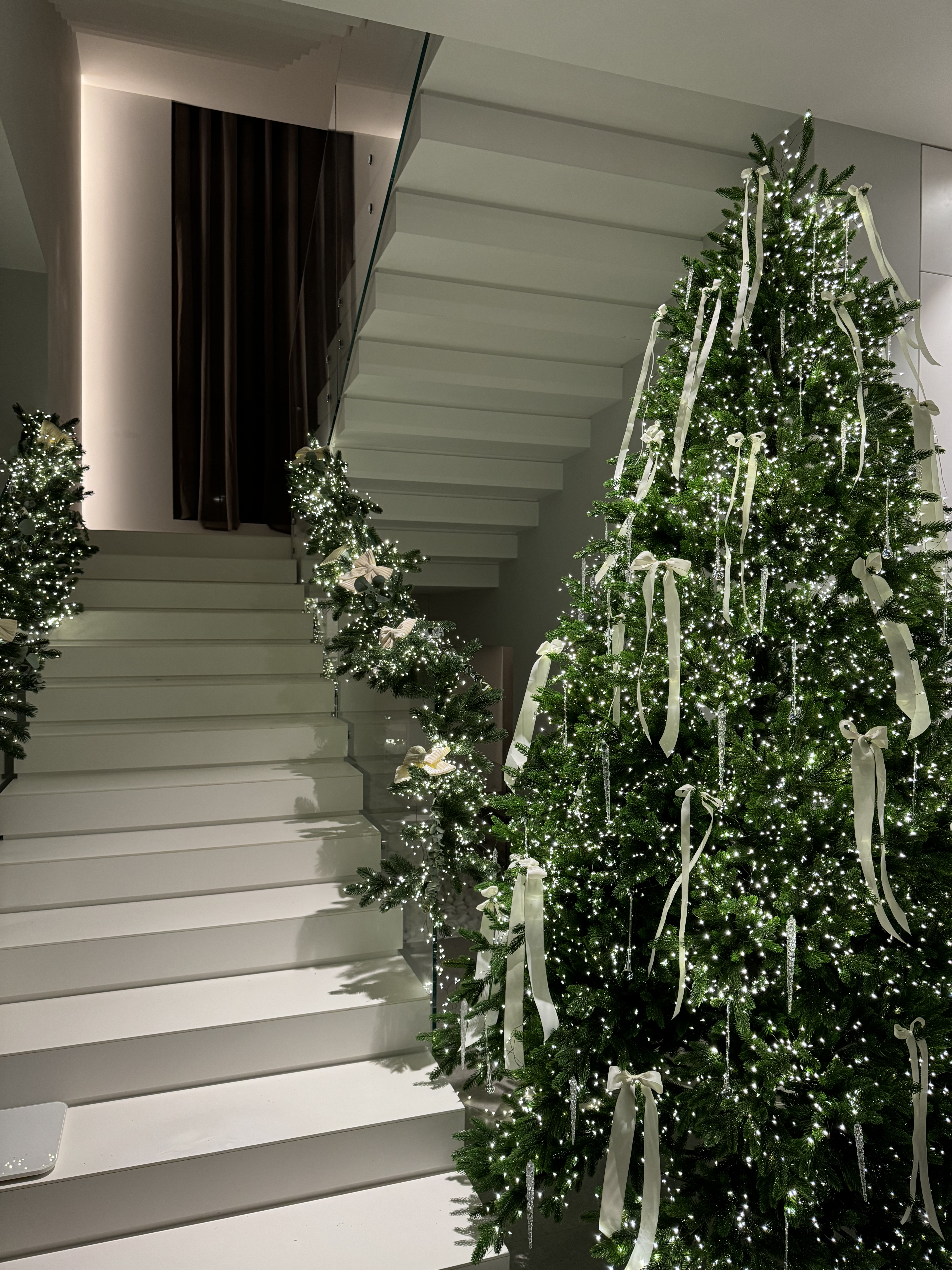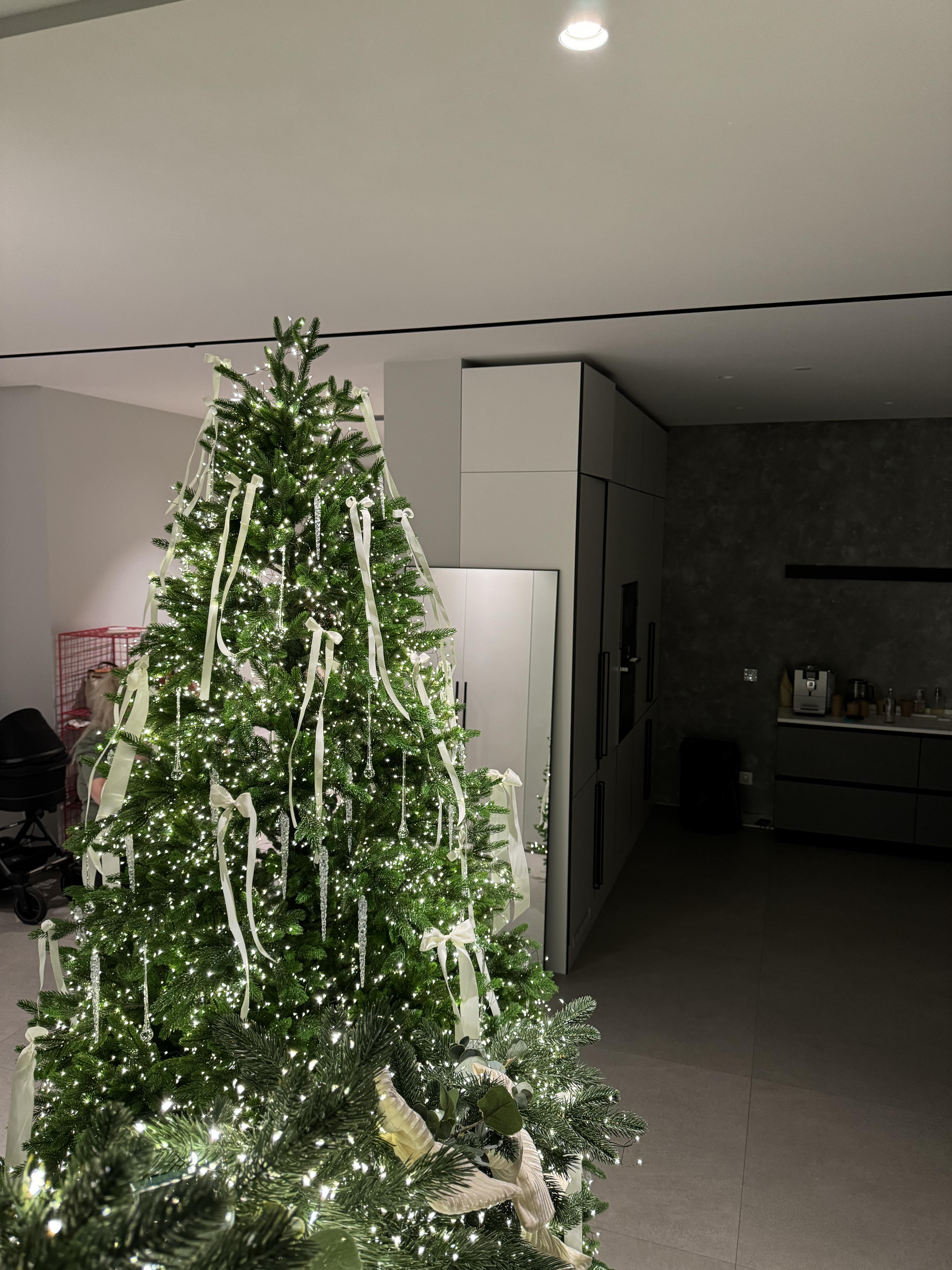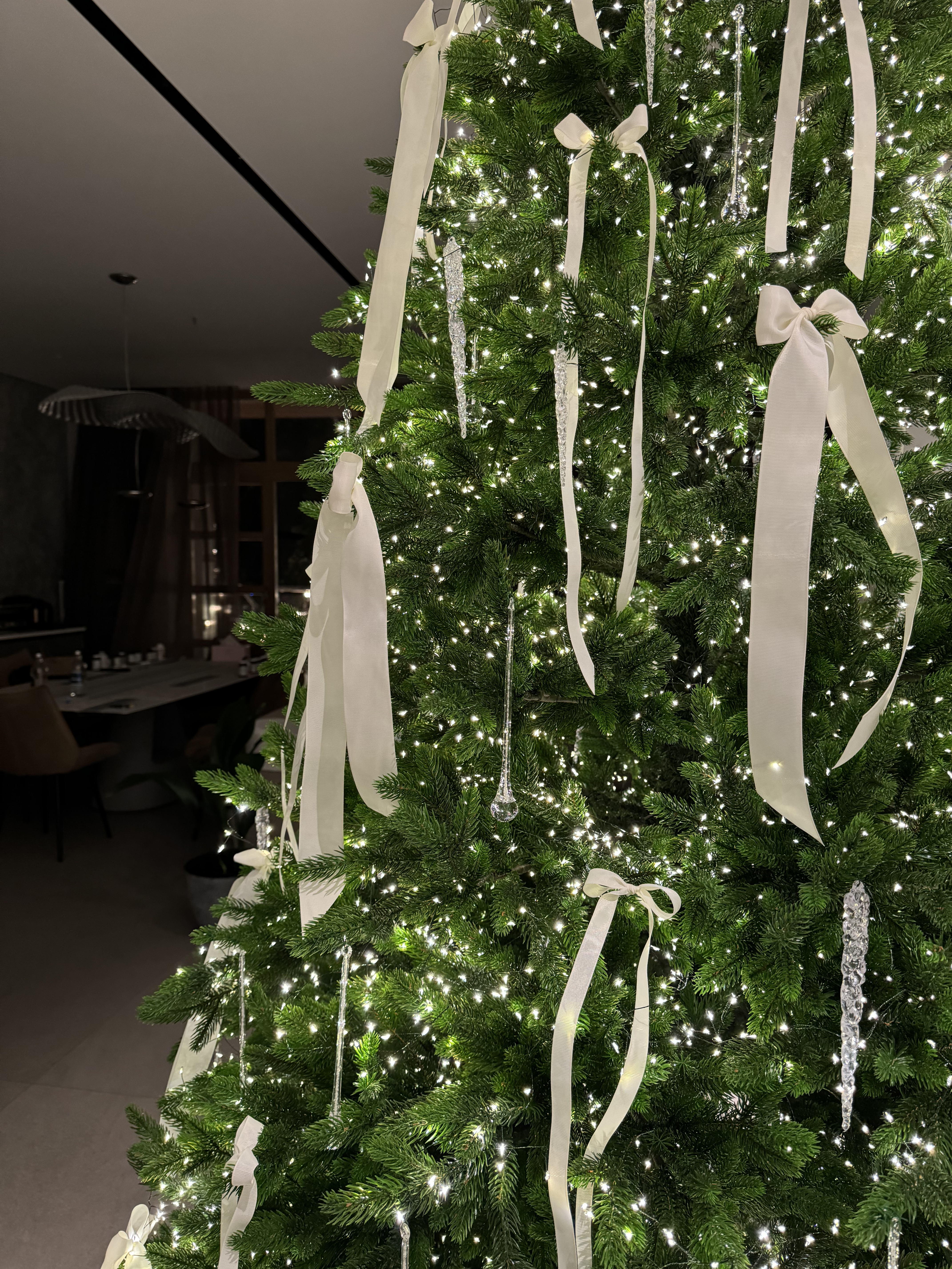 Эта ель — воплощение волшебства и элегантности. Её густая зелёная хвоя из литого материала оживает под сиянием встроенной гирлянды, а украшения в белых и глубоких красных оттенках наполняют интерьер теплом, уютом и атмосферой настоящего торжества. Под елью расположены декоративные подарки, завершающие образ и превращающие её в главный символ праздника.
