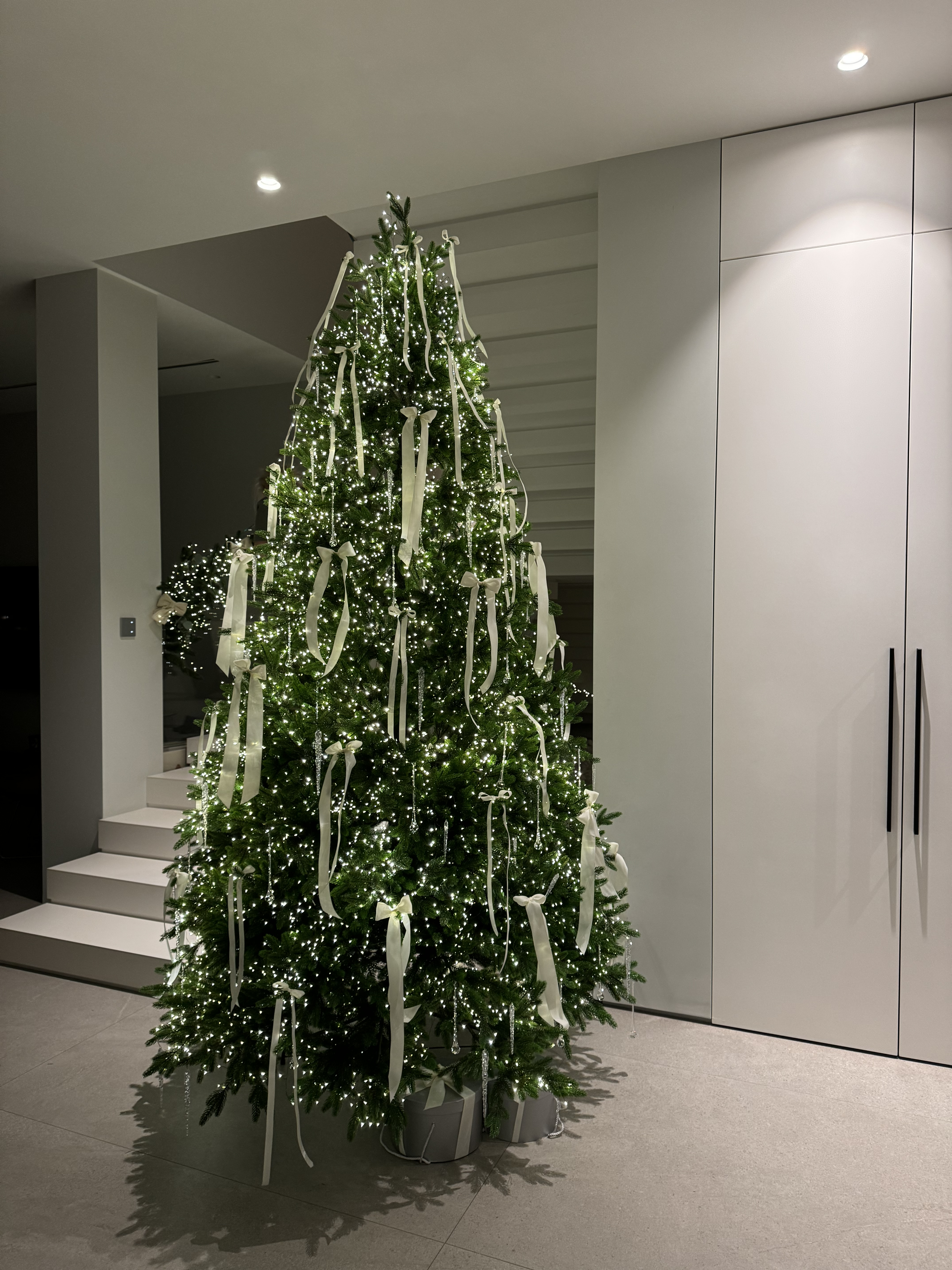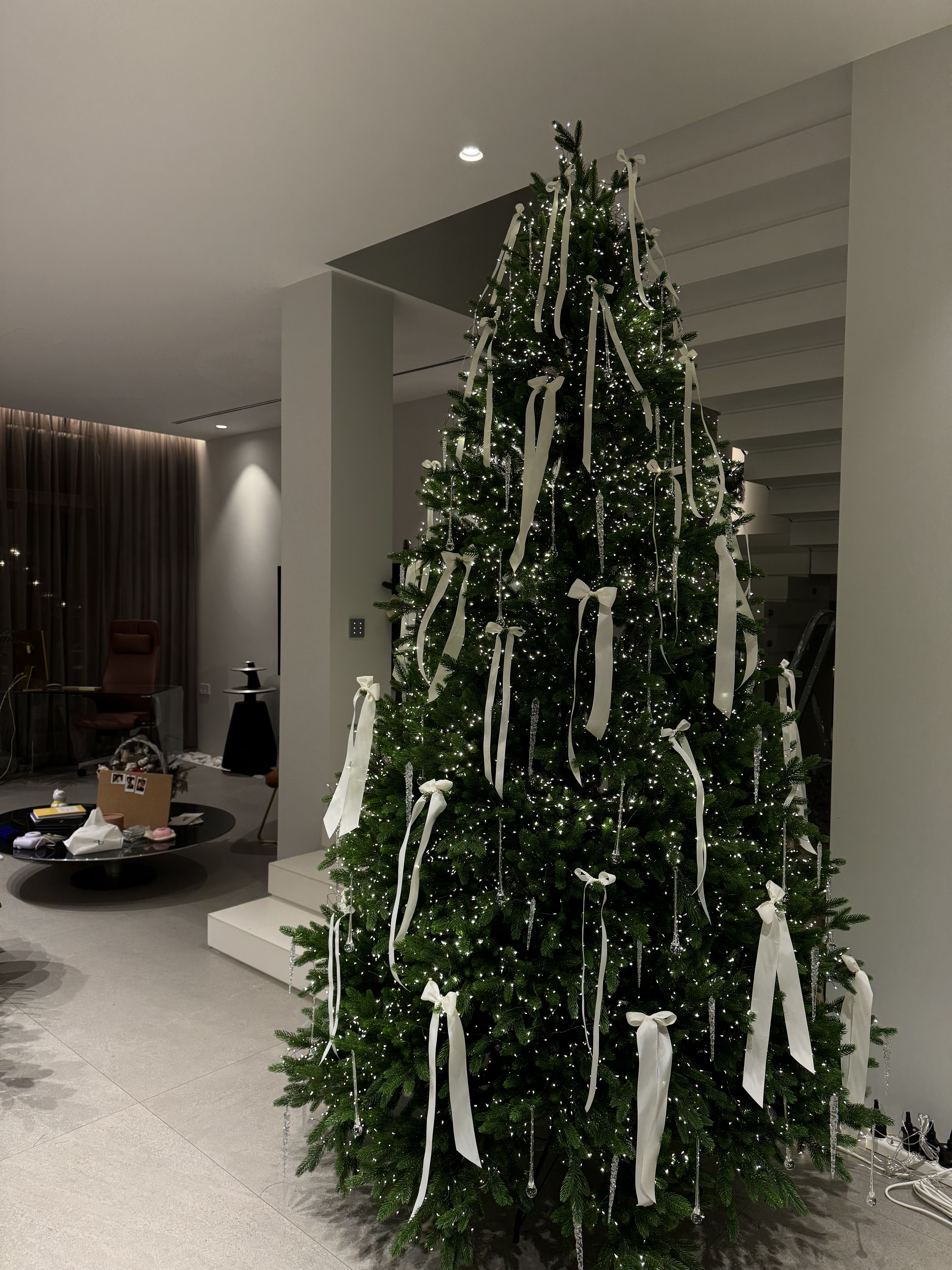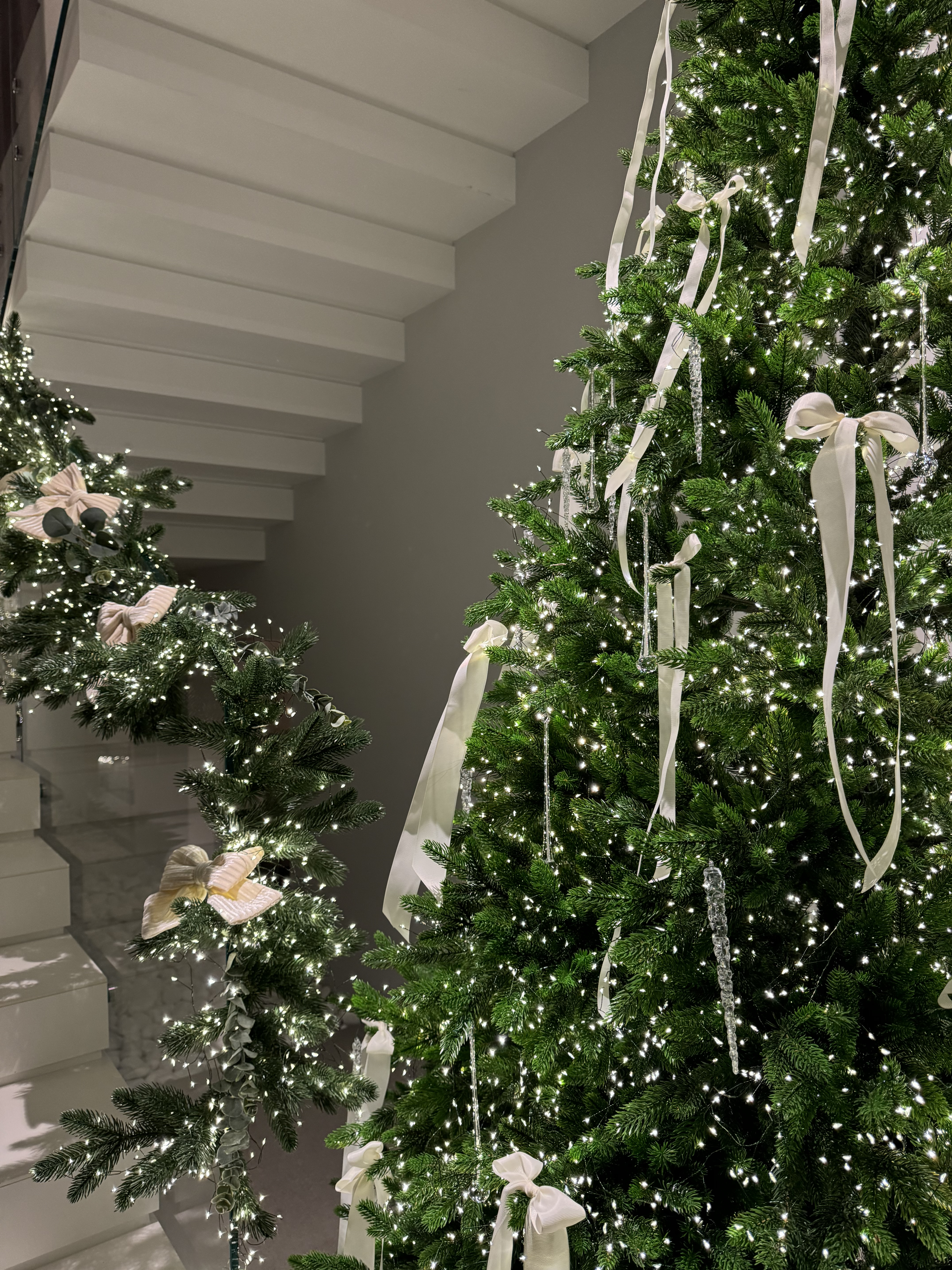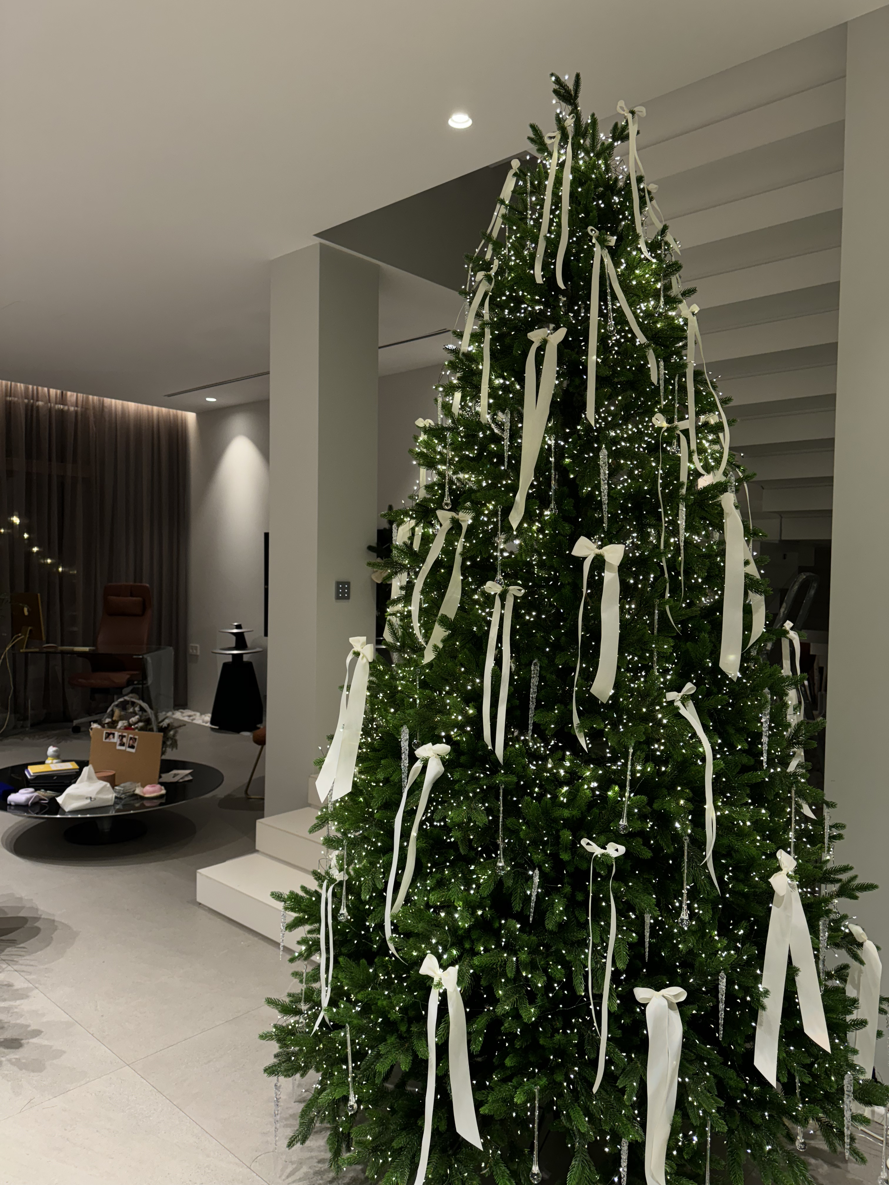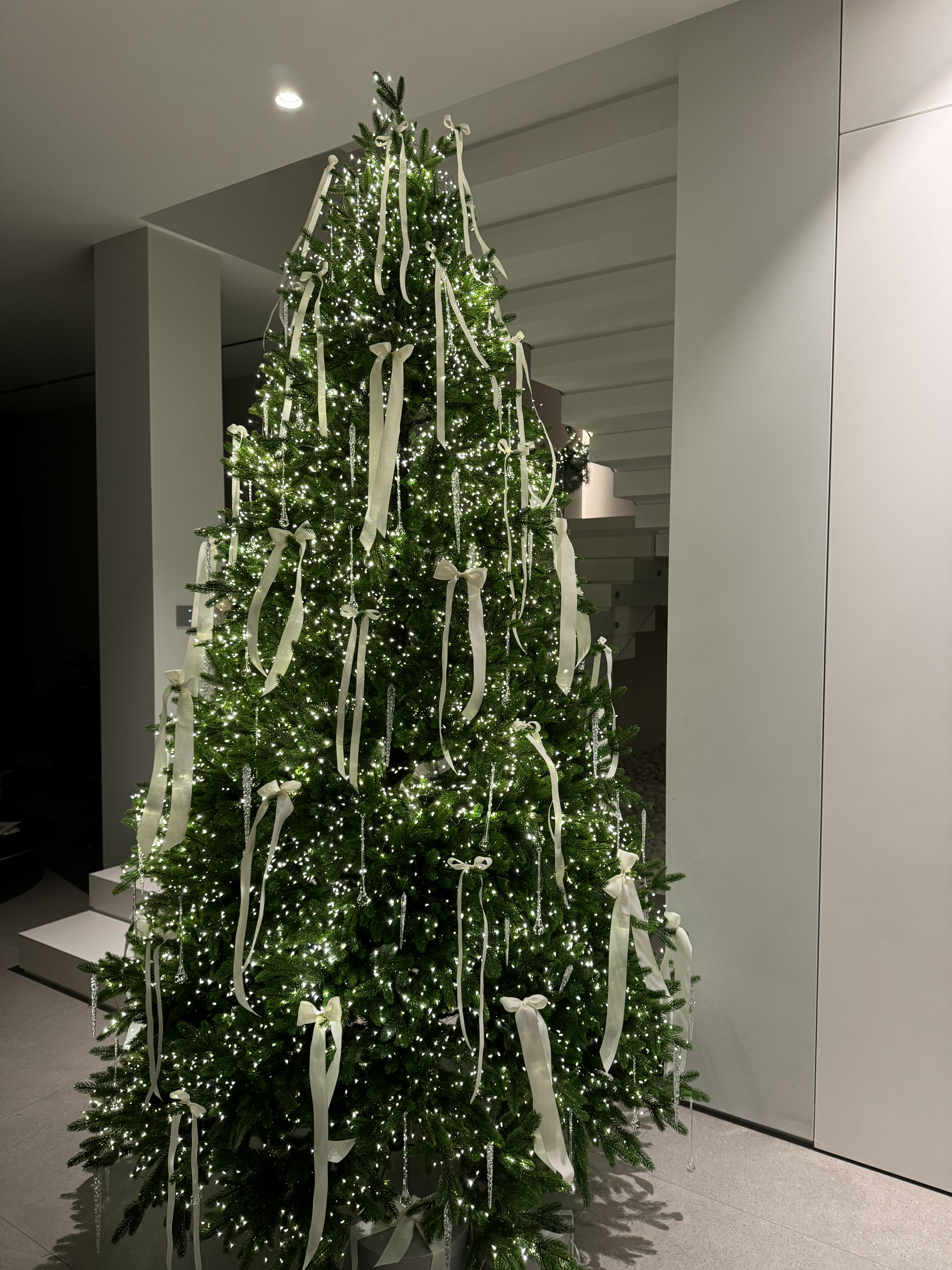 Эта ель — воплощение волшебства и элегантности. Её густая зелёная хвоя из литого материала оживает под сиянием встроенной гирлянды, а украшения в белых и глубоких красных оттенках наполняют интерьер теплом, уютом и атмосферой настоящего торжества. Под елью расположены декоративные подарки, завершающие образ и превращающие её в главный символ праздника.