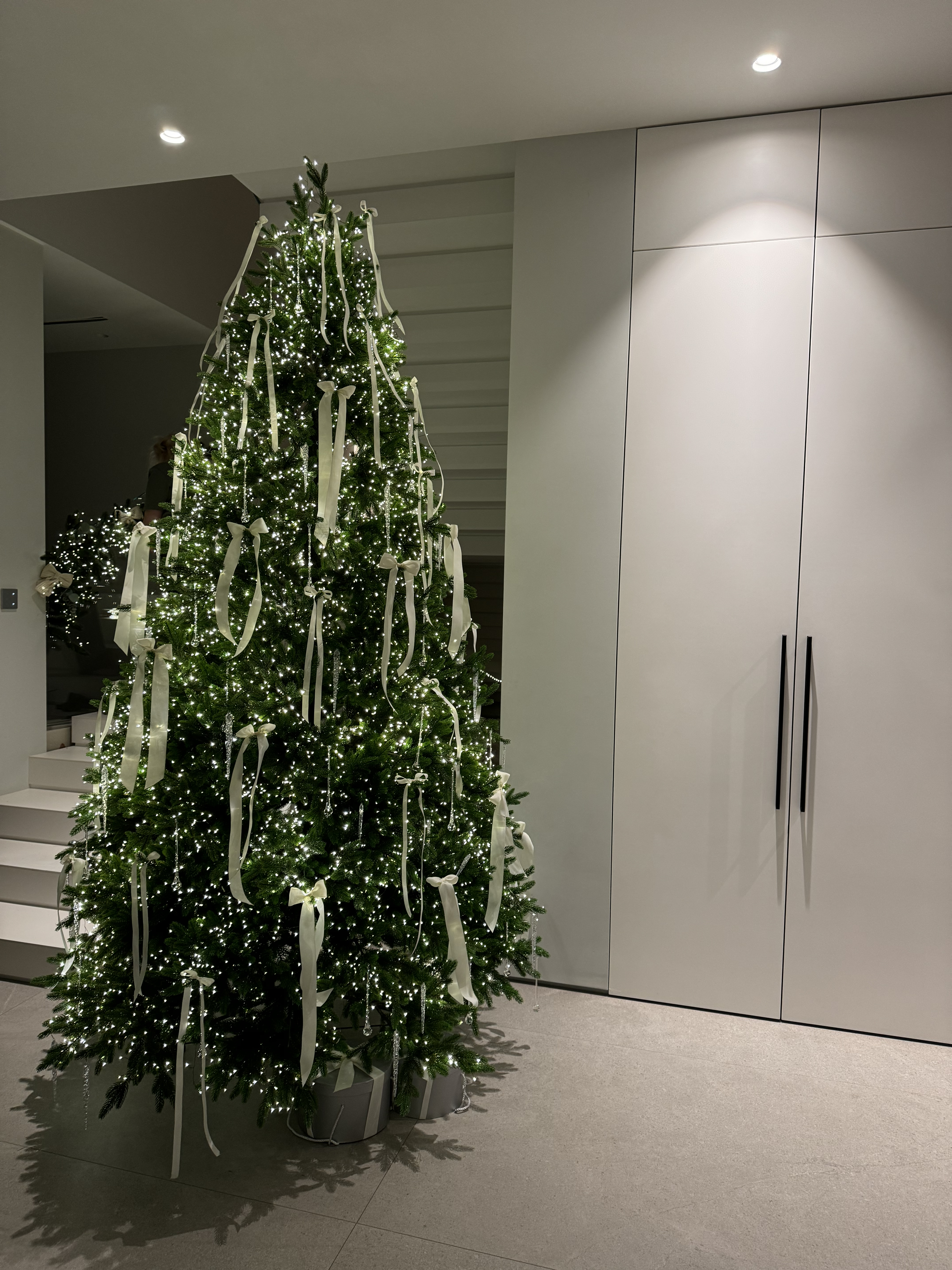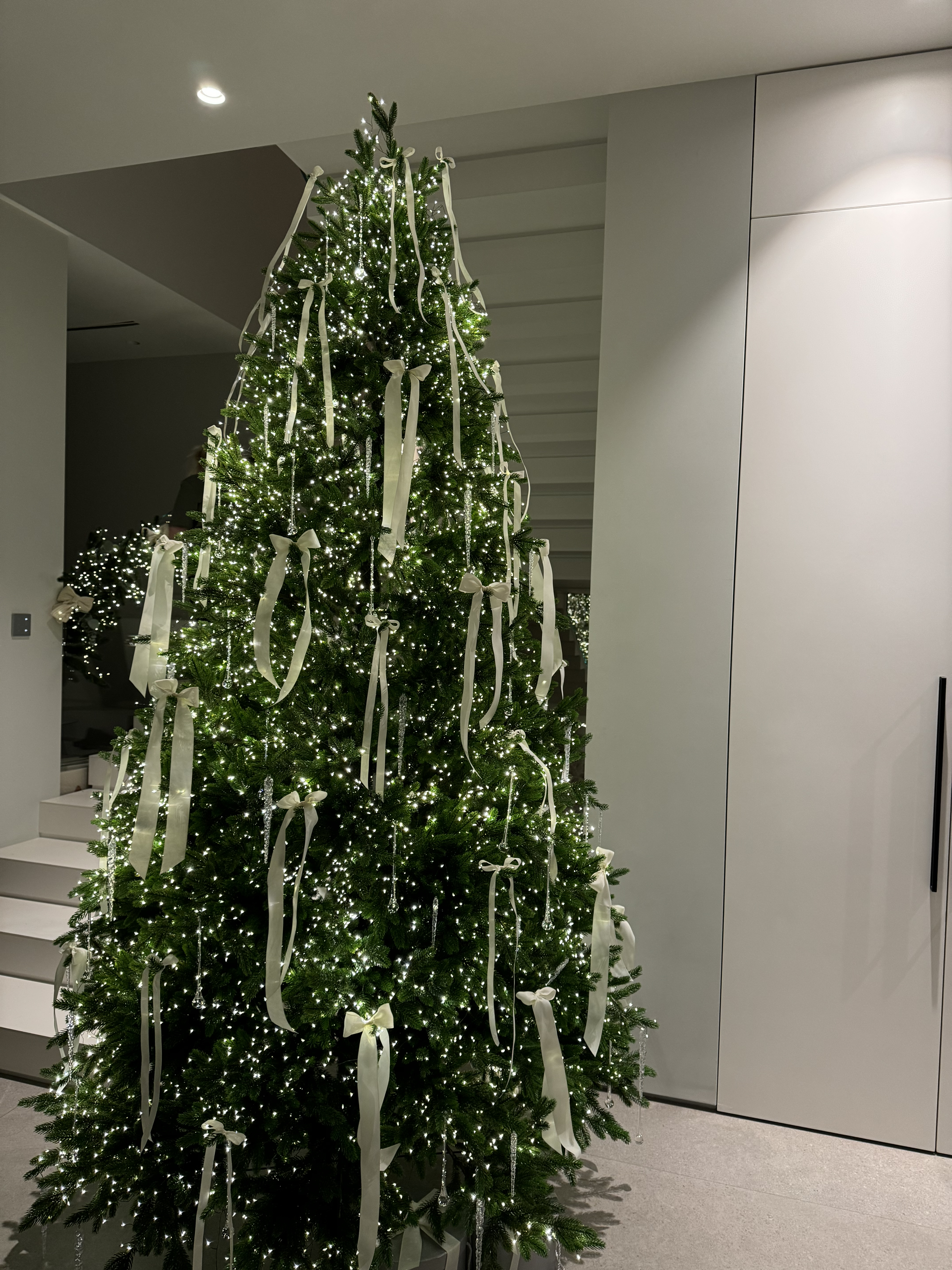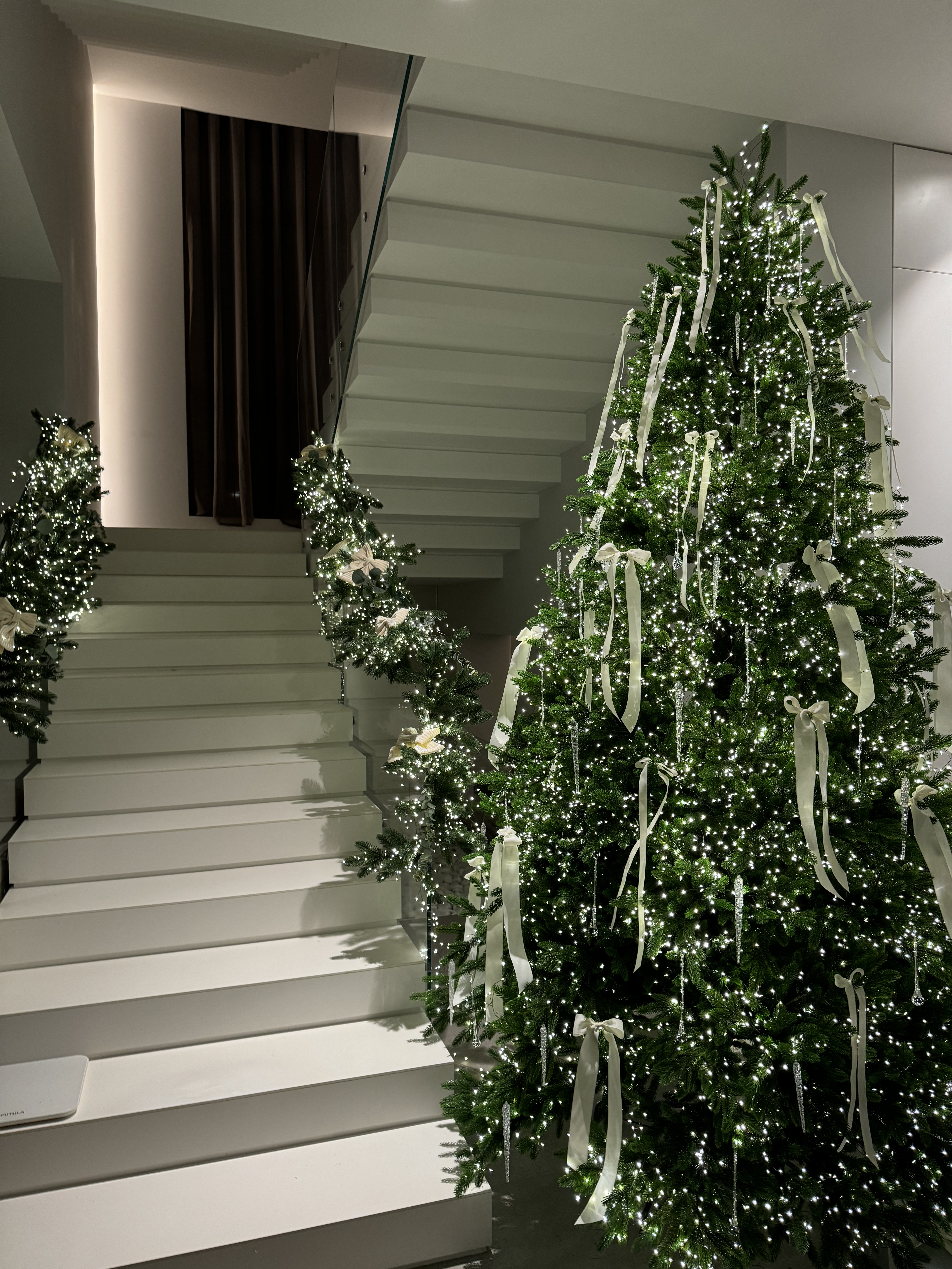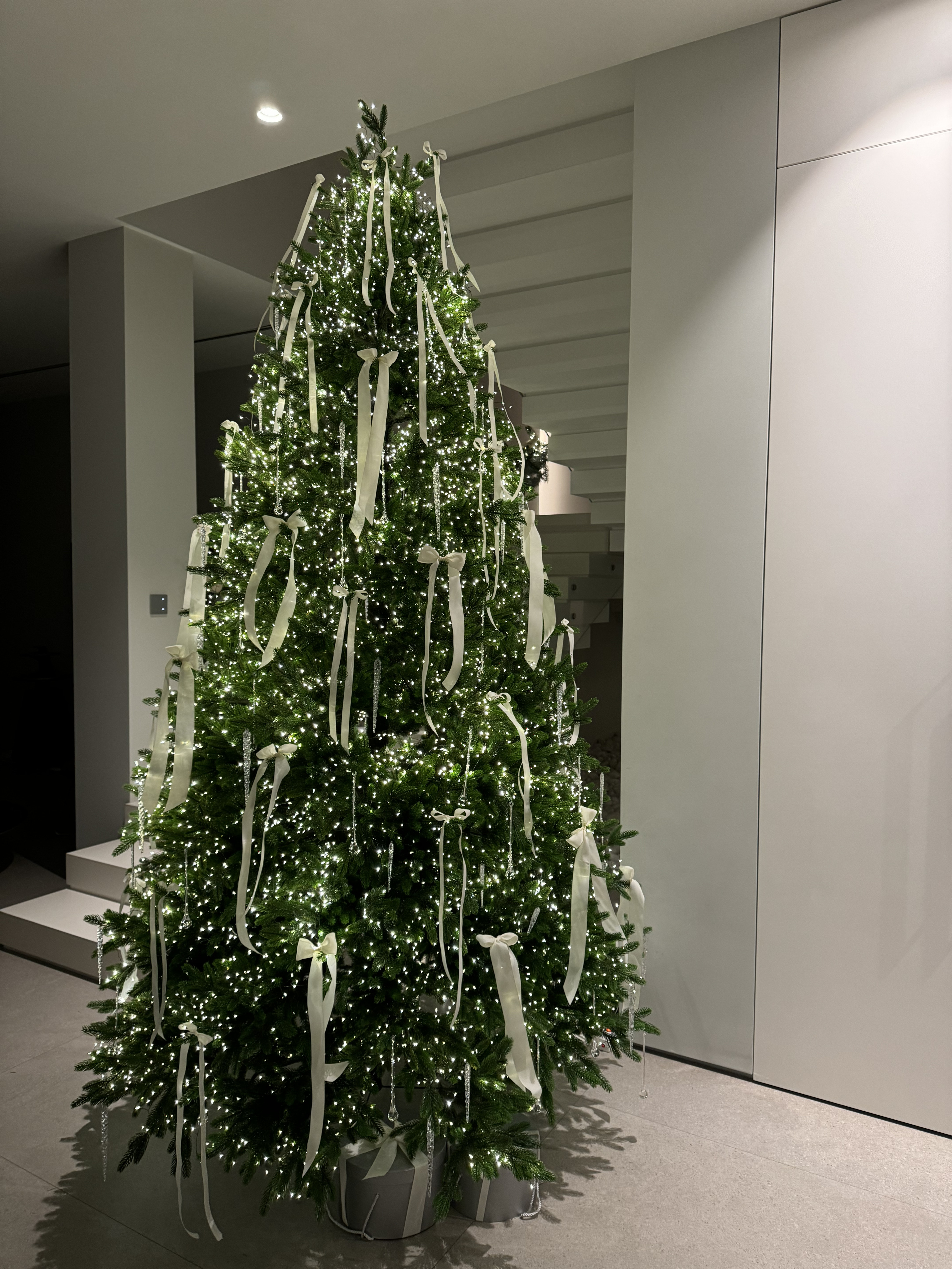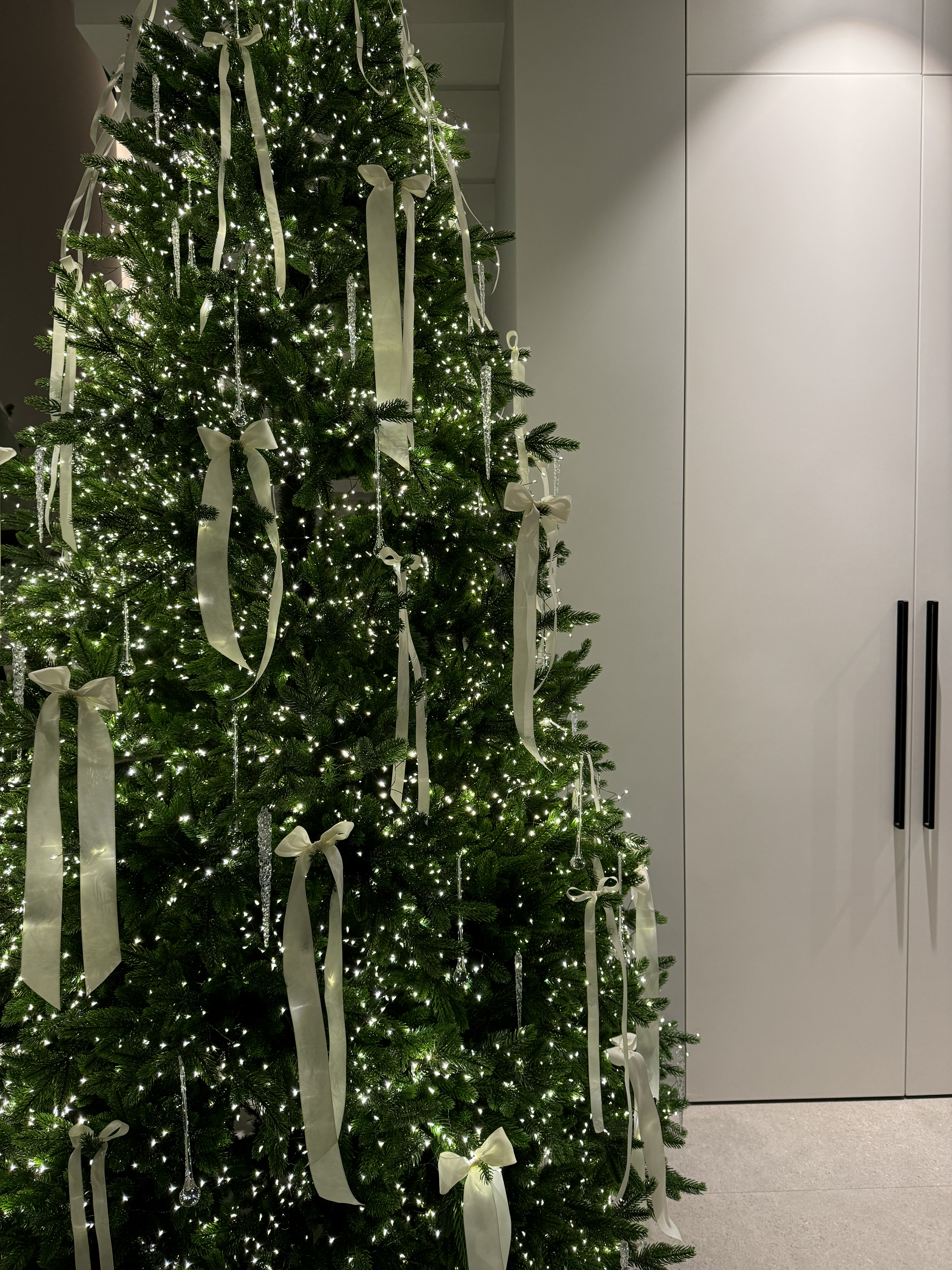 Эта ель — воплощение волшебства и элегантности. Её густая зелёная хвоя из литого материала оживает под сиянием встроенной гирлянды, а украшения в белых и глубоких красных оттенках наполняют интерьер теплом, уютом и атмосферой настоящего торжества. Под елью расположены декоративные подарки, завершающие образ и превращающие её в главный символ праздника.