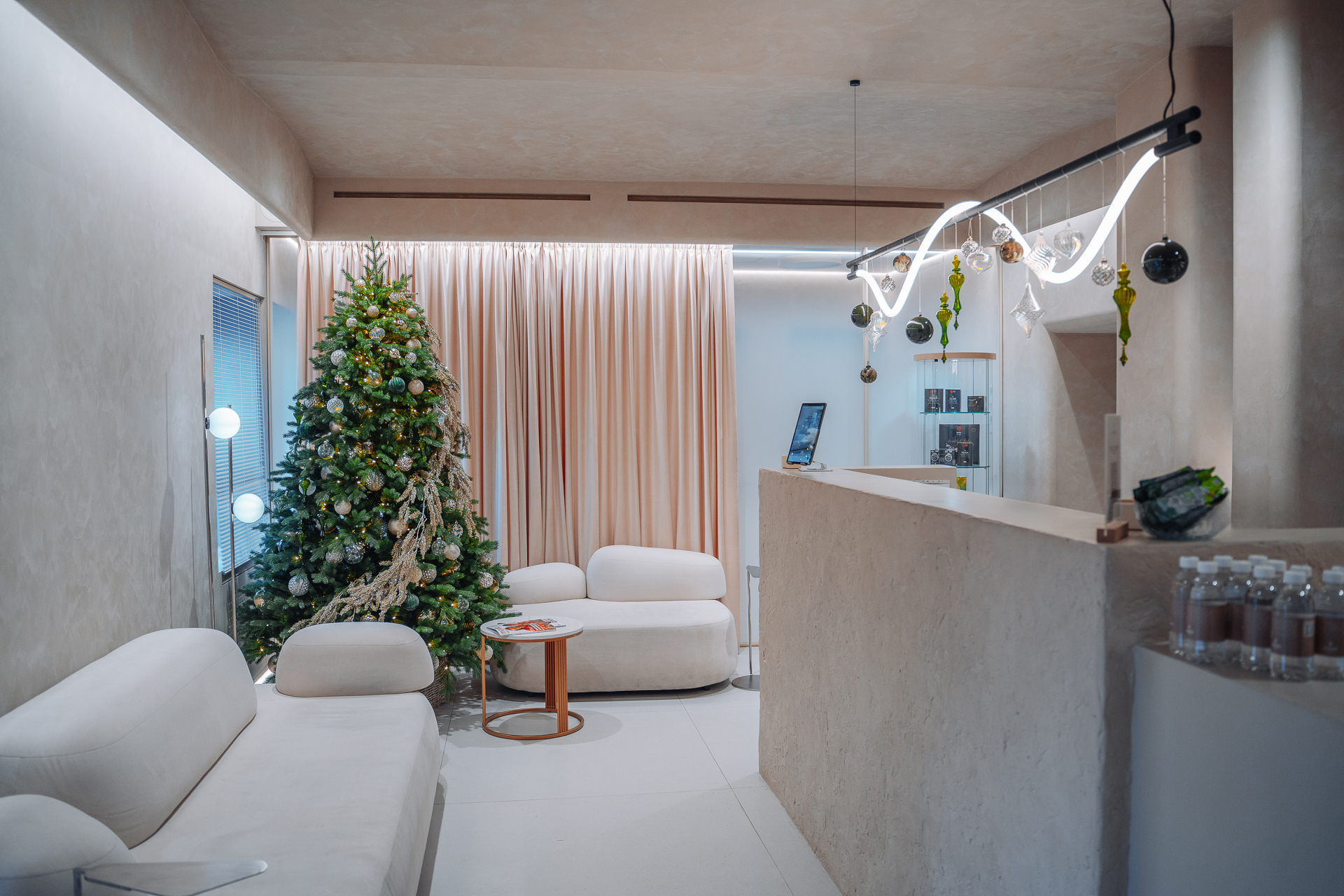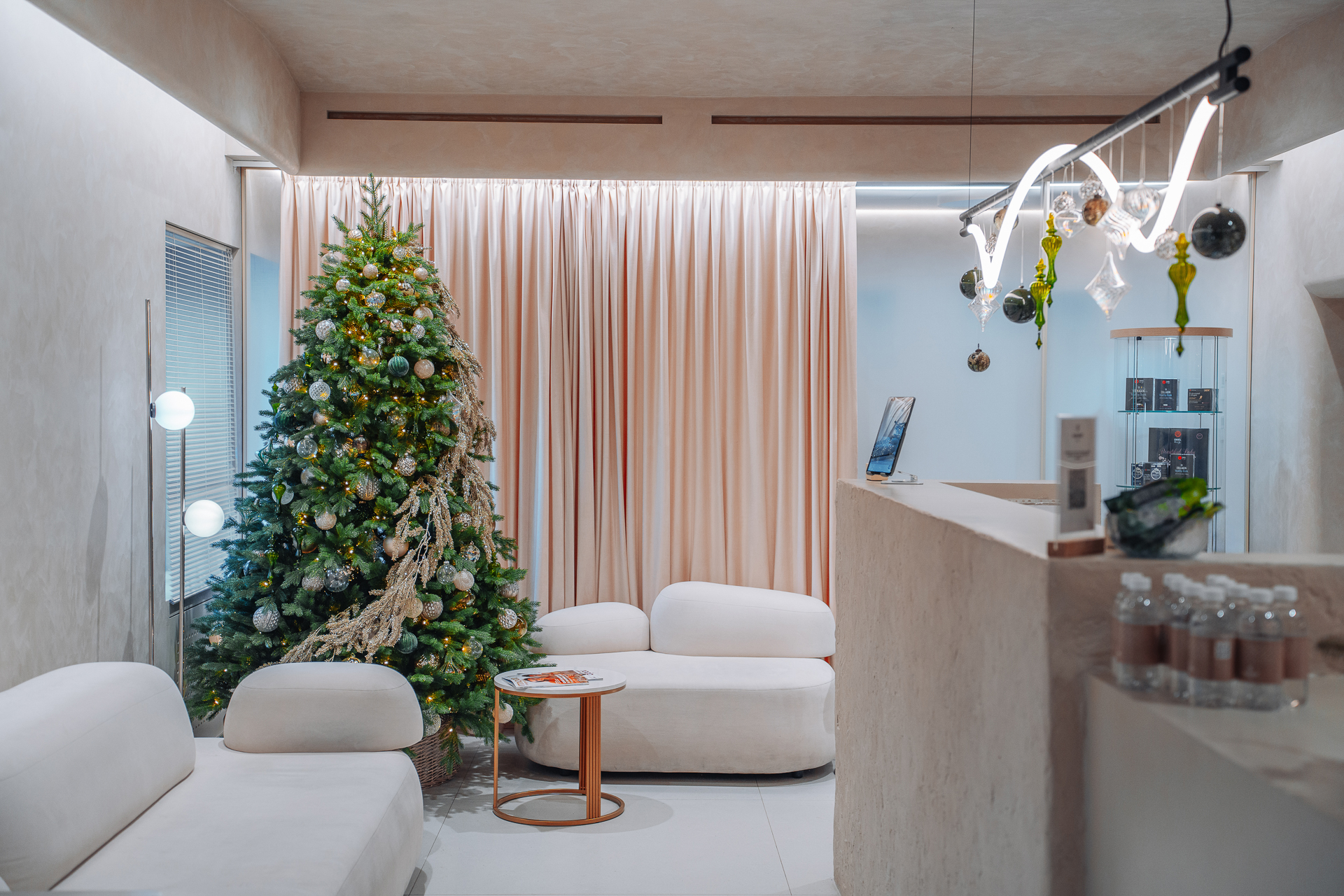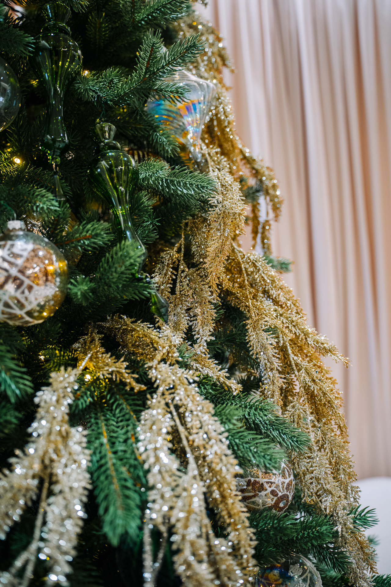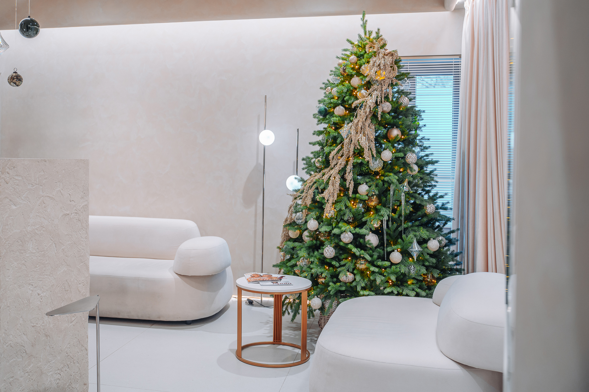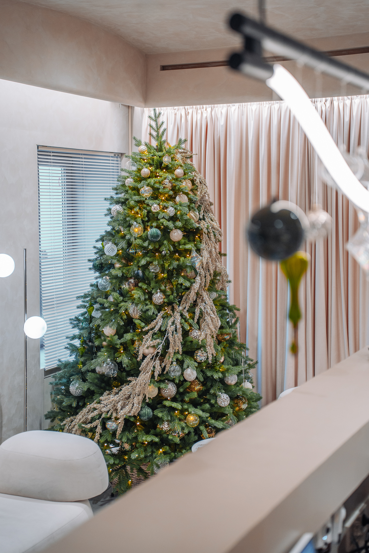 Эта ель — воплощение волшебства и элегантности. Её густая зелёная хвоя из литого материала оживает под сиянием встроенной гирлянды, а украшения в белых и глубоких красных оттенках наполняют интерьер теплом, уютом и атмосферой настоящего торжества. Под елью расположены декоративные подарки, завершающие образ и превращающие её в главный символ праздника.