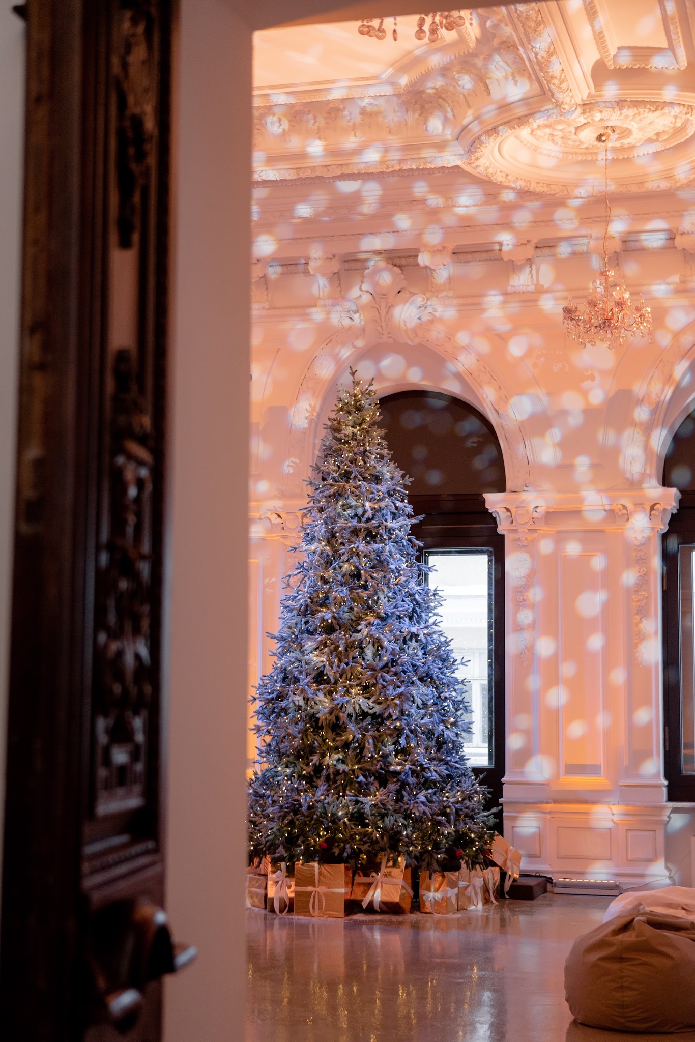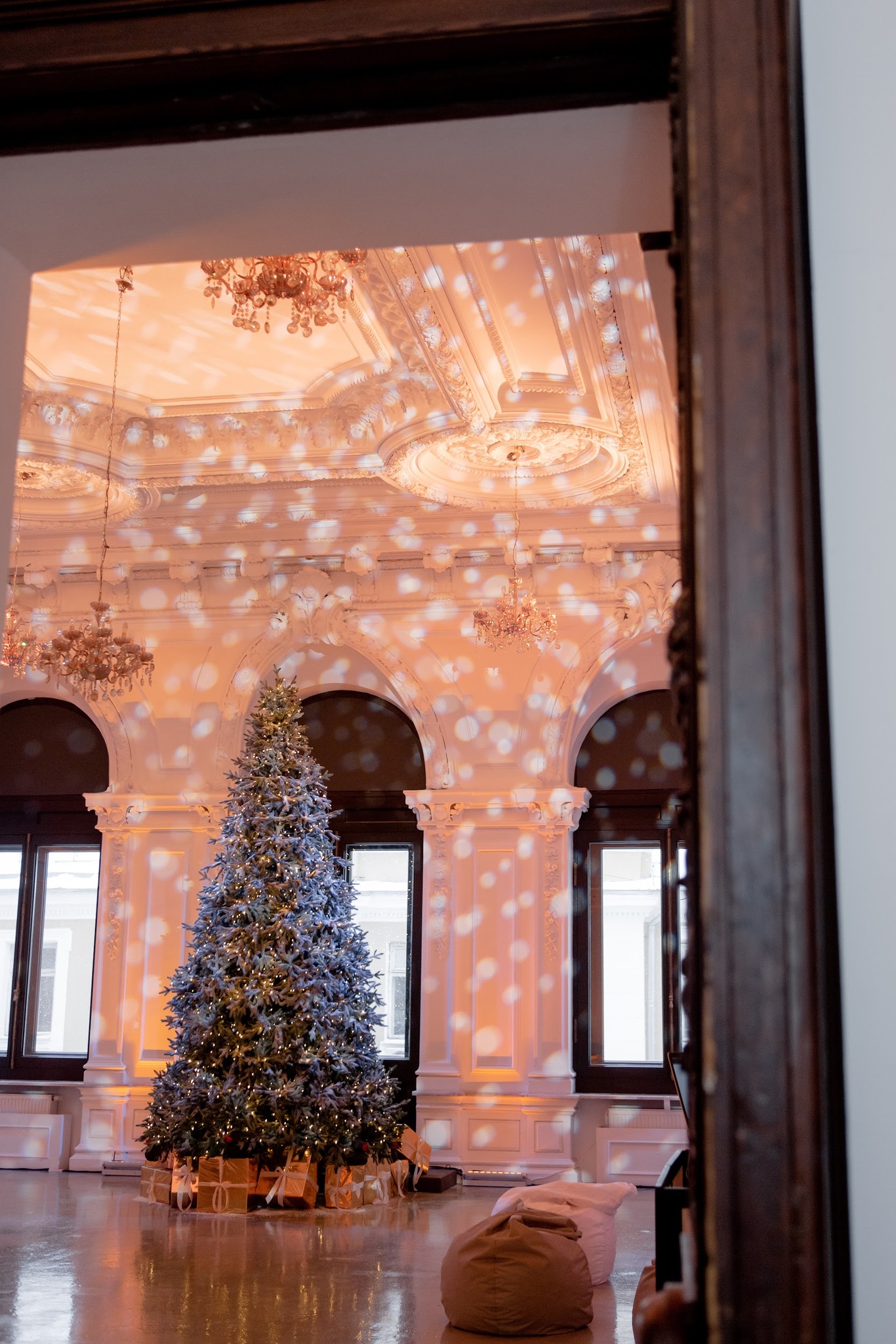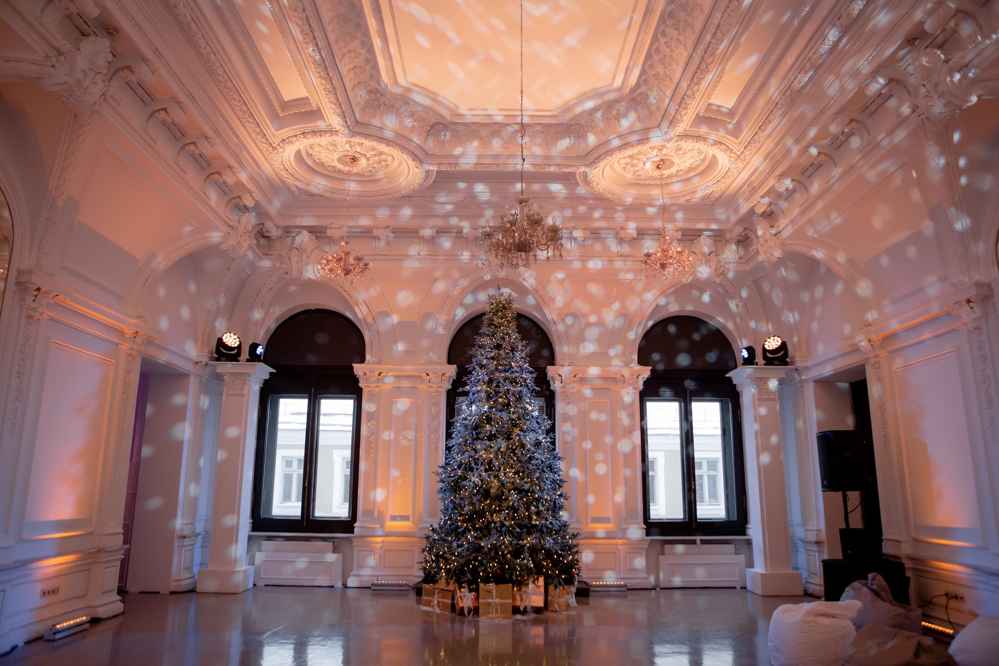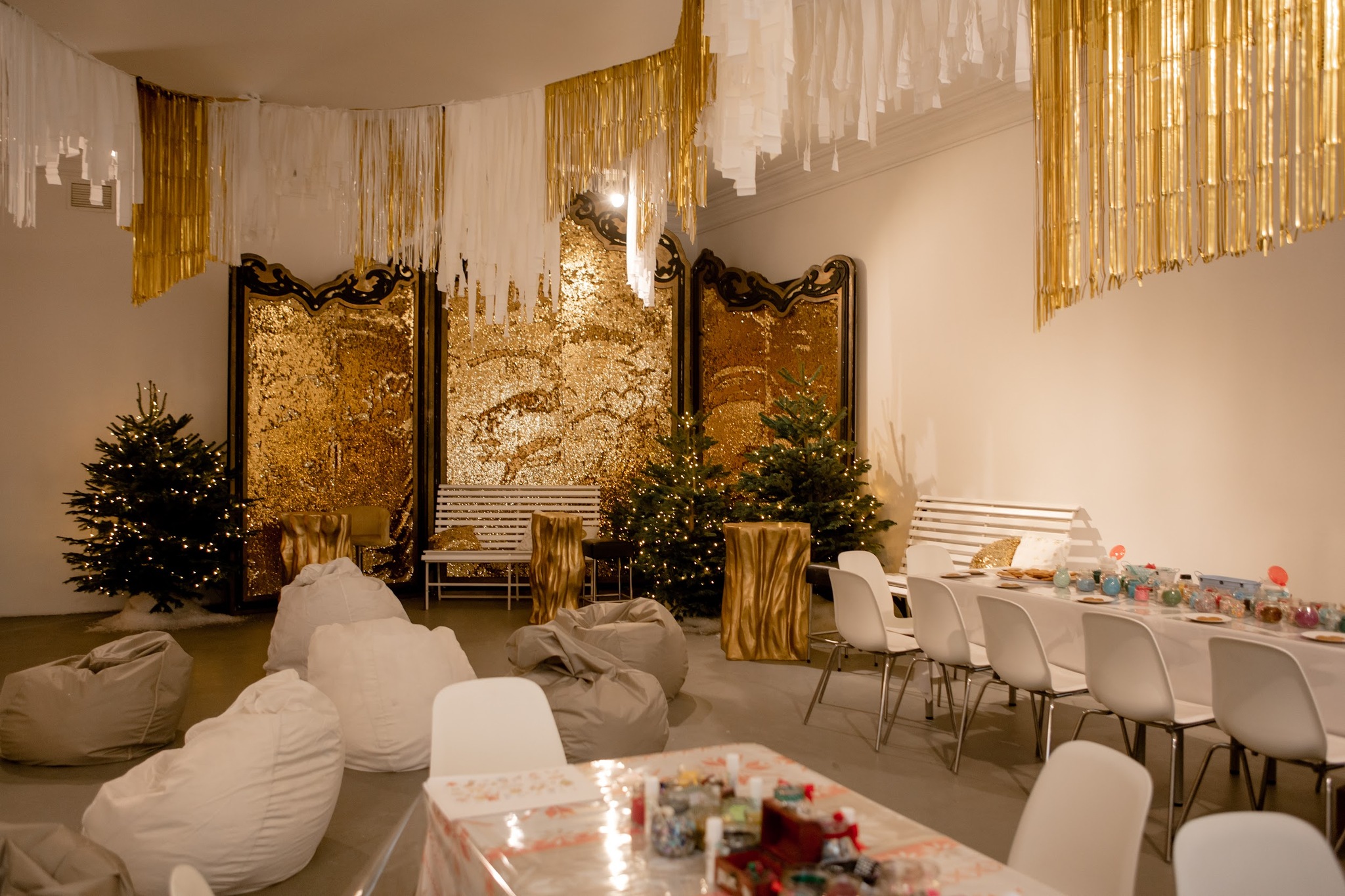 Шикарный и волшебный корпоратив для банка. Мы оформили его в стиле сказочного бала Щелкунчика: две фигуры в полный рост встречали гостей на входе, а в центре зала всех ждала огромная ёлка. Для менее официальной части мы сделали игровую комнату в более современном стиле.
