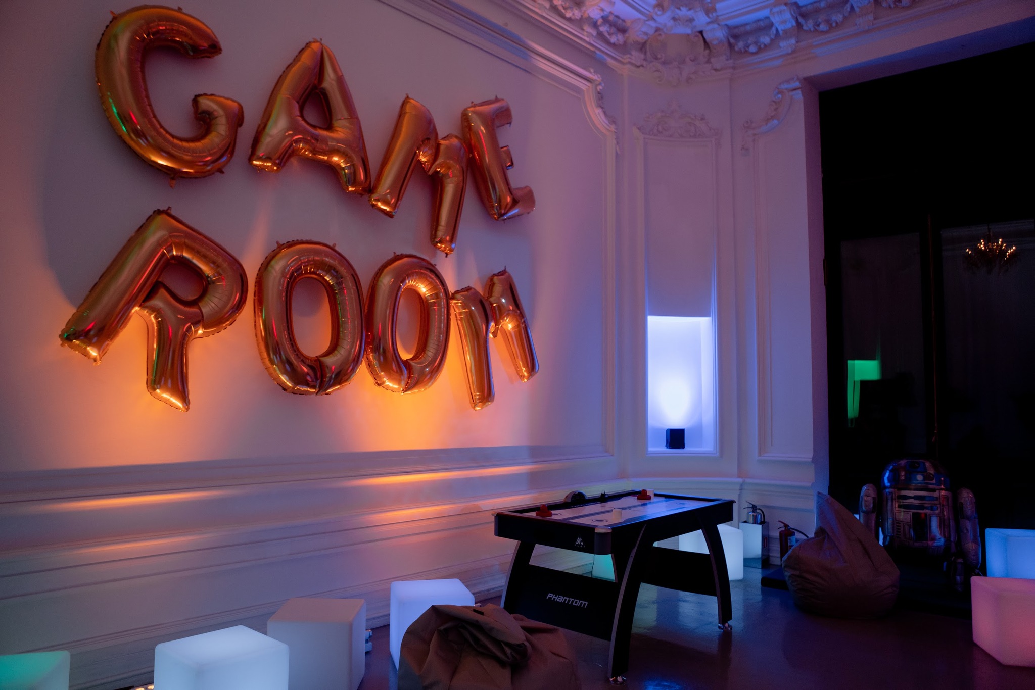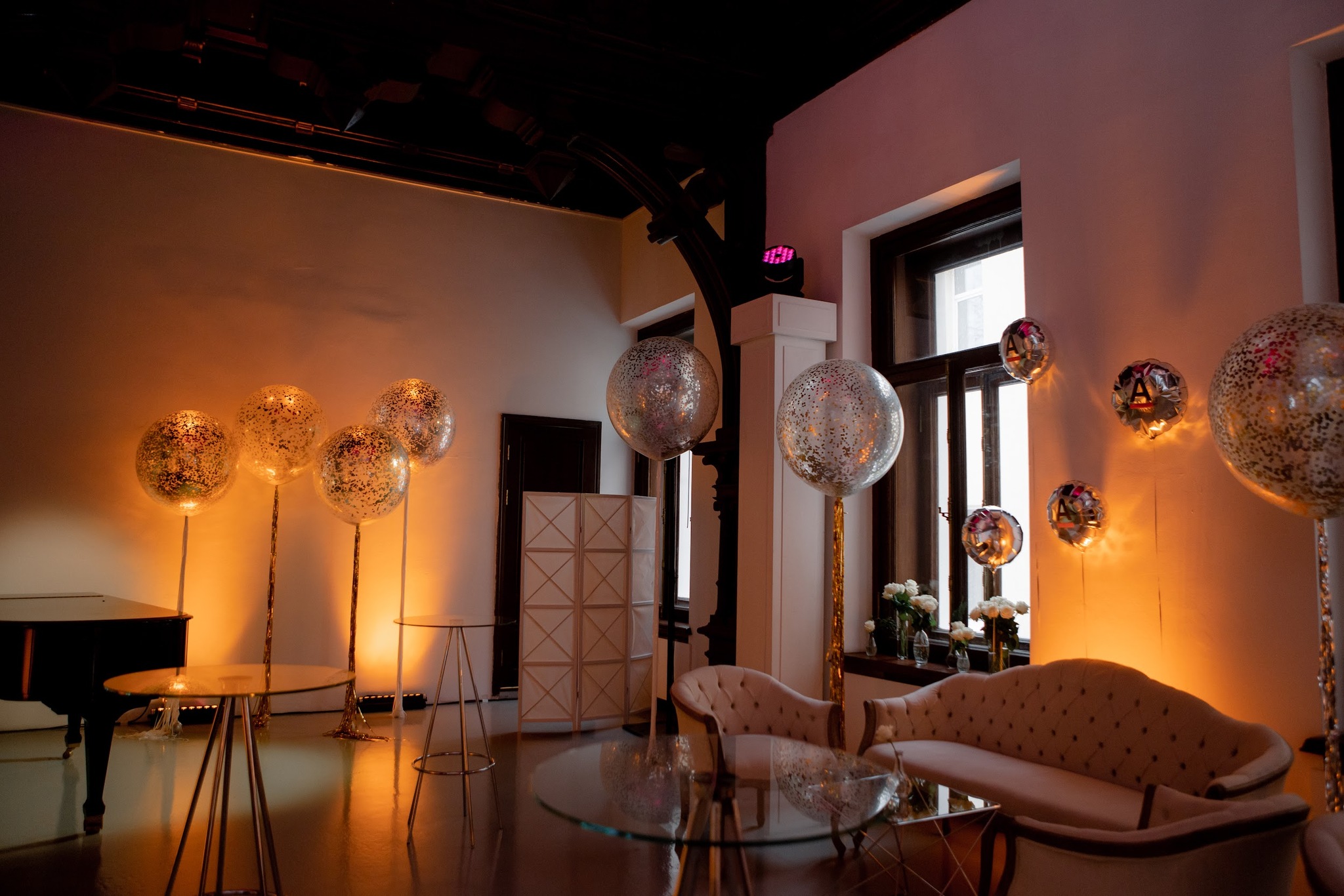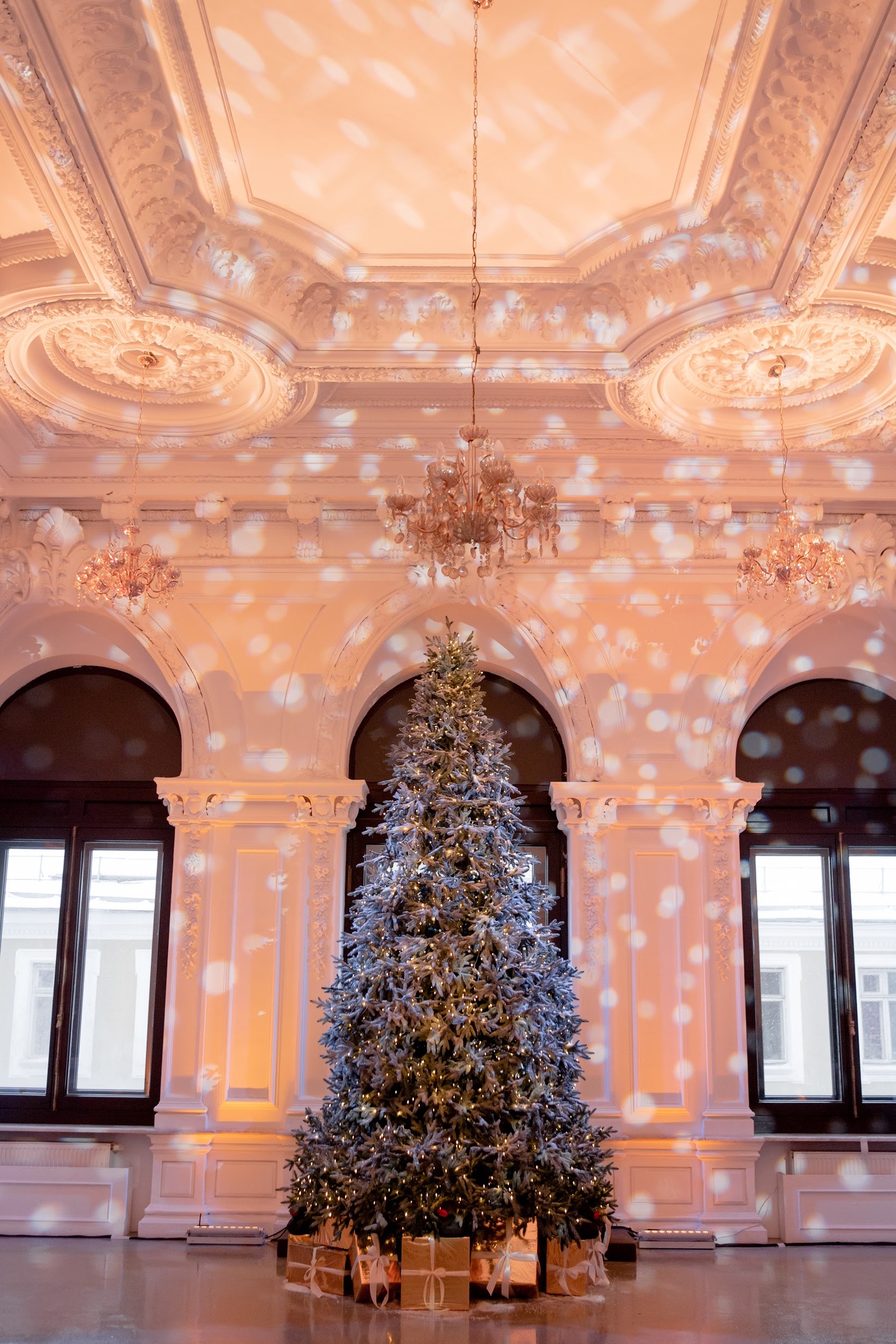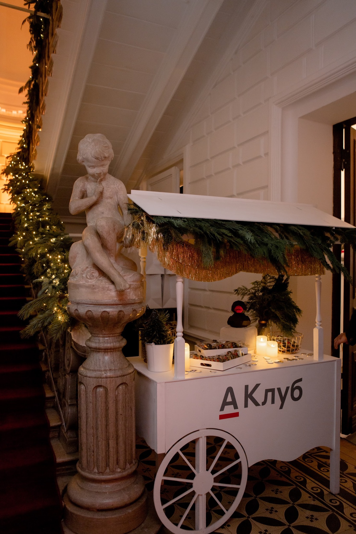 Шикарный и волшебный корпоратив для банка. Мы оформили его в стиле сказочного бала Щелкунчика: две фигуры в полный рост встречали гостей на входе, а в центре зала всех ждала огромная ёлка. Для менее официальной части мы сделали игровую комнату в более современном стиле.
