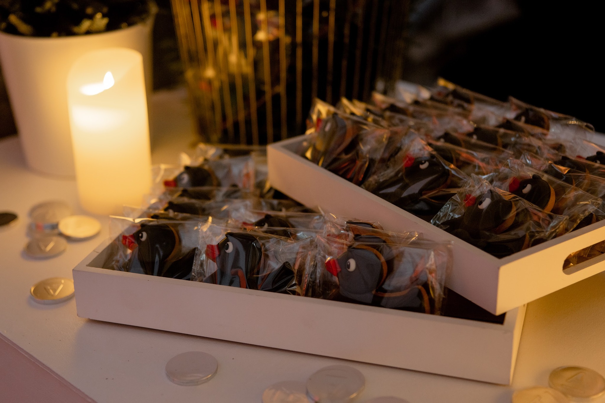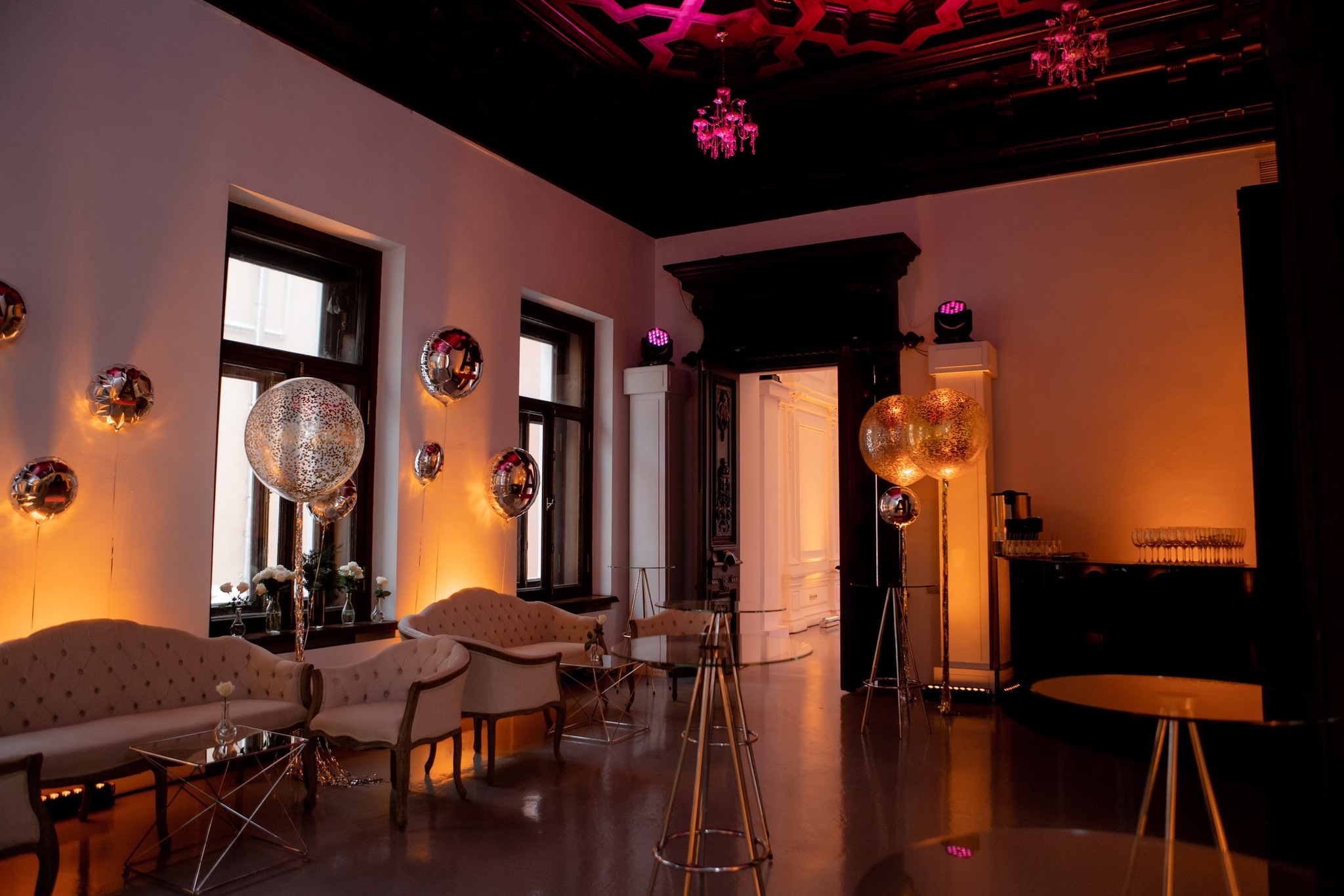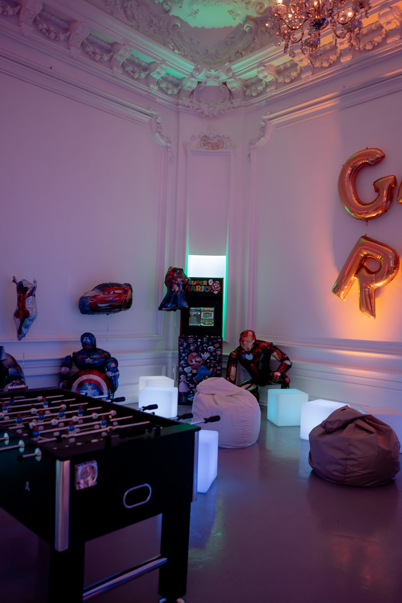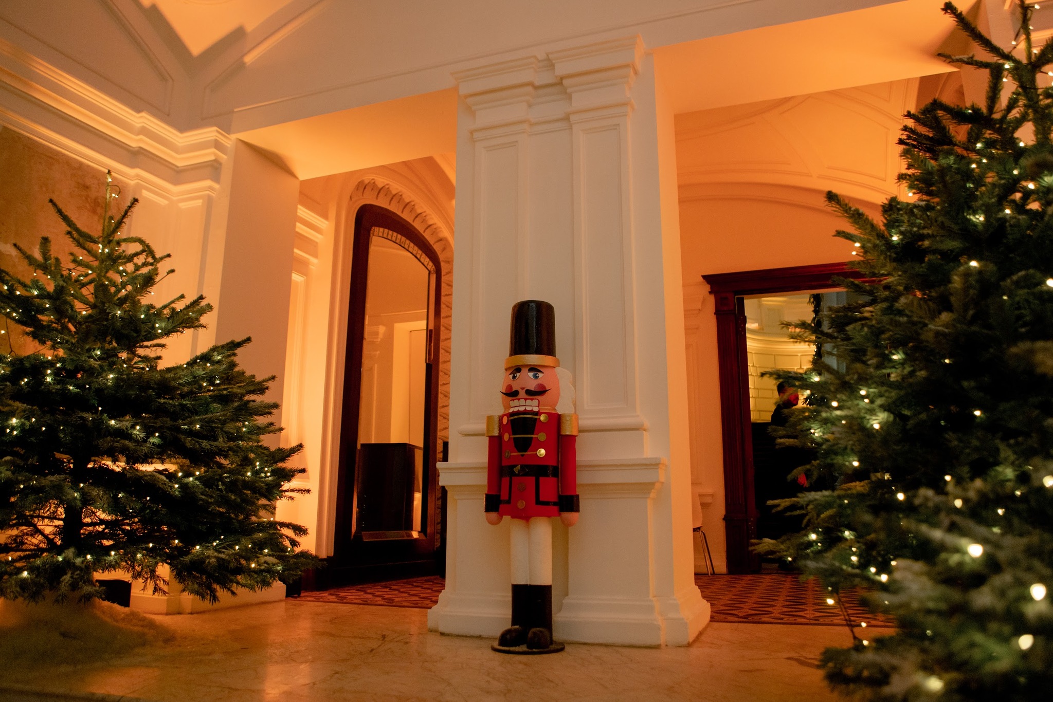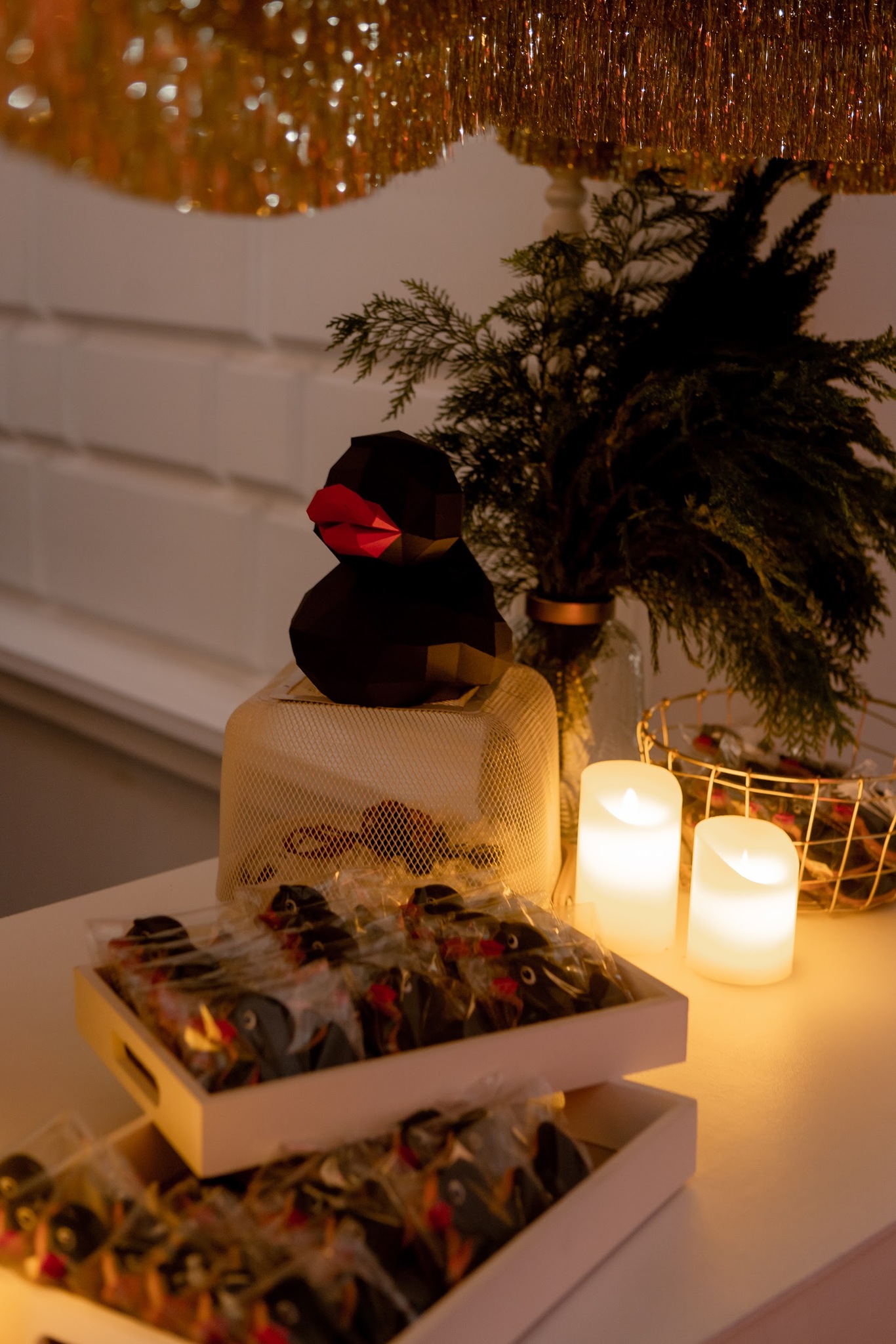 Шикарный и волшебный корпоратив для банка. Мы оформили его в стиле сказочного бала Щелкунчика: две фигуры в полный рост встречали гостей на входе, а в центре зала всех ждала огромная ёлка. Для менее официальной части мы сделали игровую комнату в более современном стиле.