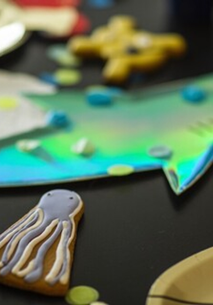 Огромный корабль, украсит центр стола, а посуда идеально подойдет для поедания тематических лакомств от трудолюбивых кондитеров.