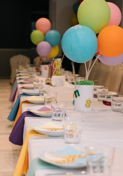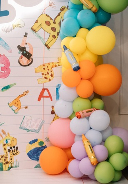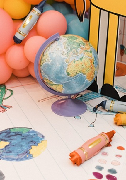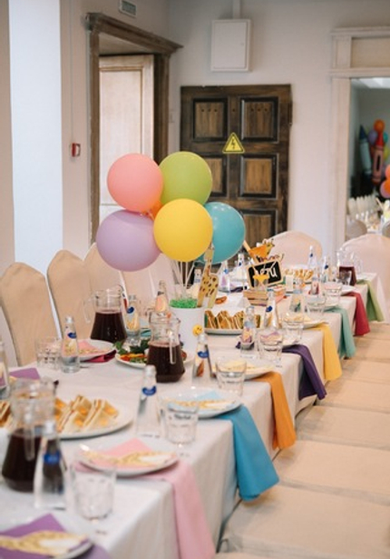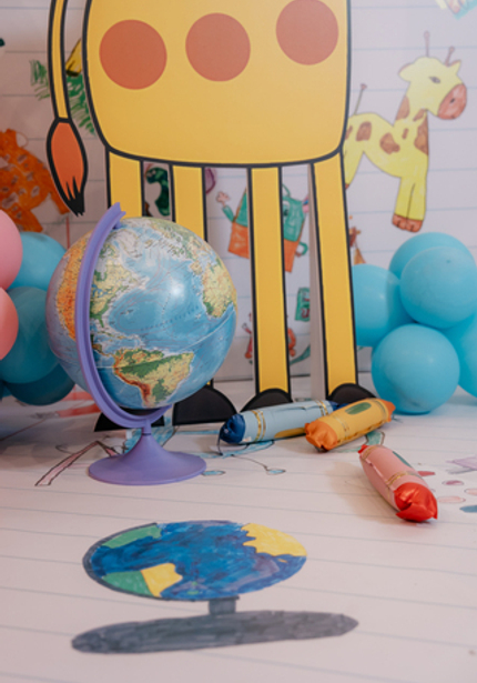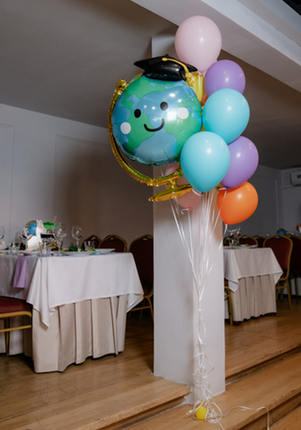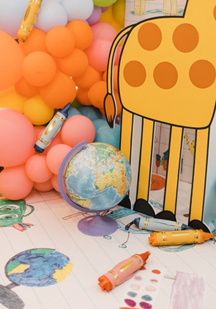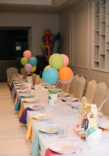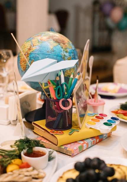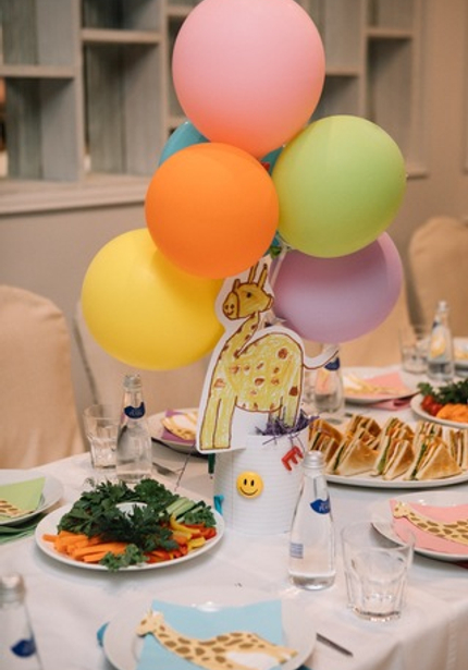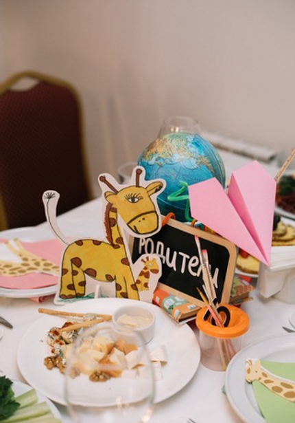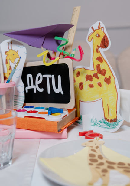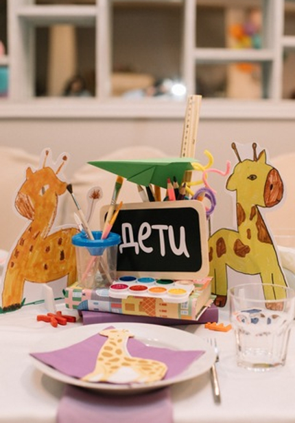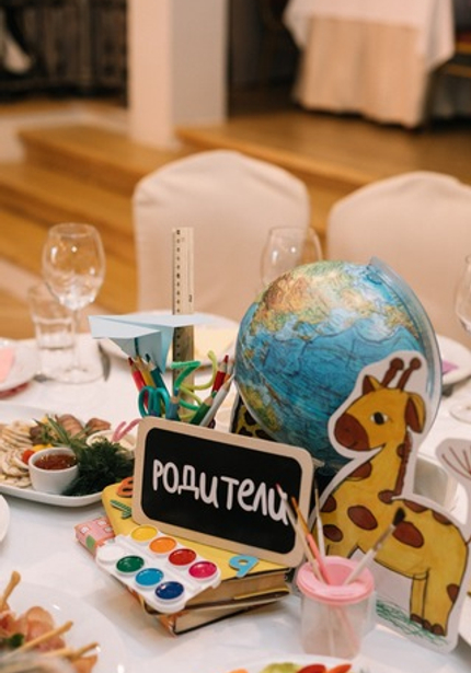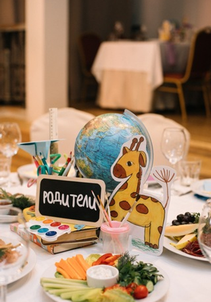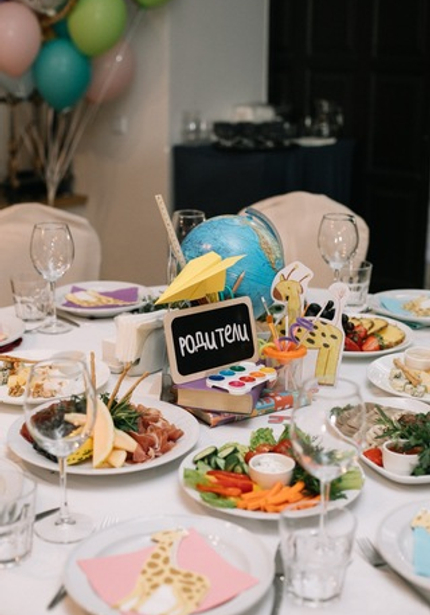 А мы добавили к фотозоне шары-карандаши, глобус и яркую воздушную гирлянду. Кстати, столы мы тоже украсили детскими рисунками, а ещё добавили салфетки всех цветов радуги к нашей сервировке.