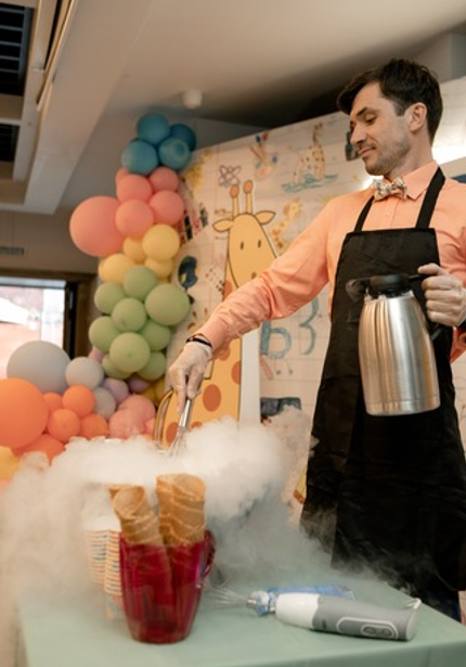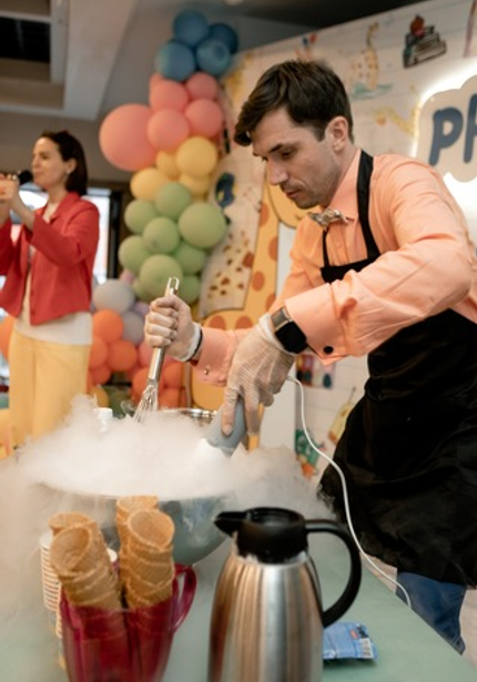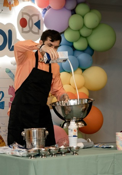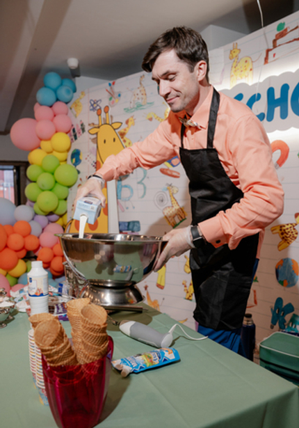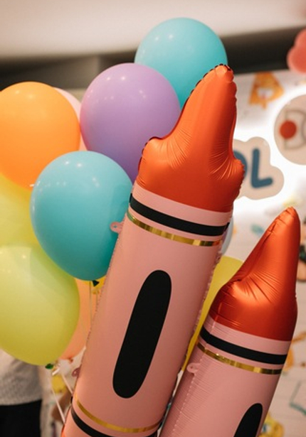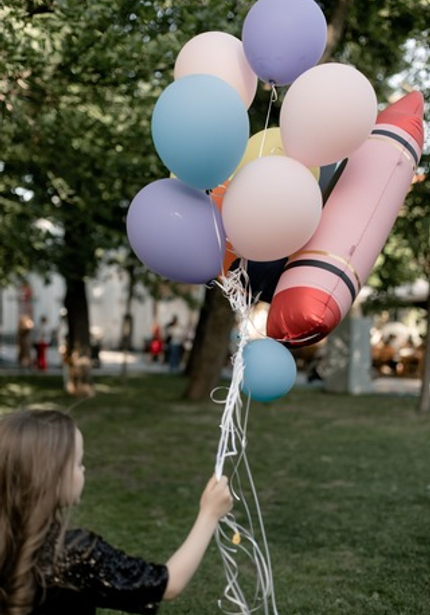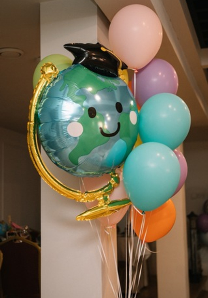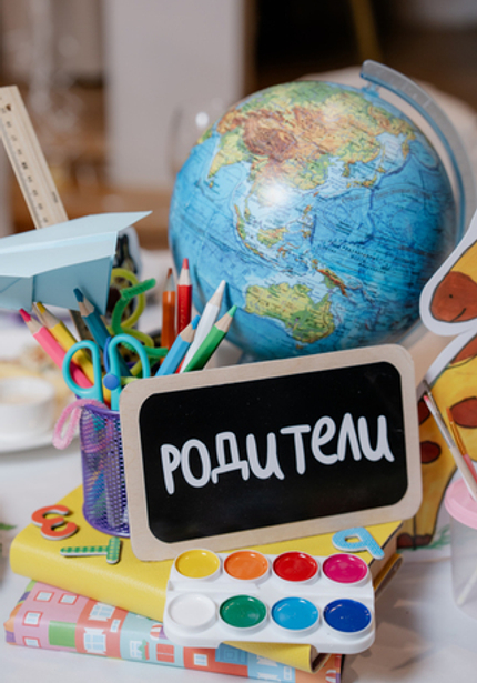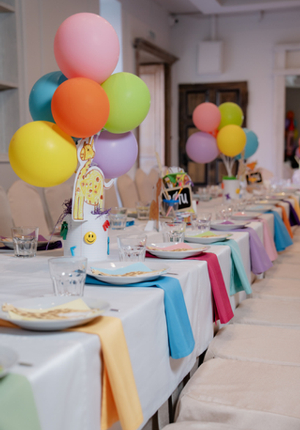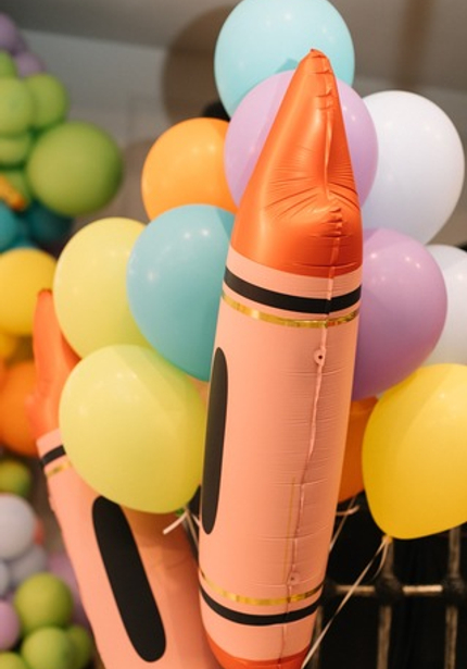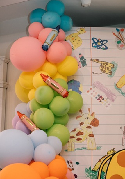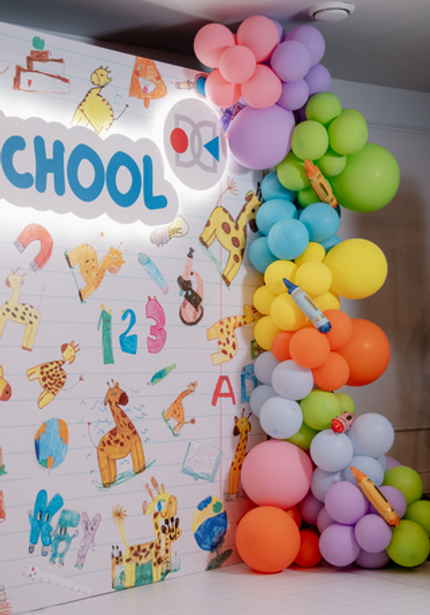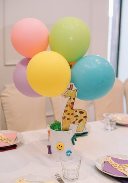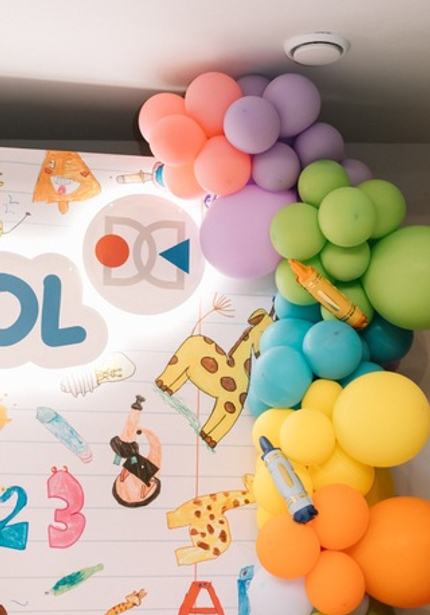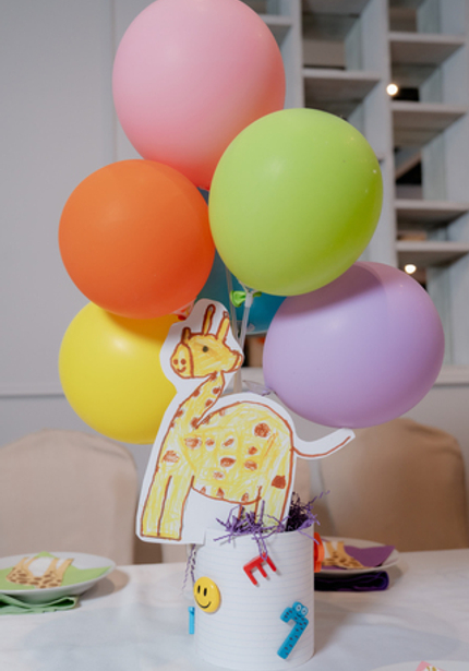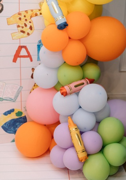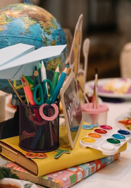 А мы добавили к фотозоне шары-карандаши, глобус и яркую воздушную гирлянду. Кстати, столы мы тоже украсили детскими рисунками, а ещё добавили салфетки всех цветов радуги к нашей сервировке.