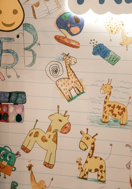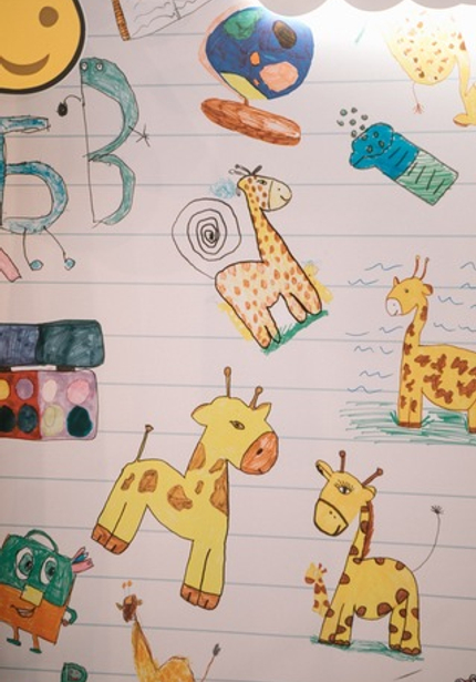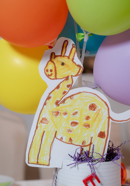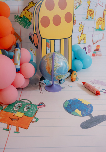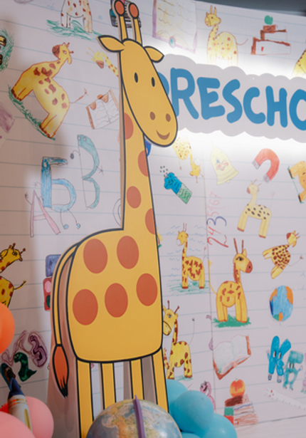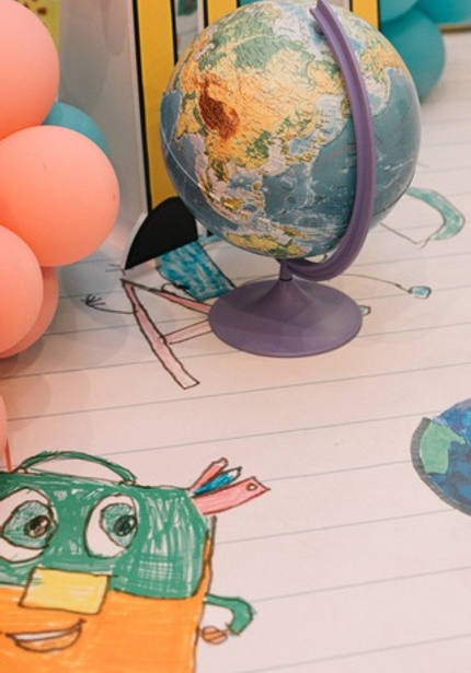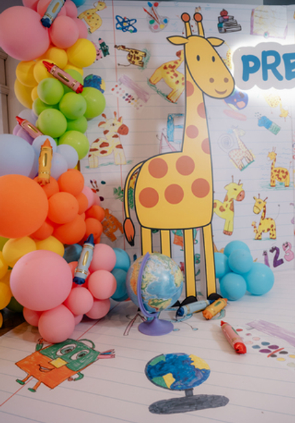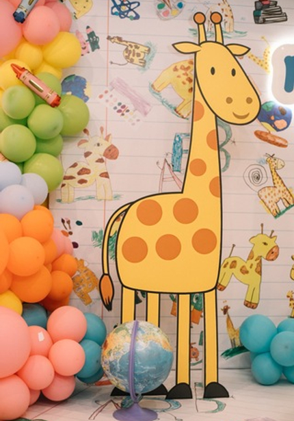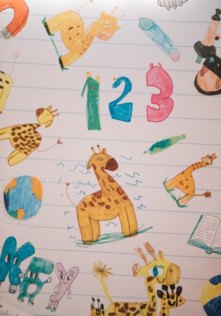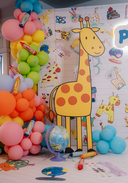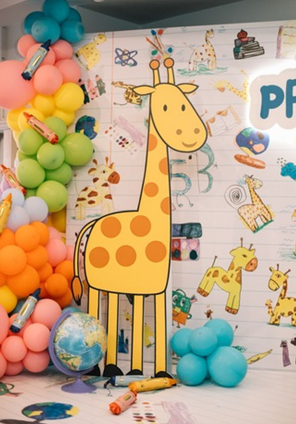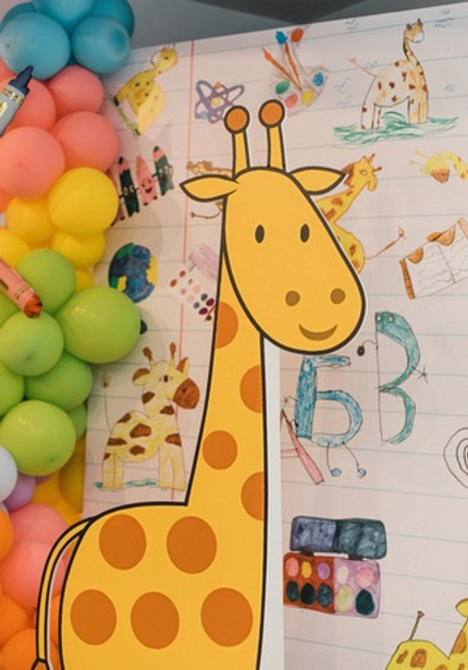 Мы попросили детишек нарисовать жирафов и другие символы, которые ассоциируются у них с учёбой и знаниями. Получились очень много милых рисунков, которые мы отсканировали, чтобы создать классную фотозону.