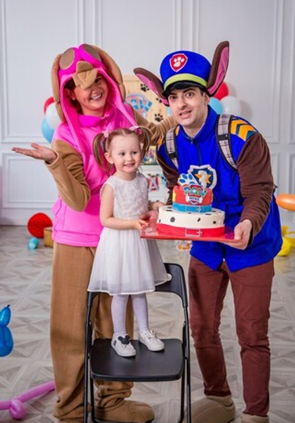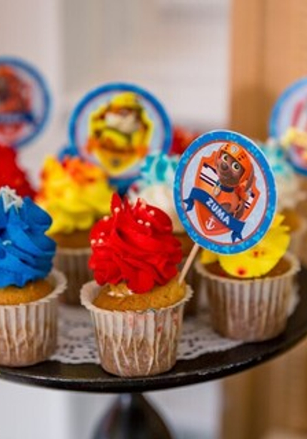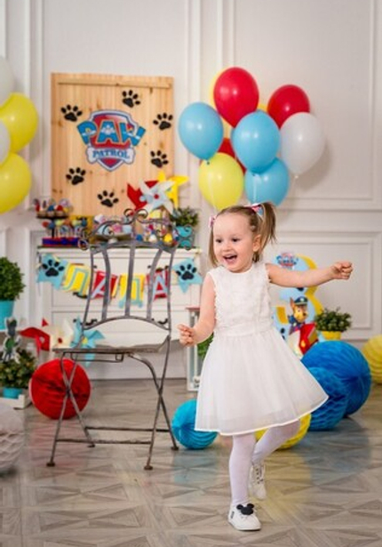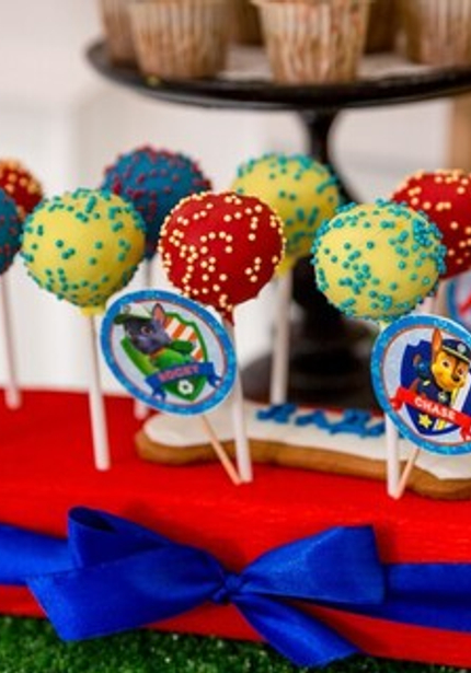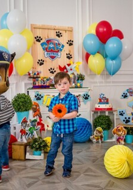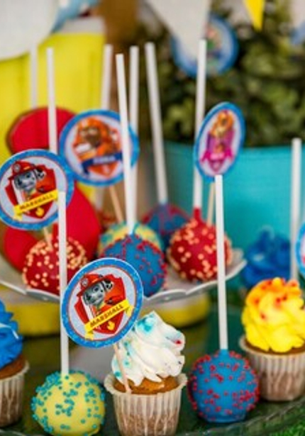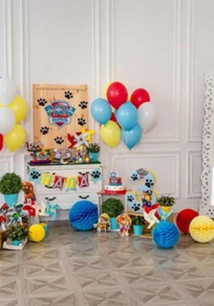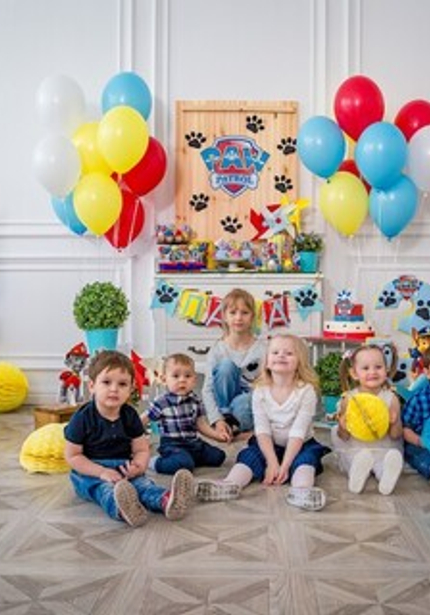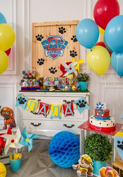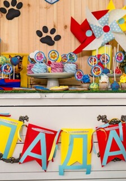 Сложно найти малышей, которым бы не нравился мультфильм «Щенячий патруль». Прелесть этой тематики в яркой цветовой гамме: желтый, голубой, белый, красный! Женя украсила все множеством ярких шаров, бумажных вертушек и шариков-сот. А Таня приготовила свои волшебные угощения: тематический тортик, яркие кейк-попсы, печенье и множество других невиданных сладостей. Посмотрите, сколько фигурок украсило праздник – здесь все любимые герои детей, а еще множество весенней зелени в горшочках.