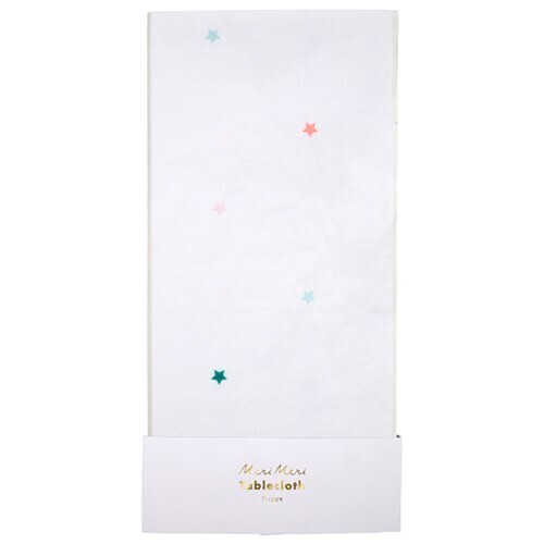 Светлая скатерть со звездочками станет стильным и ненавязчивым фоном к яркой сервировке.