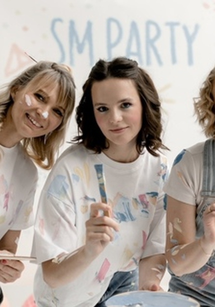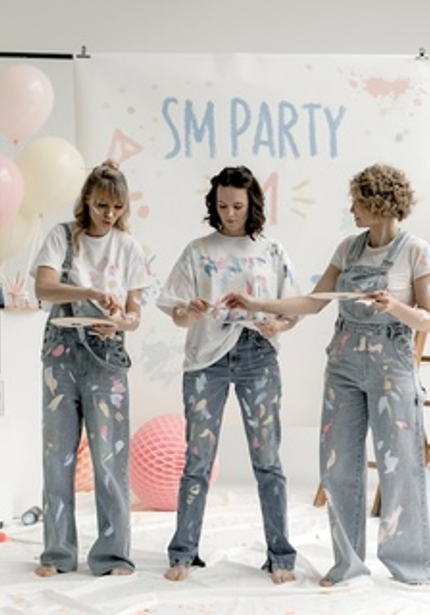 Начали с простых фото в антураже, а потом мы начали декорировать наши футболки и комбинезоны пастельной краской. Получились нежные фото, которые отражают дух SM Party!