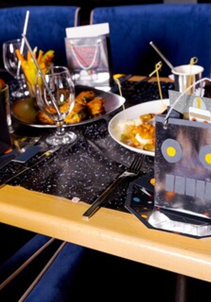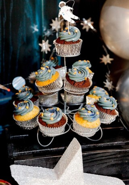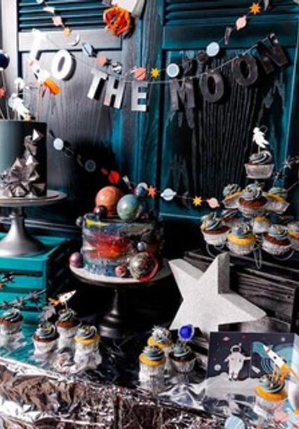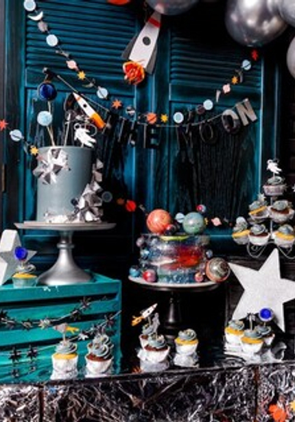 Именинник, гости и семья были одеты по последней космической моде, а угощения поражали воображение! Два шикарных тортика, сладости со стильными топперами, а на главном столе классные черные мини-бургеры.