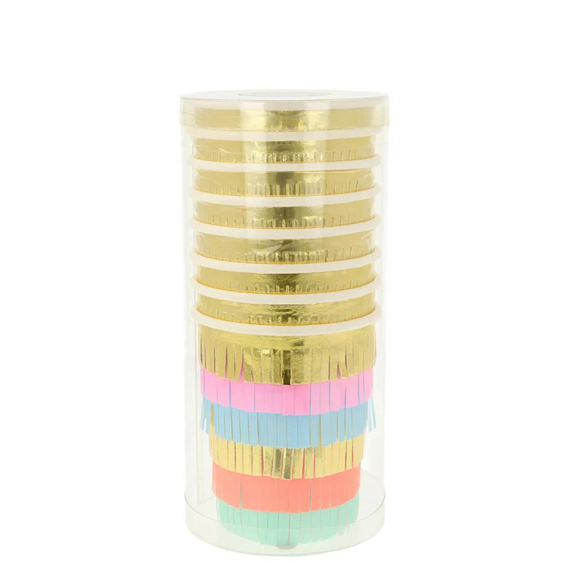 Праздничные стаканчики с золотой бахромой для новогодней сервировки.