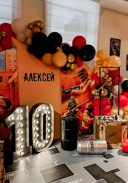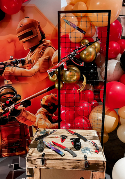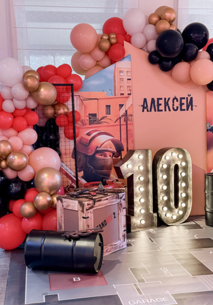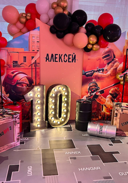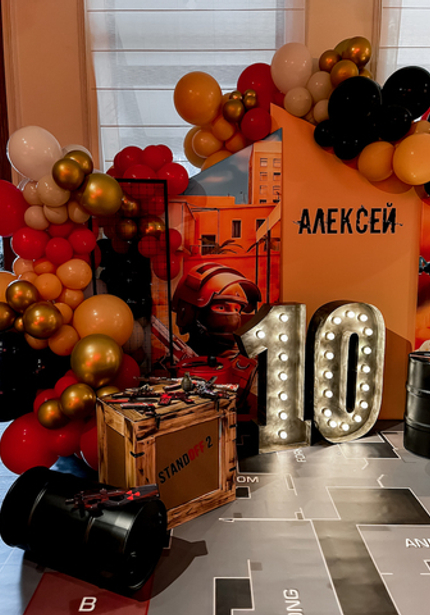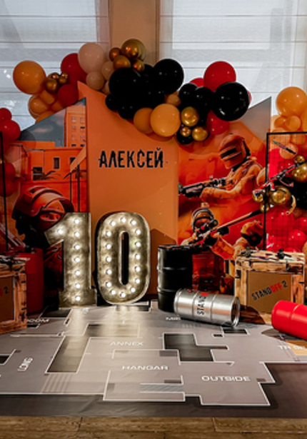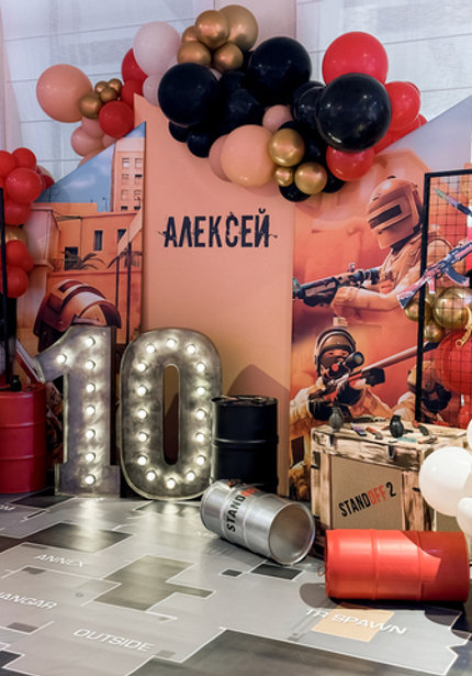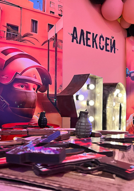 Любые увлечения детей могут стать невероятным и запоминающимся праздником! Например, для Алексея мы оформили крутейший день рождения в стиле его любимого шутера Standoff. Весь декор был разработан с нуля: мы напечатали баннеры со скриншотами игры, пол оформили, как карту, а ещё закупили копии оружия из игры! Наши артисты приехали в аутентичной униформе, что заценил именинник и его друзья.