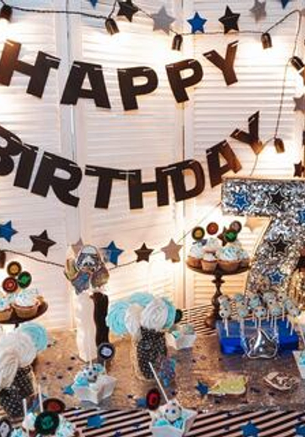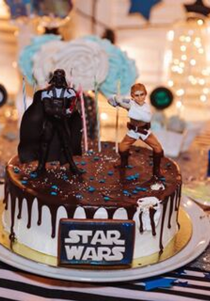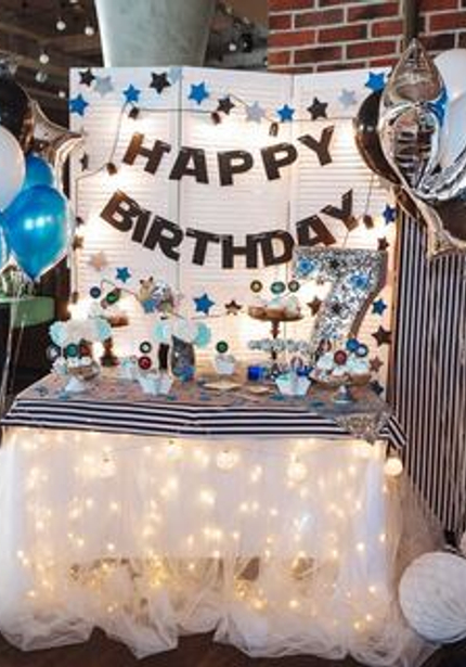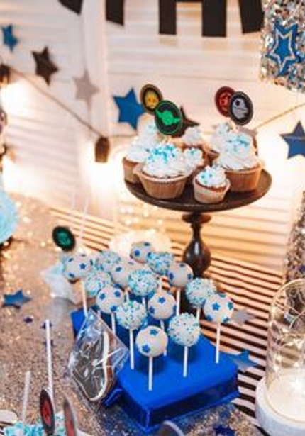 Не угадали, это не мальчишеский день рождения! Наш юный падаван – Настя, и ей исполнилось 7 лет. Возможно, и ваша дочка мечтает размахивать световым мечом и побеждать злодеев. Таня и Женя взялись воплотить тематику «Звездных войн» на этом празднике. Было очень много звезд, серебра и маски штурмовиков! Для Таниных угощений Женя организовала зону сладкого стола: множество огней гирлянд, блестящее конфетти и множество воздушных шаров.