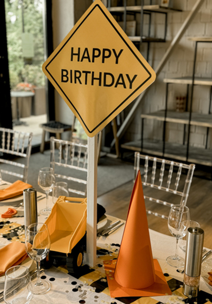 Богдану всего 2 годика, но у него уже есть страсть, по которой мы и создали эту вечеринку, — строительная техника! Началось волшебство с оформления огромной фотозоны, украшенной шарами, оградительными лентами, касками и конусами. Затем мы украсили обеденный зал для взрослых, добавляя тематический декор в сервировку. А потом оформили милую полянку, где обедали малыши — вышло просто чудесно!