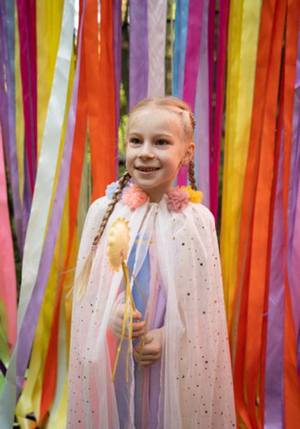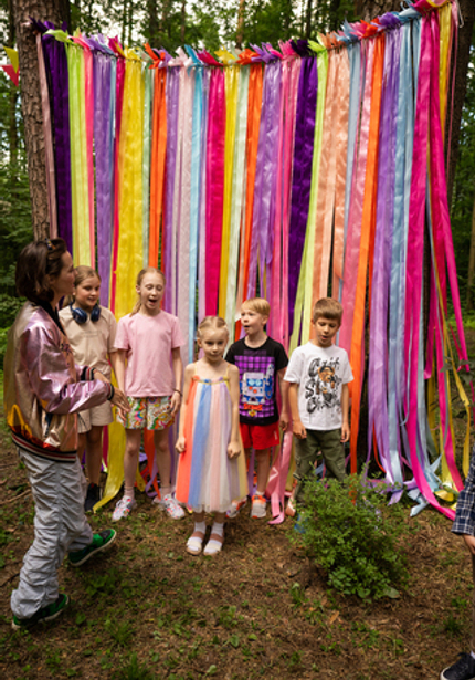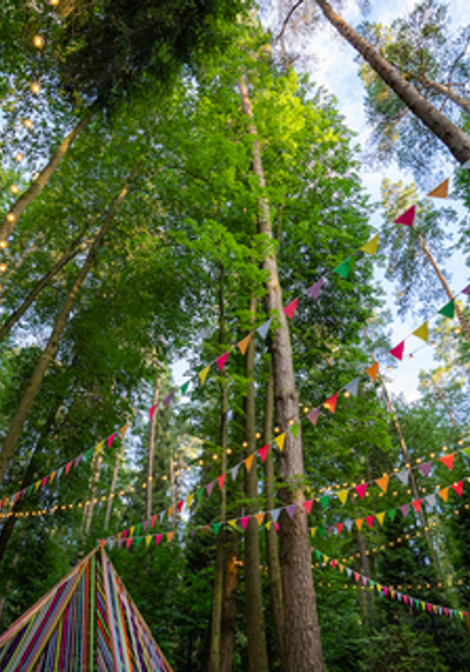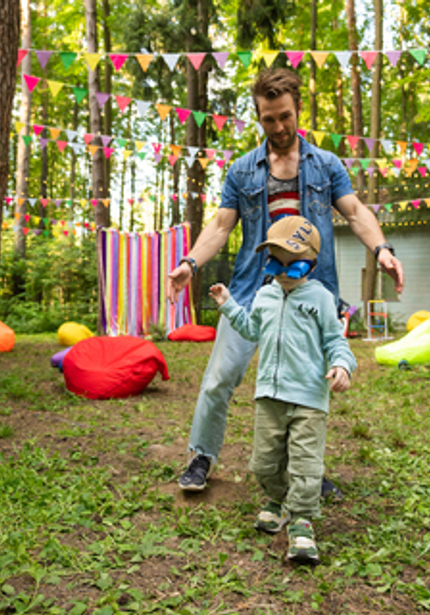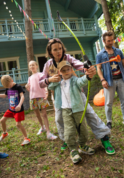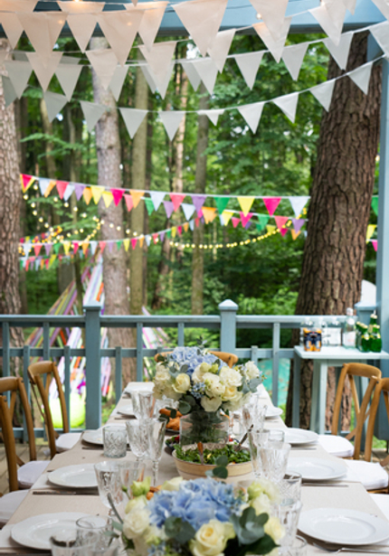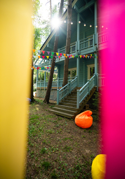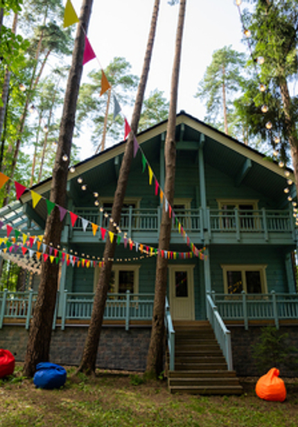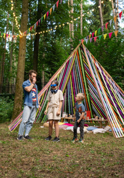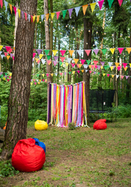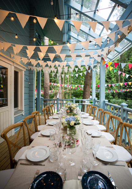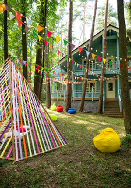 Нежный голубой домик в лесу, а вокруг — наш декор, накрытые столы и море развлечений! Мы уже так привыкли организовывать масштабные мероприятия, что нам всегда хочется украсить вообще всё вокруг. Мы протянули по 100 метров флажков и огоньков, сделали зоны для детей и родителей, продумали анимационную программу так, чтобы никто не скучал. Смотрите, что из этого вышло!