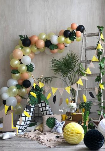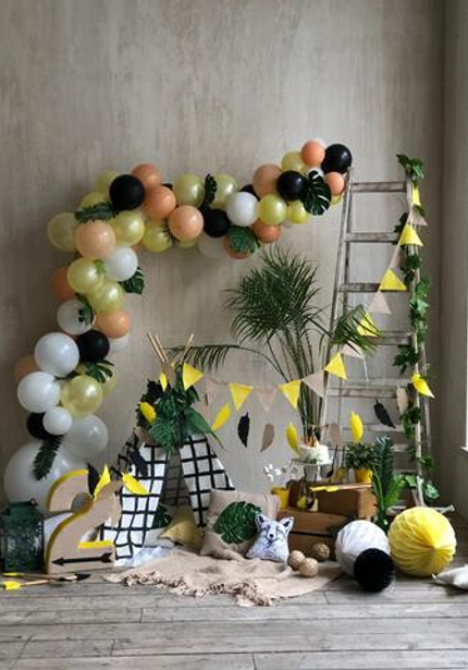 Помимо стола со сладостями на каждом празднике должен быть стильный уголок для запоминающихся фото. Эта идея вдохновит вас на создание тропической вечеринки в любо время года! Побольше воздушных шаров и пальмовых листьев – залог успеха. А если добавить сюда уютный вигвам с пледом и подушками, то малыши не захотят уходить за стол и согласятся попробовать торт только здесь!
