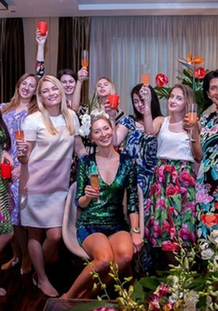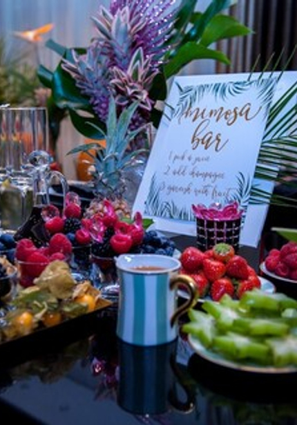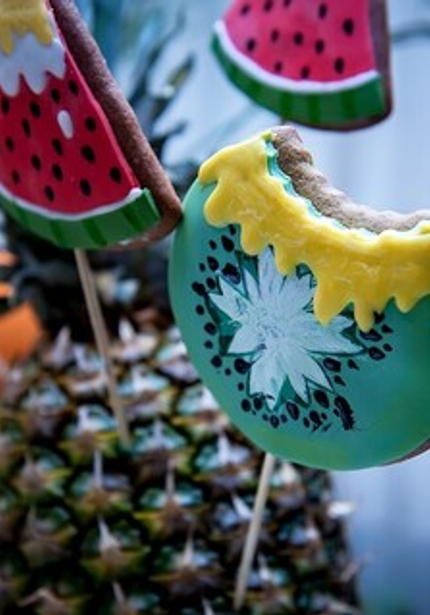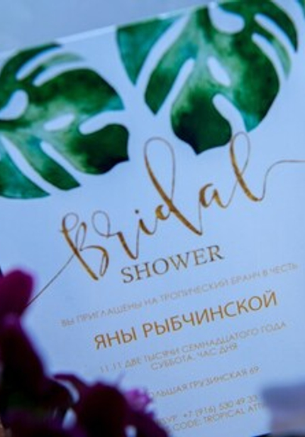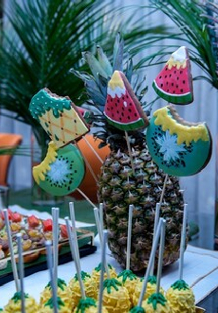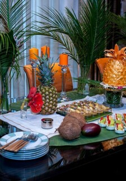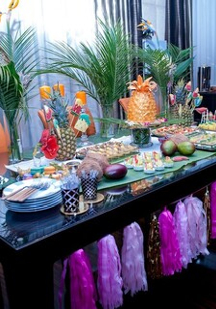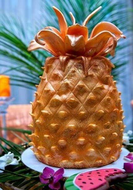 Наш ответ зимним холодам – это тропические вечеринки! В этот раз поводом стала свадебная вечеринка прекрасной невесты Яны. На праздничном столе было море свежих фруктов и не меньше кондитерских изысков от Тани. Тут и печенье, и капкейки – все во фруктовой тематике. В центре стоял великолепный золотой торт-ананас. Еще больше тропической атмосферы добавляли пальмовые зеленые листья и свежие орхидеи.