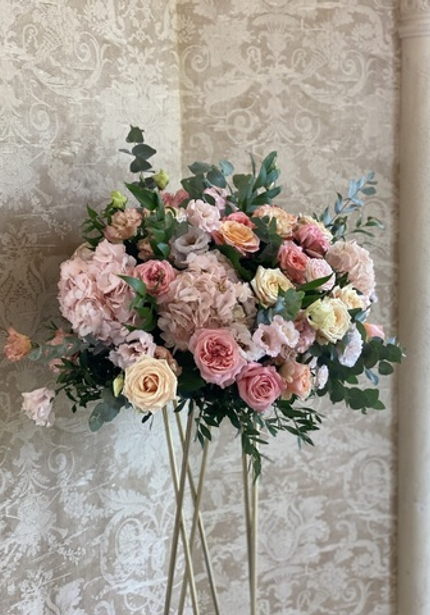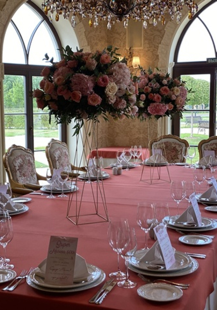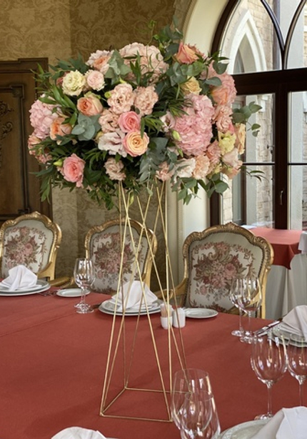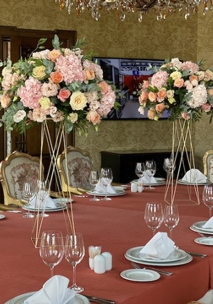 Иногда мы делаем совсем небольшие проекты — например, это флористическое оформление. Мы выполнили его в ресторане, где проходил юбилей. Композиции на изящных золотых подставках были расставлены на столах и по периметру помещения, добавив изысканности в уже имеющийся интерьер.