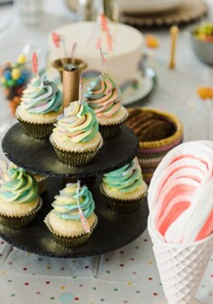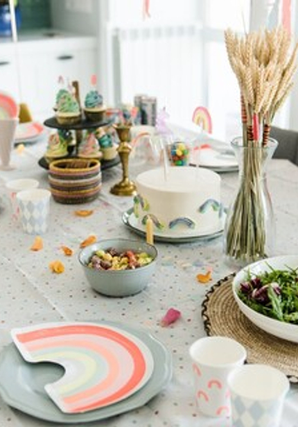Мама Женя сама придумала и оформила вечеринку в честь дня рождения дочки. Среди сказочных радужных десертов на столе засветилась коллекция Rainbow Party: разноцветные топперы, стаканчики и тарелки в виде радуги. Женя придумала классное панно из гофрированной бумаги и фотозону с шарами и стеблями роз, которые украшали стену.