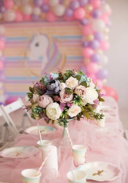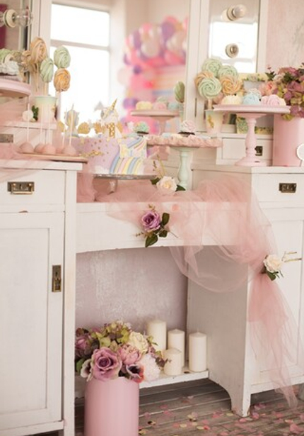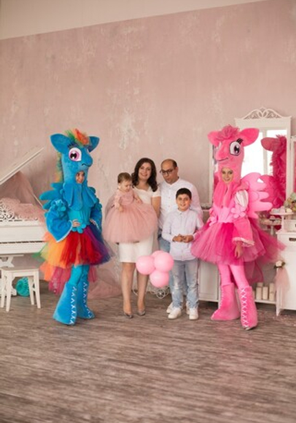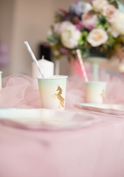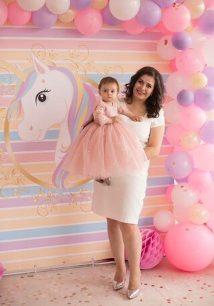 Нежный праздник в пастельных тонах, но с обилием розового – это то, что нужно любой девочке! Первый день рождения малышки Вики прошел в окружении огромного количества роз, сладостей и единорогов. Именинницы была в платье, достойном настоящей принцессы, а оформление ее «замка» не оставило гостей равнодушным. Розовая скатерть из пышного фатина, букеты свежих цветов, посуда с единорогами и самые изысканные угощения! Среди всех сладостей выделялся очень милый детский тортик, украшенный фигуркой единорога и радугой из мастики.