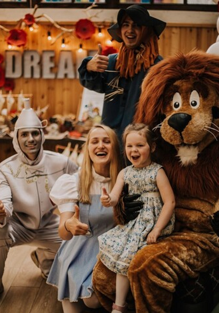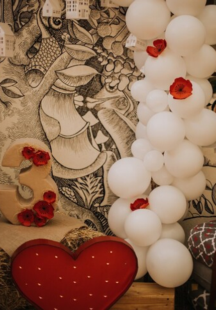 Фотозона тоже была украшена маками, которые перекликались с алым сердцем-ночником, напоминающем о Железном Дровосеке. Тематическая циферка расположилась на тюке сена, который будто только что принесли с фермы в Канзасе!