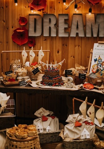 Волшебная сказка на дне рождения — мечта любого ребенка! Женя создала волшебный, удивительный декор для трехлетия Маруси в стиле «Волшебника Изумрудного Города». Тут распускались волшебные красные маки, а на столе гостей ждали сладкие угощения: большой торт со свежими ягодами и милым самодельным топпером, попкорн в ведерках и десерты в стаканчиках. В кувшине был напиток, исполняющий желания, а в холщовых мешочках ожидали своих хозяев подарки для гостей.