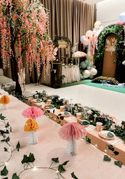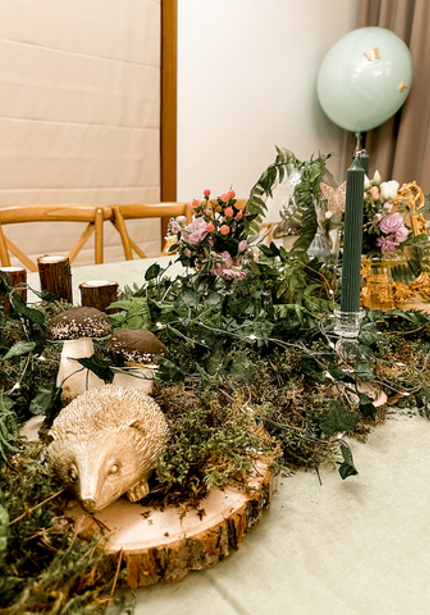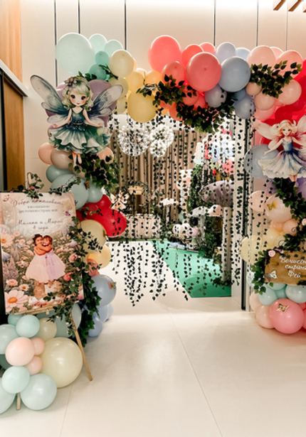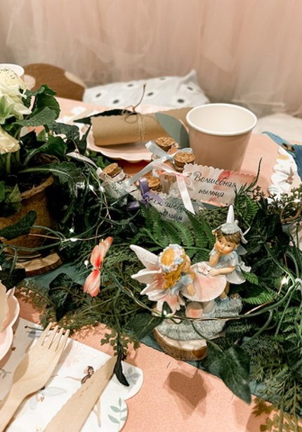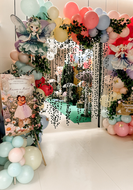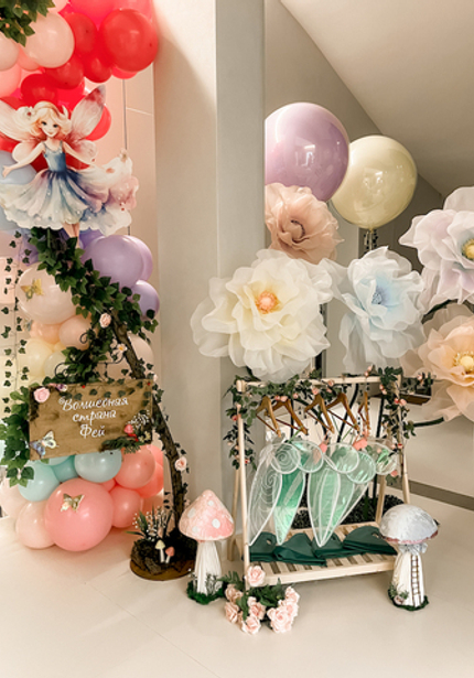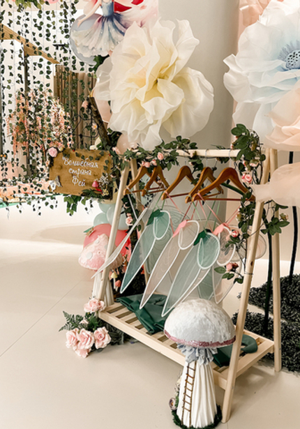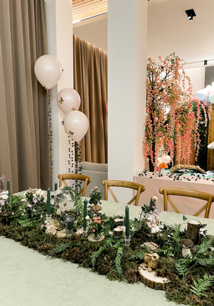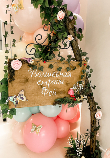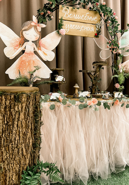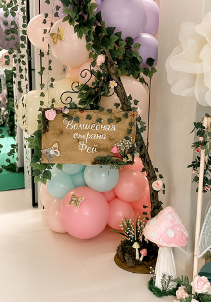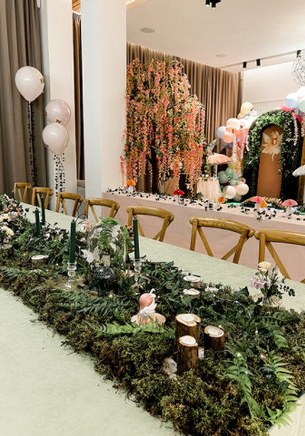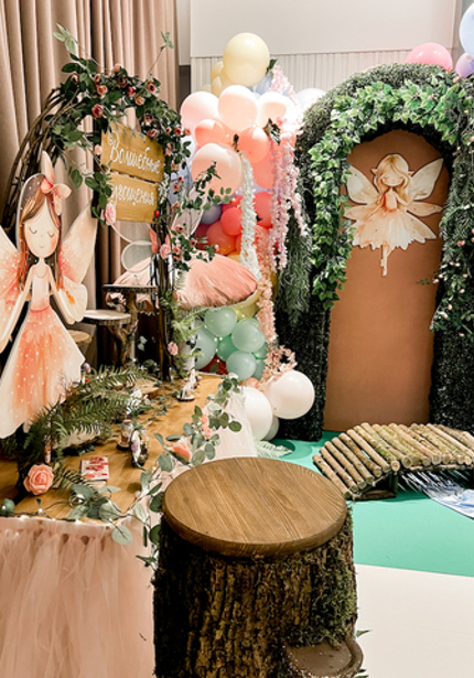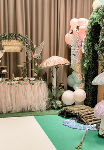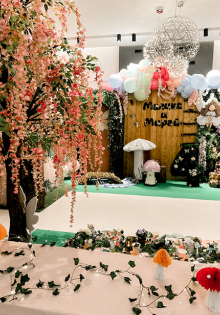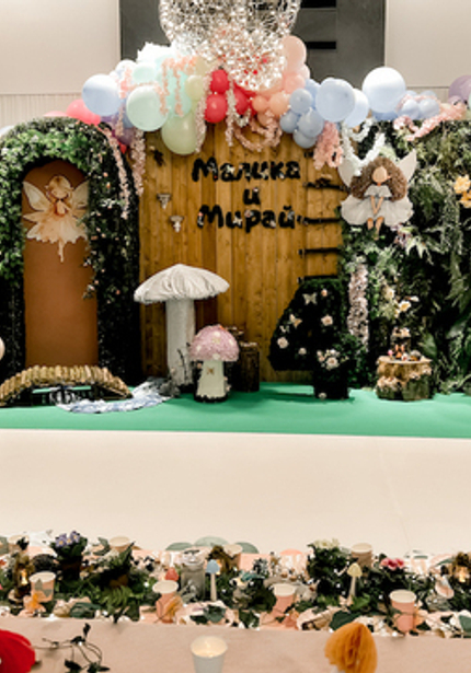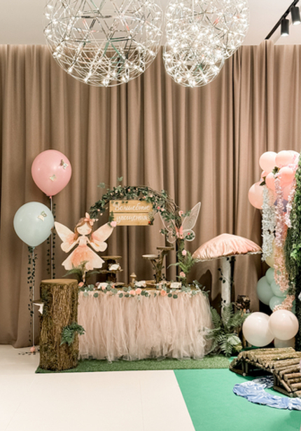 Один из самых невероятных праздников, что мы делали! Тут столько деталей, что даже несколько десятков фото не передадут масштабов праздника. Например, длинный обеденный стол мы украсили живым мхом и волшебными огоньками. Пройдя сквозь занавес листьев, гости попадали в настоящую страну фей, где всюду были цветы и огромные грибы! В фотозоне «текла» речка, а под потолком парили воздушные шары.