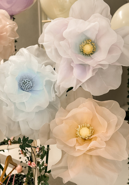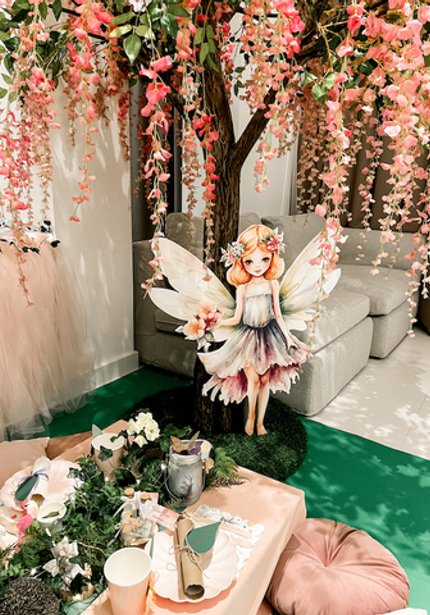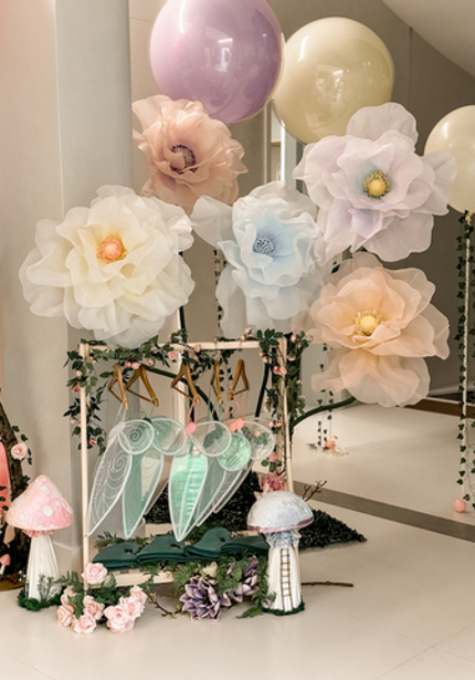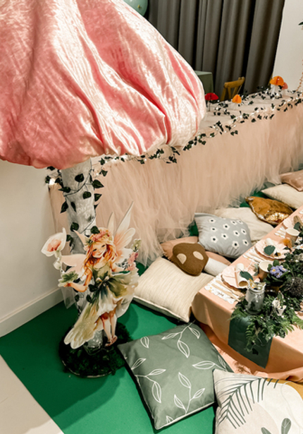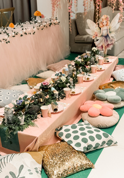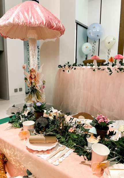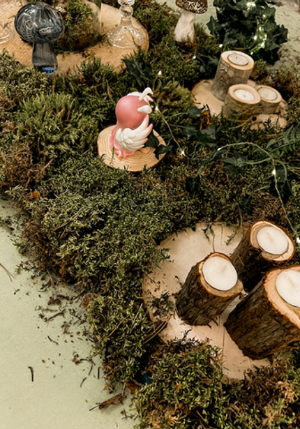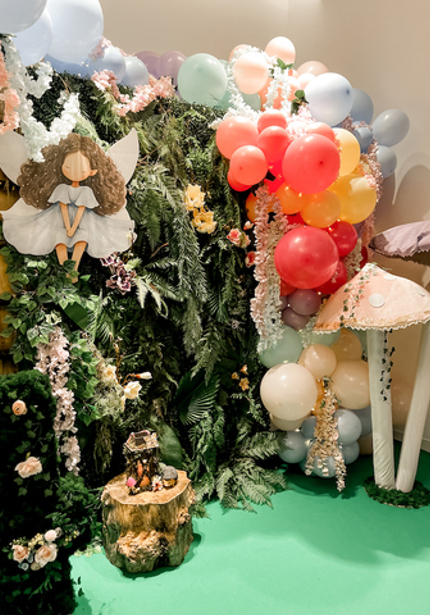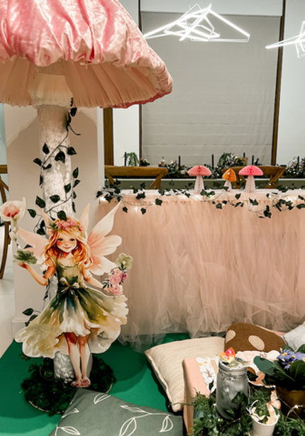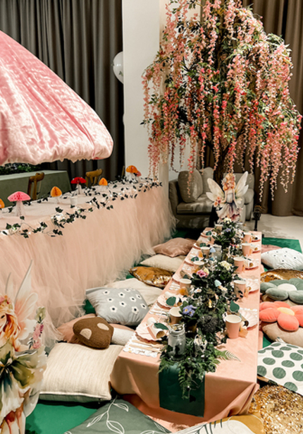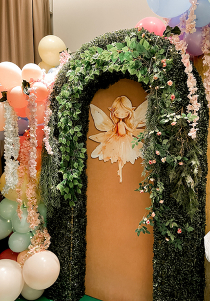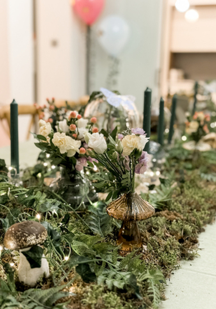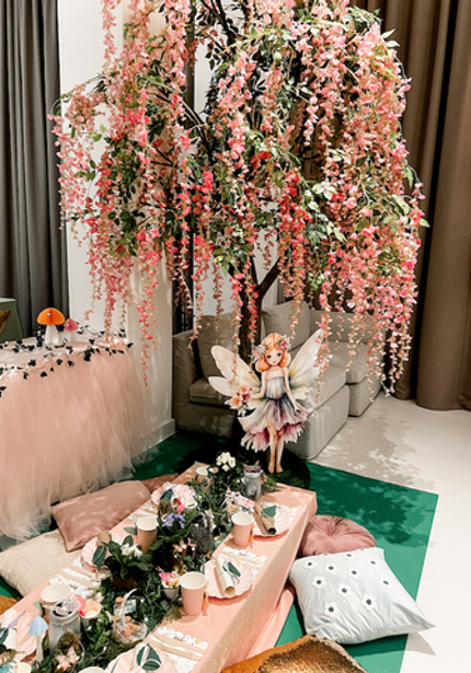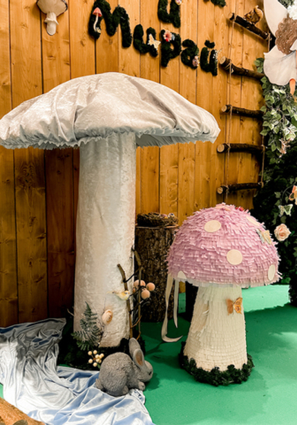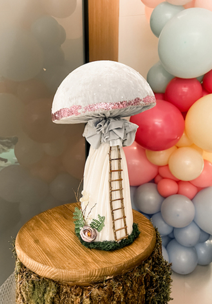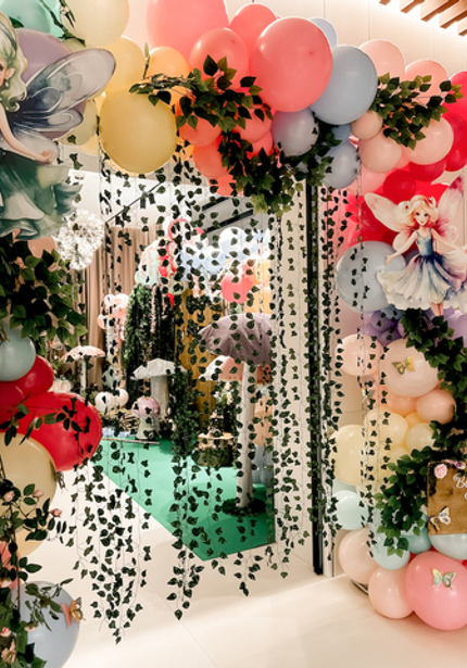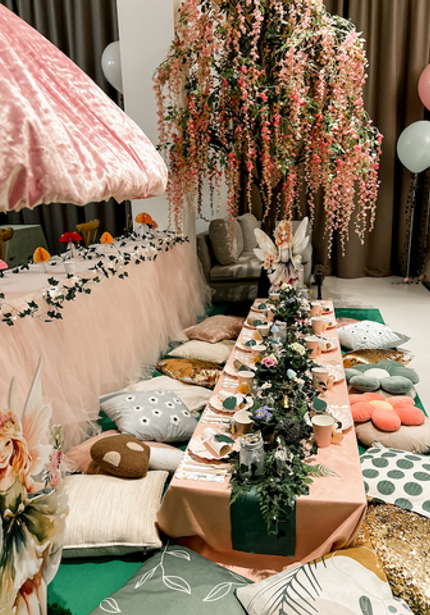Один из самых невероятных праздников, что мы делали! Тут столько деталей, что даже несколько десятков фото не передадут масштабов праздника. Например, длинный обеденный стол мы украсили живым мхом и волшебными огоньками. Пройдя сквозь занавес листьев, гости попадали в настоящую страну фей, где всюду были цветы и огромные грибы! В фотозоне «текла» речка, а под потолком парили воздушные шары.