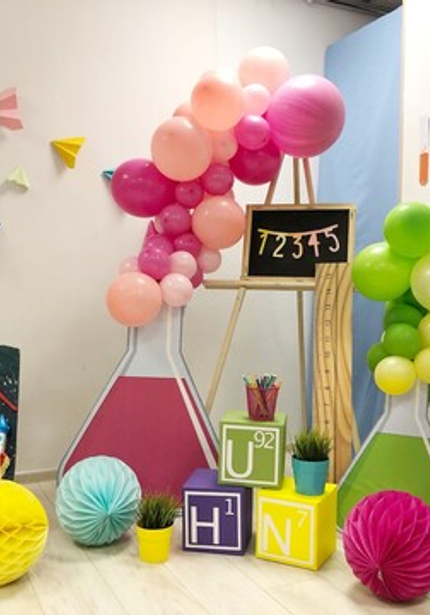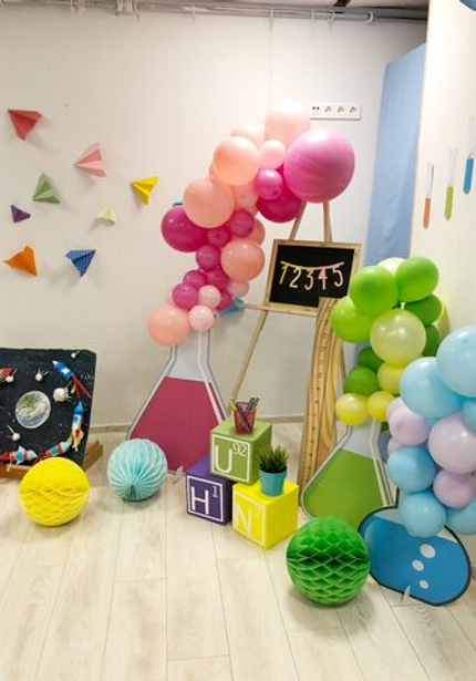 Даешь тематический декор абсолютно на всех праздниках! На выпускной Егора из садика Женя оформила яркий фотоуголок с элементами, напоминающими о разных сферах знания: химически колбы, математическая доска, кубики с алфавитом и плакат о космосе.