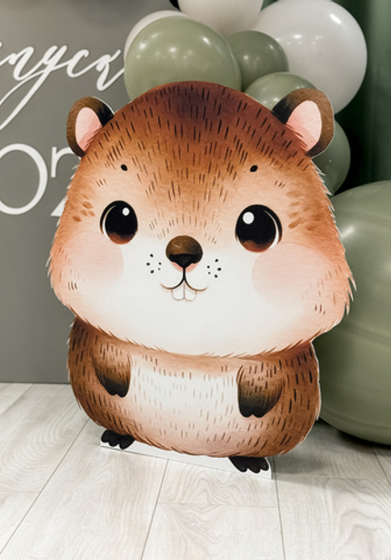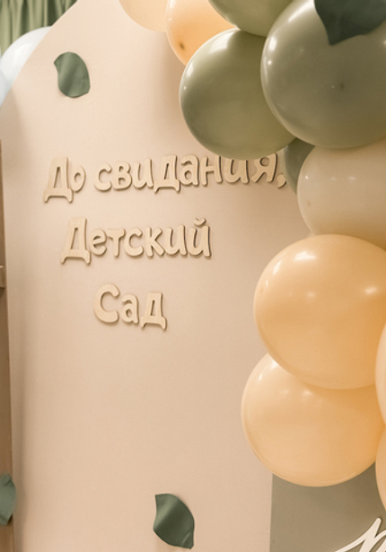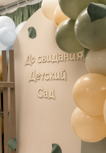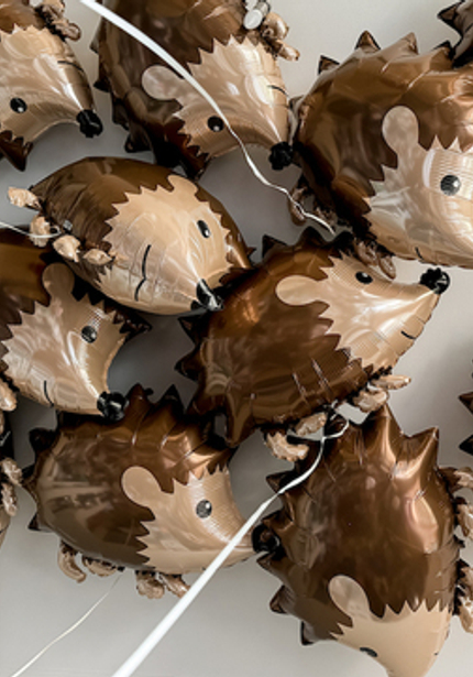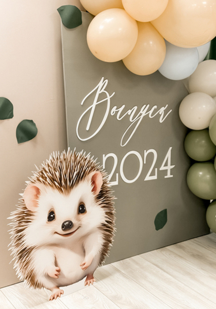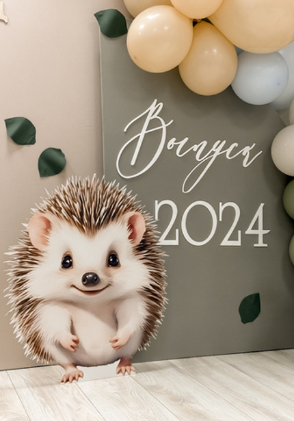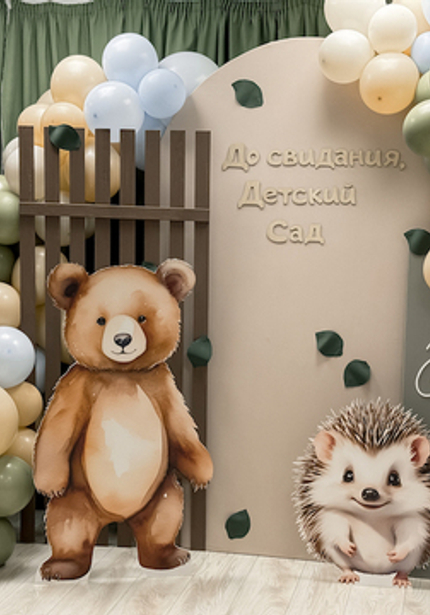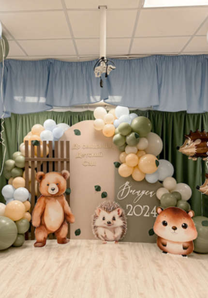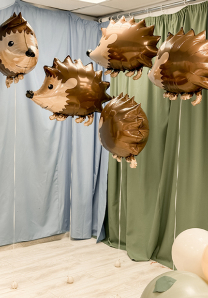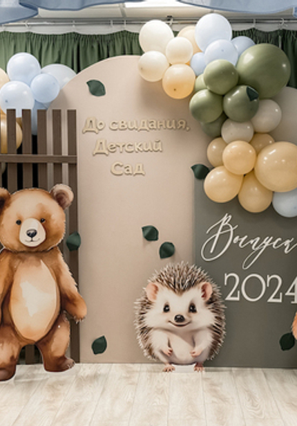 Мы выполняем разные оформления, например, мероприятия в детских садах: дни рождения и выпускные. Садик называется «Ежата», поэтому мы выбрали лесную тематику, добавив в фотозону зверушек и множество шариков с ежатами!