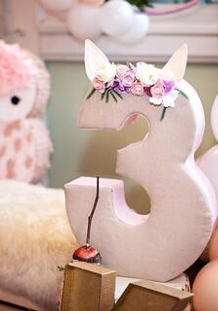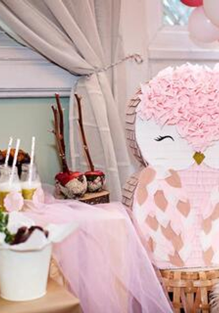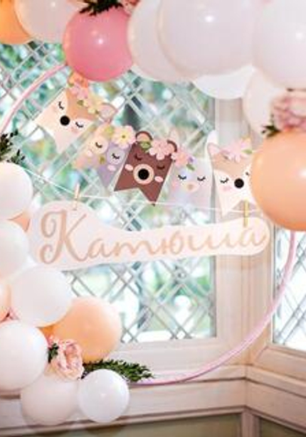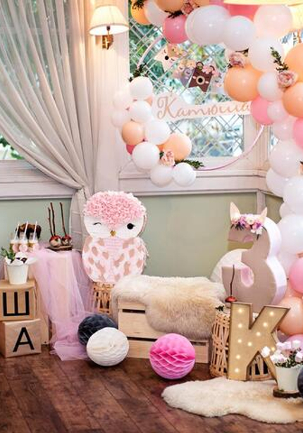 Женя — настоящий мастер чудес, на этот раз она создала маленький волшебный лес для именинницы Катюши. Уютный фотоуголок с пышной гирляндой из шаров белого, персикового и розового цветов дополняла красивая композиция с живыми цветами и забавными флажками-зверушками. Здесь притаилась розовая пушистая сова, а на деревянном ящике, устланном фатином, расположились сладости: напитки в золотых бутылочках, сладкие яблоки, нанизанные на ветки и маффины. Женя сделала кубики с именем именинницы, тематическую циферку 3 и уютный светильник в виде первой буквы ее имени.