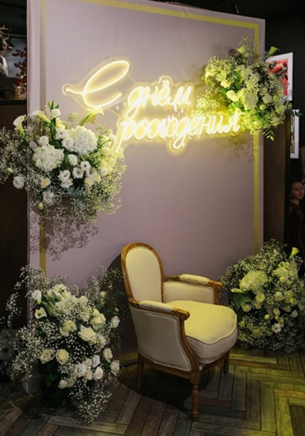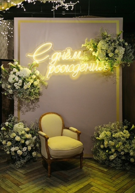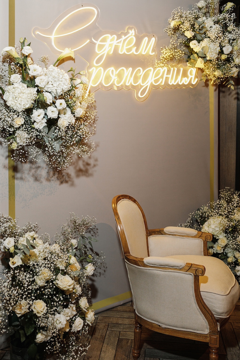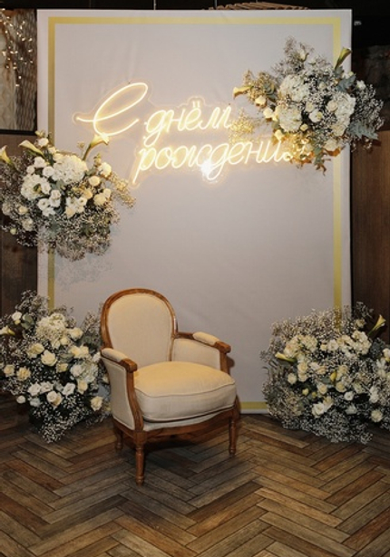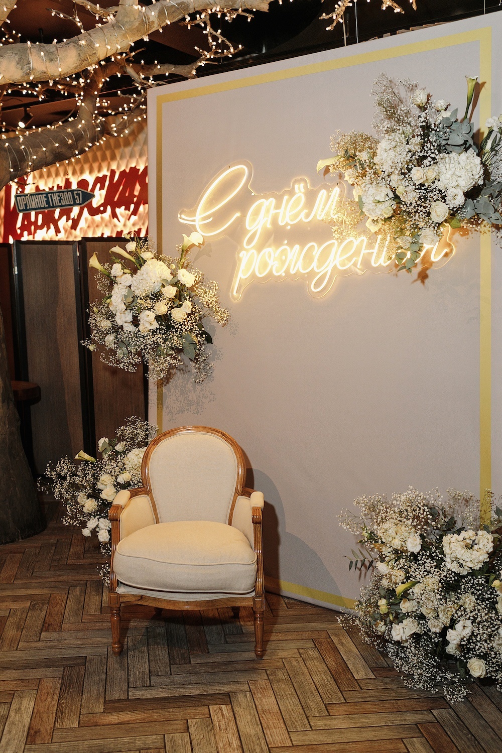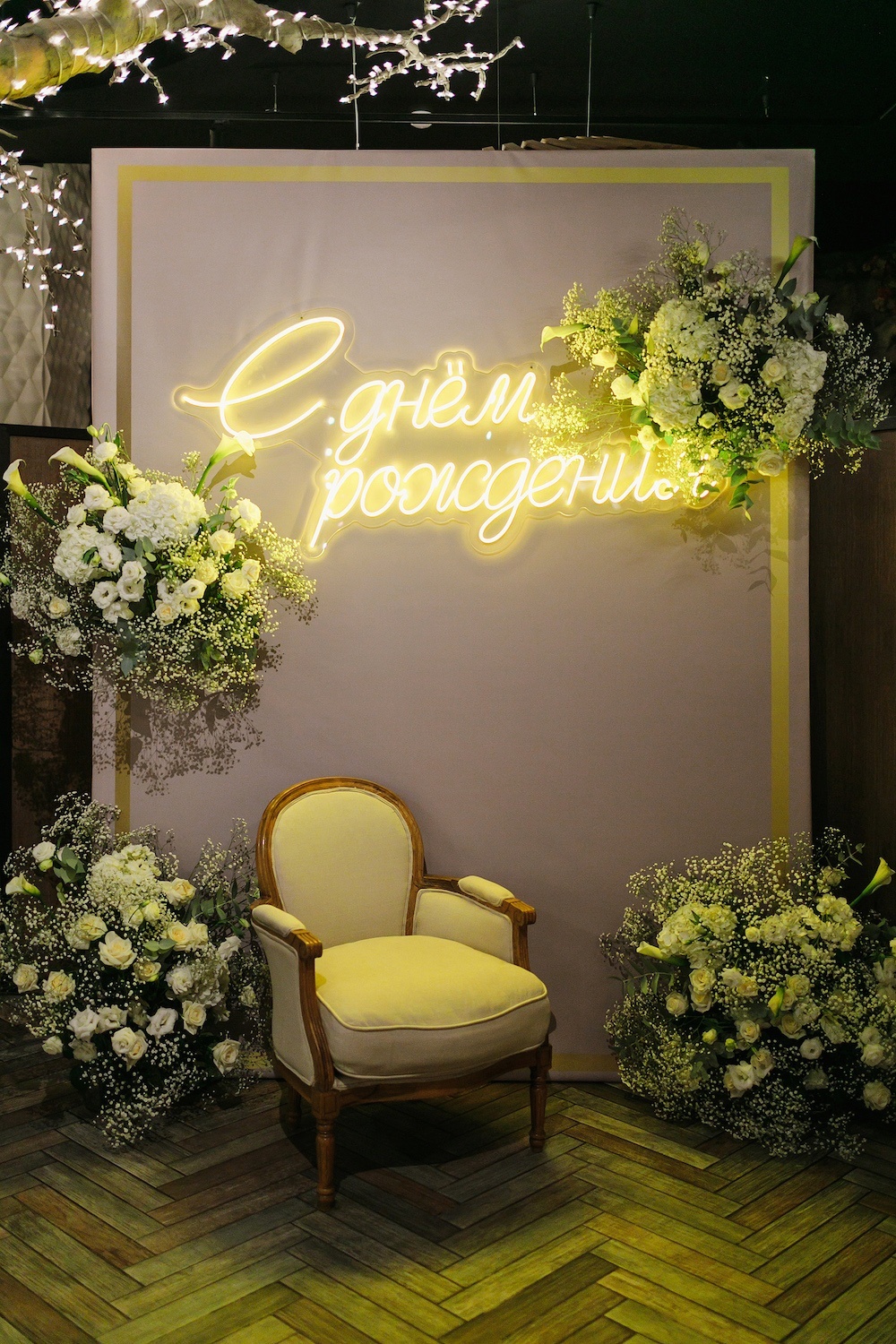 Мы подстраиваемся под любую площадку — например, этот праздник мы оформляли в ресторане Кавказская пленница. Мы сделали красивую фотозону на входе: с креслом, неоновой вывеской и букетами белых цветов. В зале мы занялись красивой сервировкой и анимационной программой для детей, чтобы взрослые могли спокойно отдохнуть.