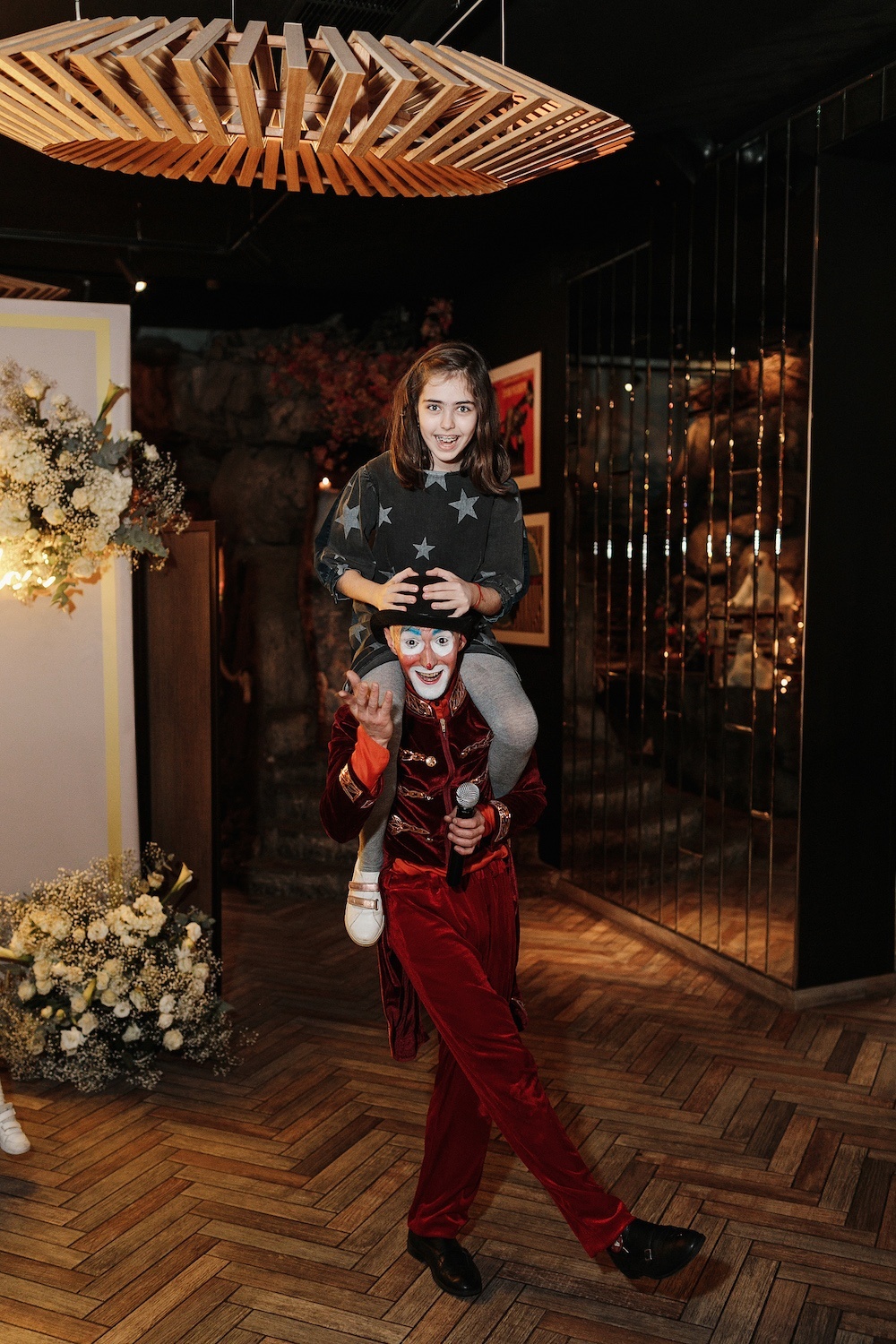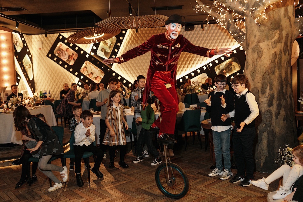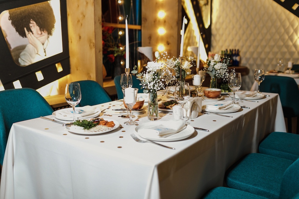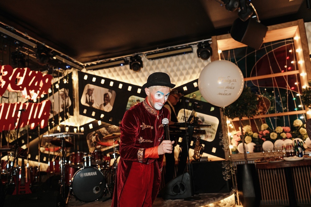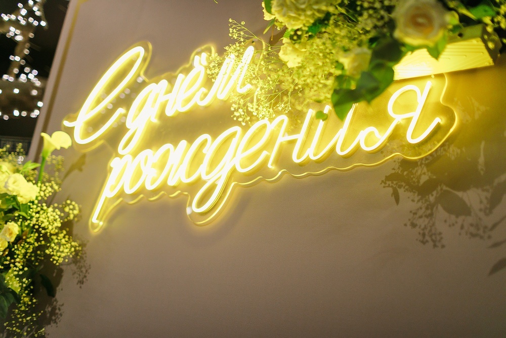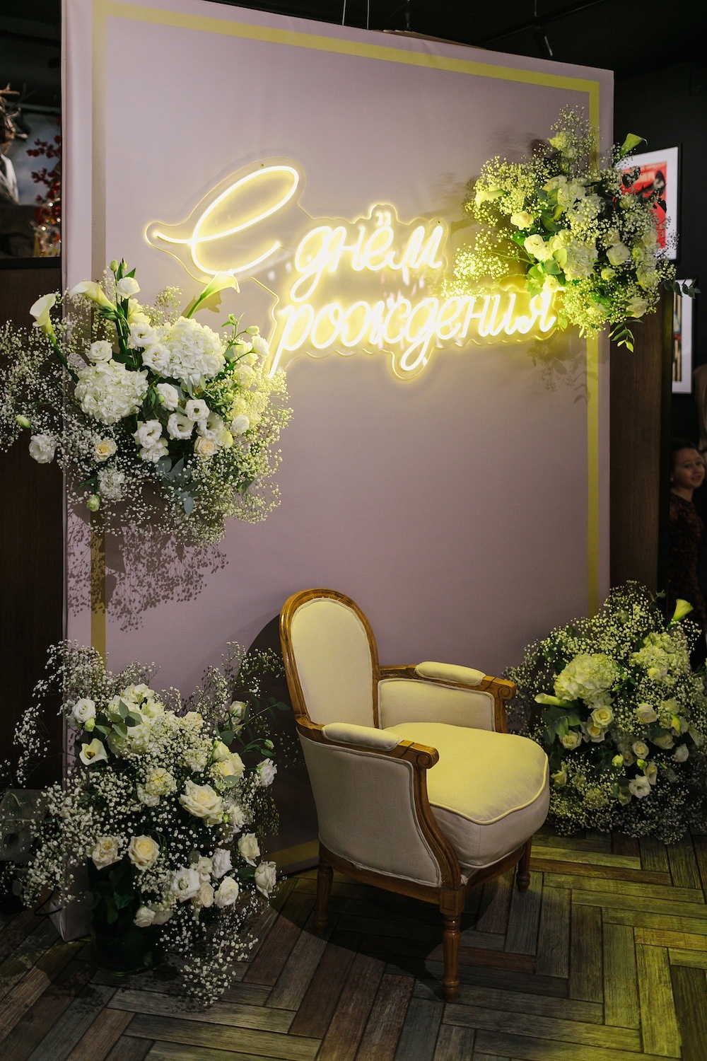 Мы подстраиваемся под любую площадку — например, этот праздник мы оформляли в ресторане Кавказская пленница. Мы сделали красивую фотозону на входе: с креслом, неоновой вывеской и букетами белых цветов. В зале мы занялись красивой сервировкой и анимационной программой для детей, чтобы взрослые могли спокойно отдохнуть.
